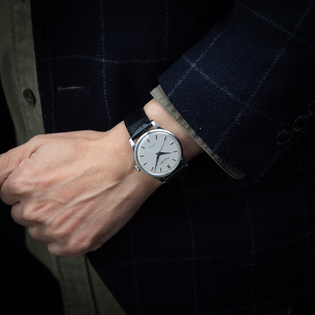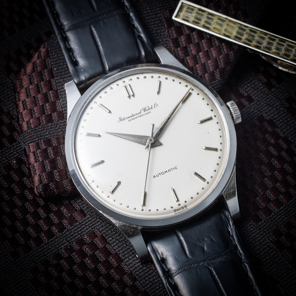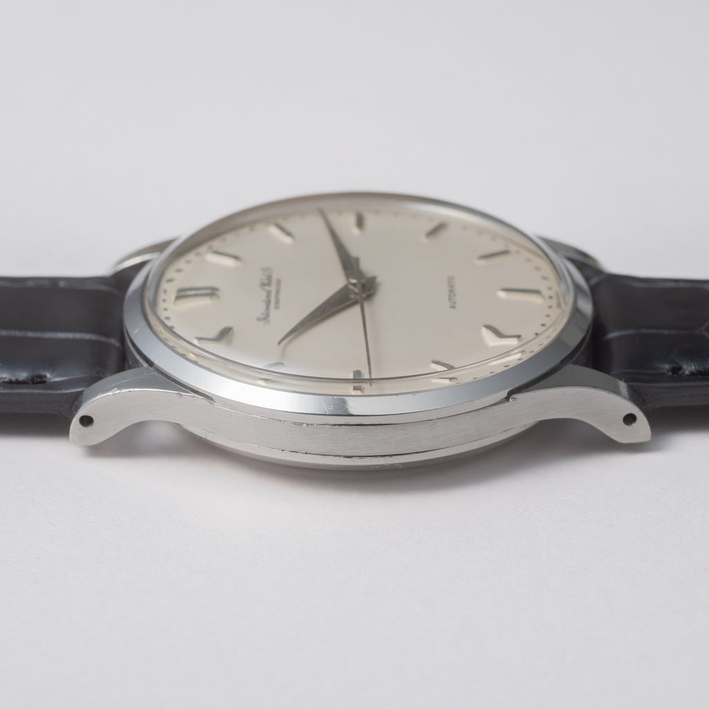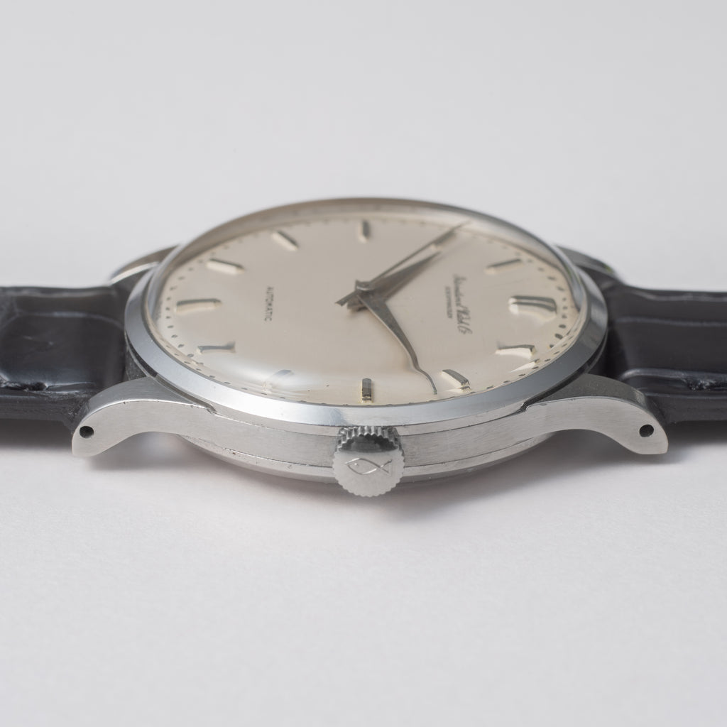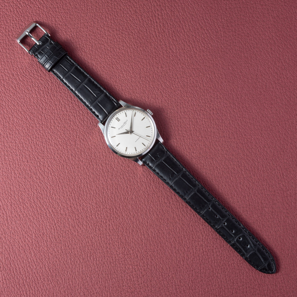 IWC ラウンドケース 1965年製 ペラトン式自動巻き Cal.853 オールドインターです。シンプルだからこそ造りの良さが感じられる文字盤上のドーフィンハンド、パールドット、砲弾インデックスが魅力的な1本になります。オリジナルダイヤルはシミ等無く綺麗です。ケースは小傷が見られますが大きなダメージはありません。ムーブメントはペラトン式自動巻きノンデイトのCal.853を搭載しています。手巻きや針回しの操作はスムースです。ベルトはファイアーキッズオリジナルクロコダイルが取り付けられています。こちらの時計は分解掃除済みです。