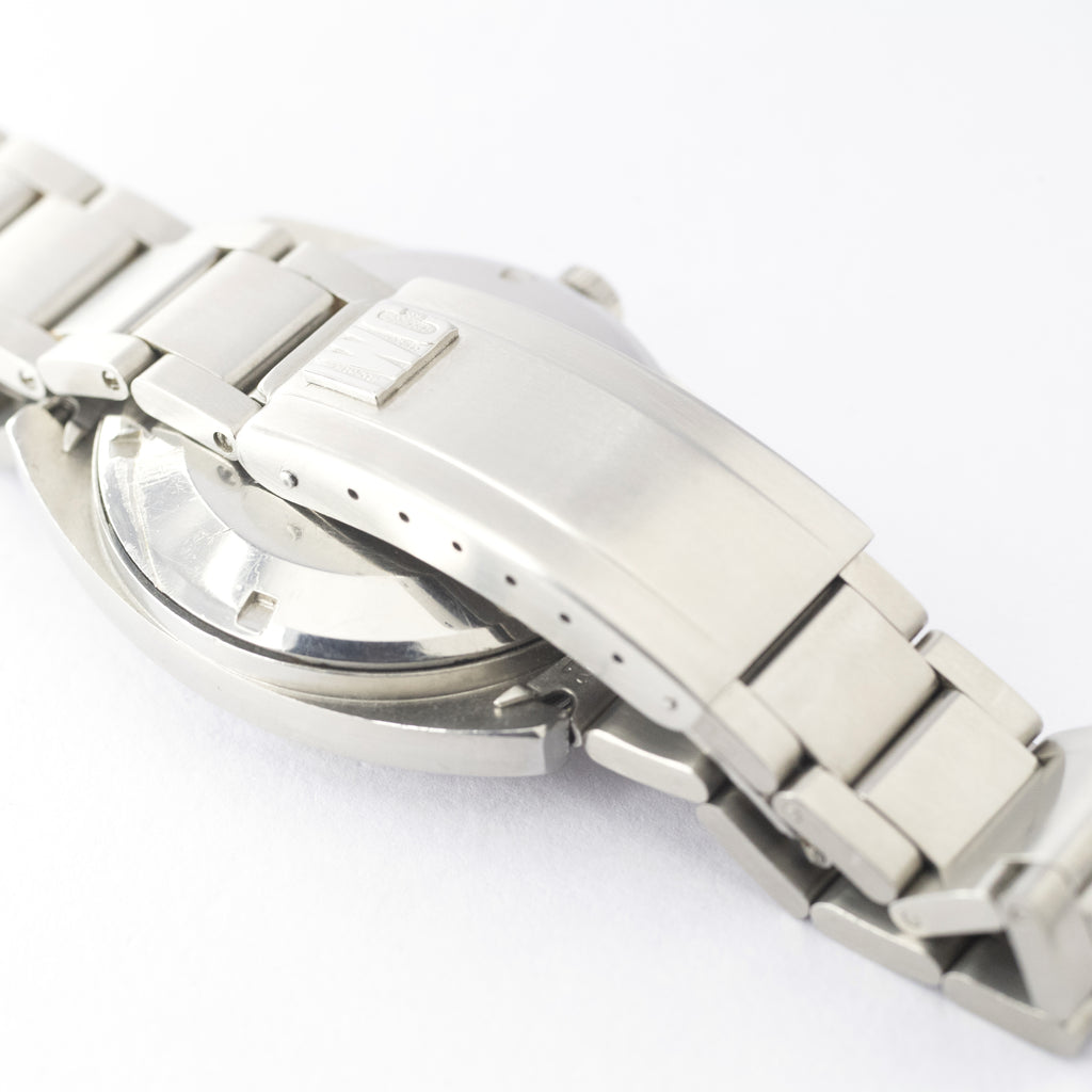 1971年製のIWC TVスクリーン ブルーダイヤル オートマチックモデルです。 現存している多くはシルバー系の文字盤で、その理由はカラー文字盤は長く時間が経過したことによる変化、且つ剥がれやダメージが強く目立つためです。今回のように全体的に良好な状態は今後ますます探しにくくなるものと思われます。ブレスもIWCではとても珍しい部類の3連タイプで、ロレックスでも馴染みのあるデザインです。シンプルで着けやすく、好みが分かれにくいベルトなので、このベルトだけでも十分価値を感じていただけるかと思います。ムーブメントは代表的なCal.8541Bを搭載。5姿勢差調整が可能で、ローターでの巻き上げ時に負担がかかる切替車を使用しないペラトン式を採用。IWCのアイコニックなムーブメントとして認知度が高いです。