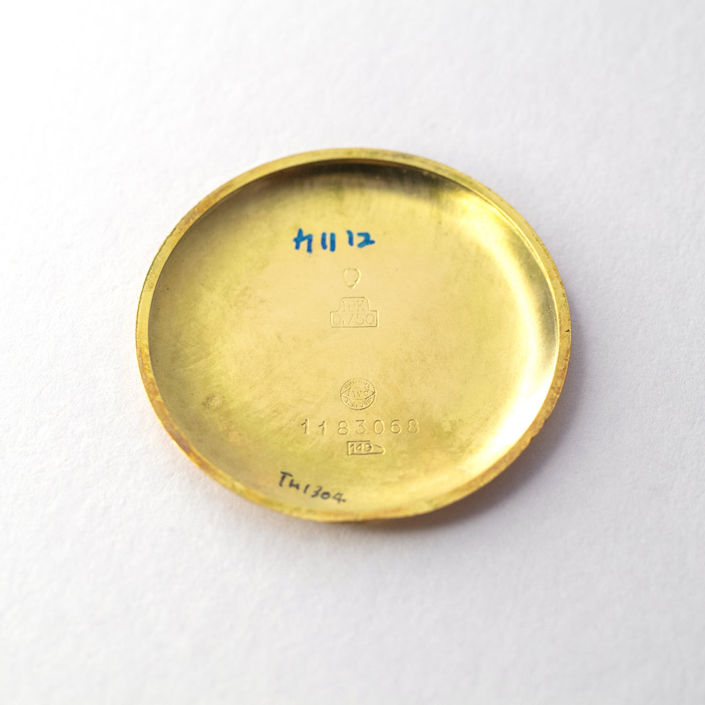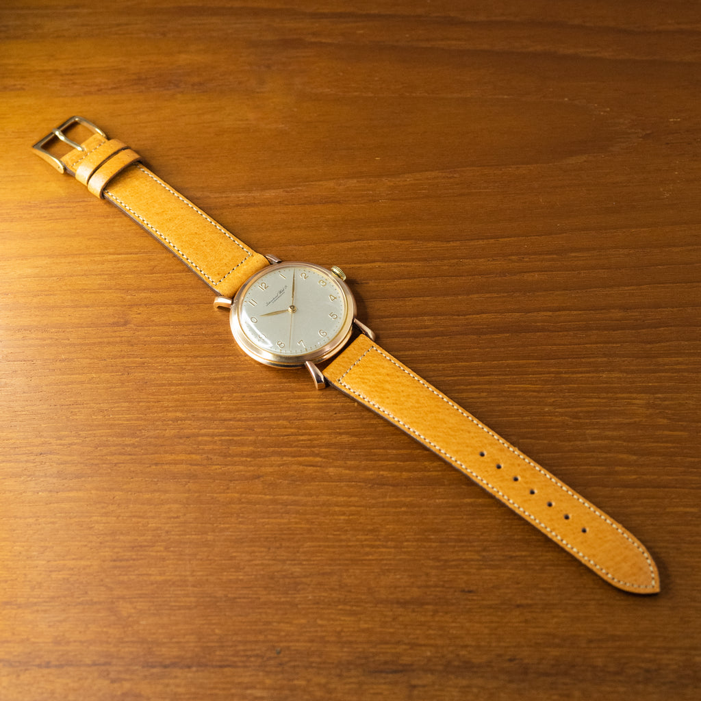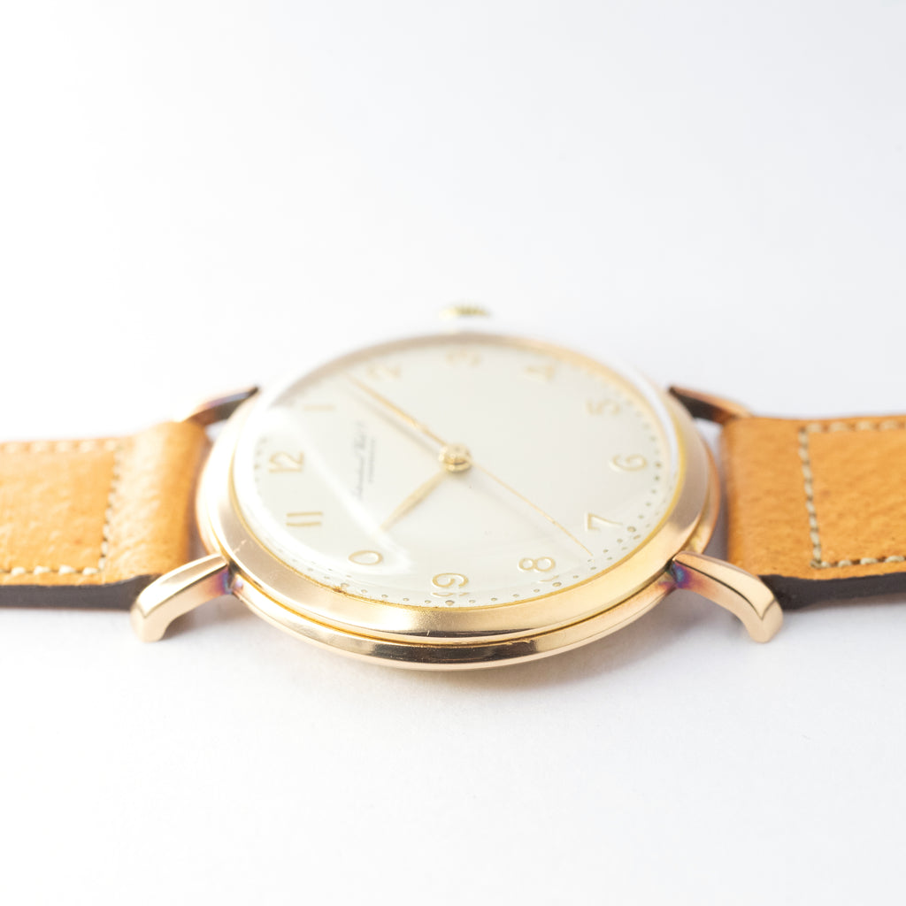 インターナショナルウォッチカンパニーの1950年製18金無垢ケースCal.89搭載モデルです。エンボスしたアラビア数字とリーフハンドの組み合わせで、外周のパールドットが高級感があります。この年代では大ぶりな幅約37mmの18金無垢ケースは迫力があります。文字盤表面には経年劣化が見られますが大きなダメージはありません。ケースも小キズが見られますが大きなダメージはありません。ムーブメントは流石インターという仕上がりで非常に綺麗です。ヴィンテージモデルに相性抜群な「Accurate Form(アキュレイトフォルム)」のレザーベルトを装着しています。