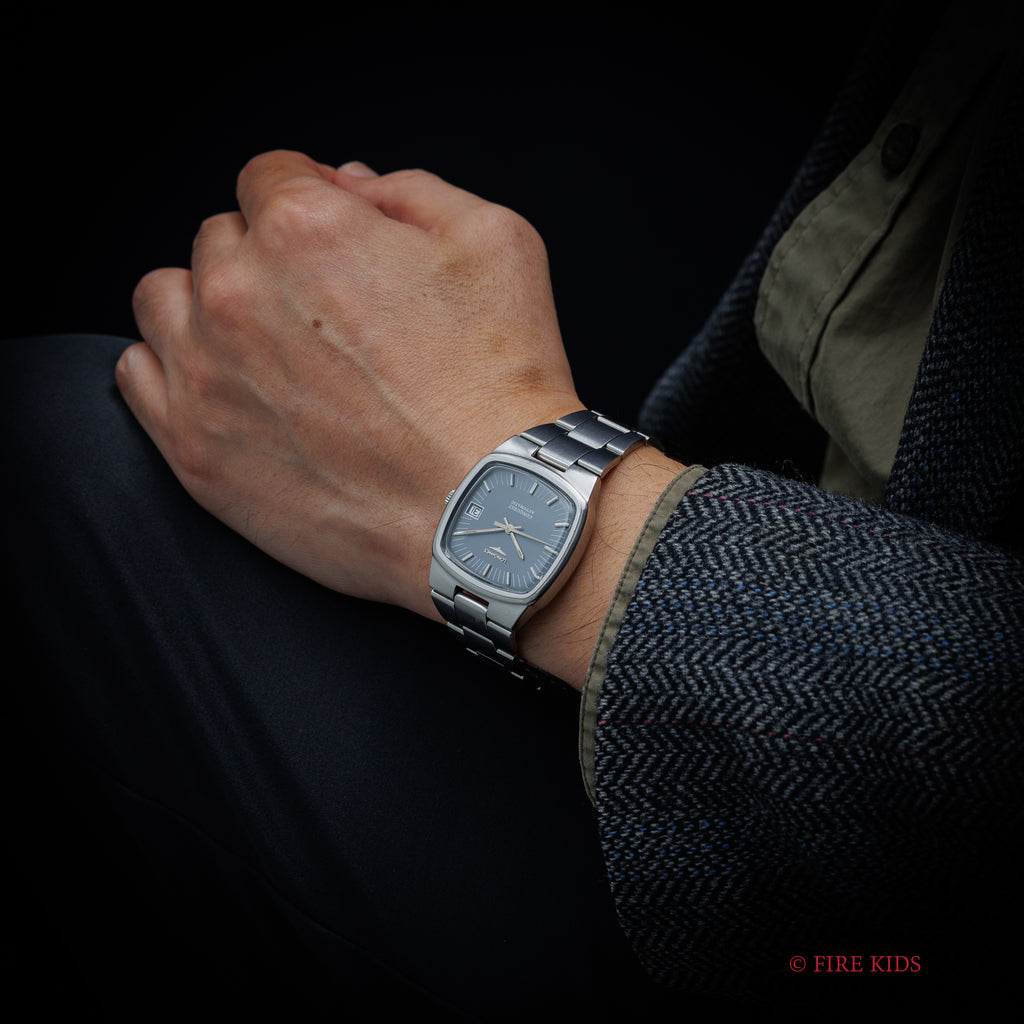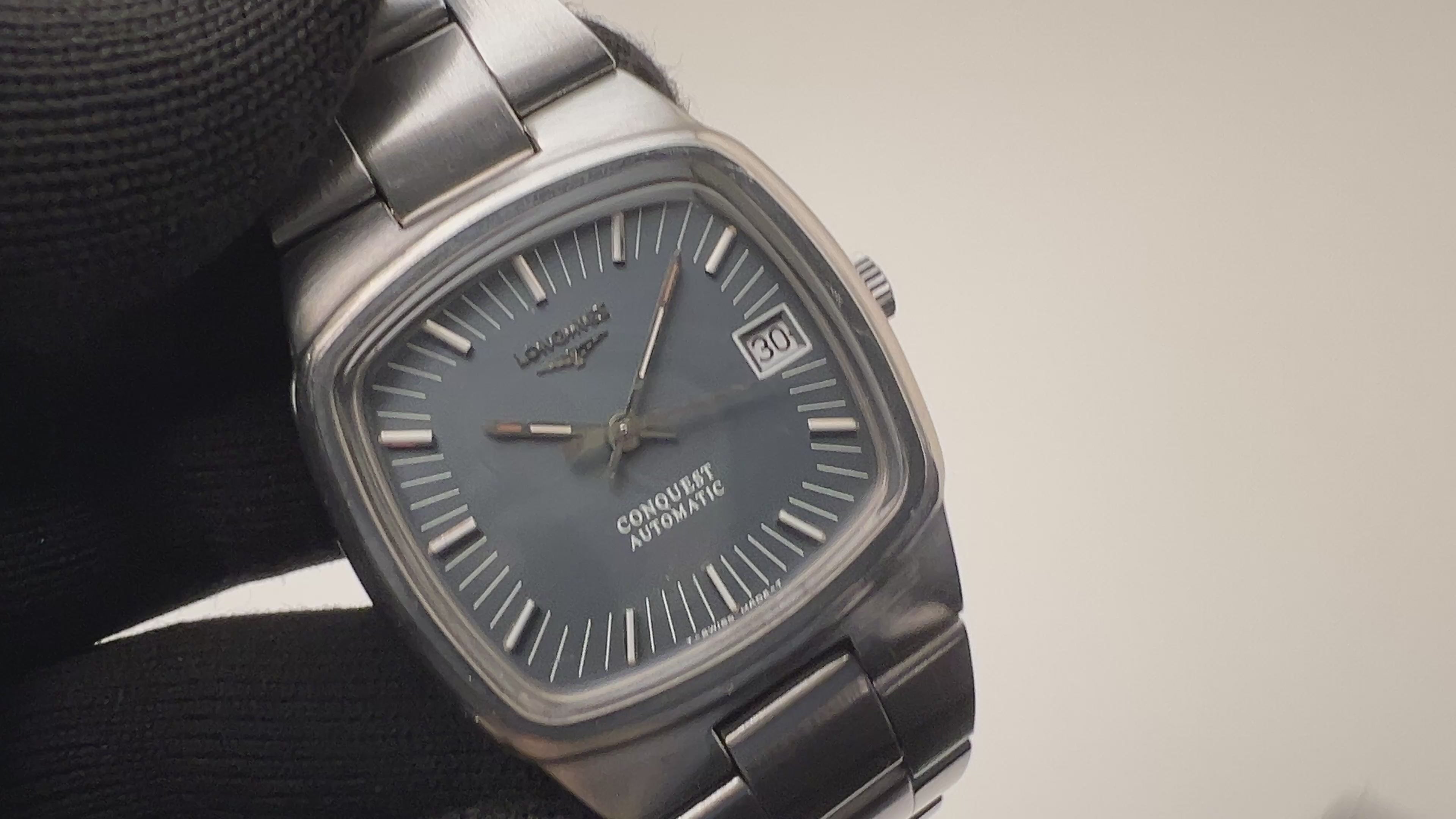 ロンジン コンクエスト TVスクリーン型 1970年代製 10振動自動巻 Cal.431 純正ブレスの入荷になります。ロンジンのフラッグシップモデル「コンクエスト」のハイビート36000自動巻です。70年代らしいTVスクリーン型のケースにステンレスブレスと近未来的なデザインになっています。文字盤はシミ等無く綺麗です。ケースは小傷が見られますが大きなダメージはありません。ムーブメントは自動巻10振動のCal.431を搭載しています。こちらの時計は分解掃除済みです。
