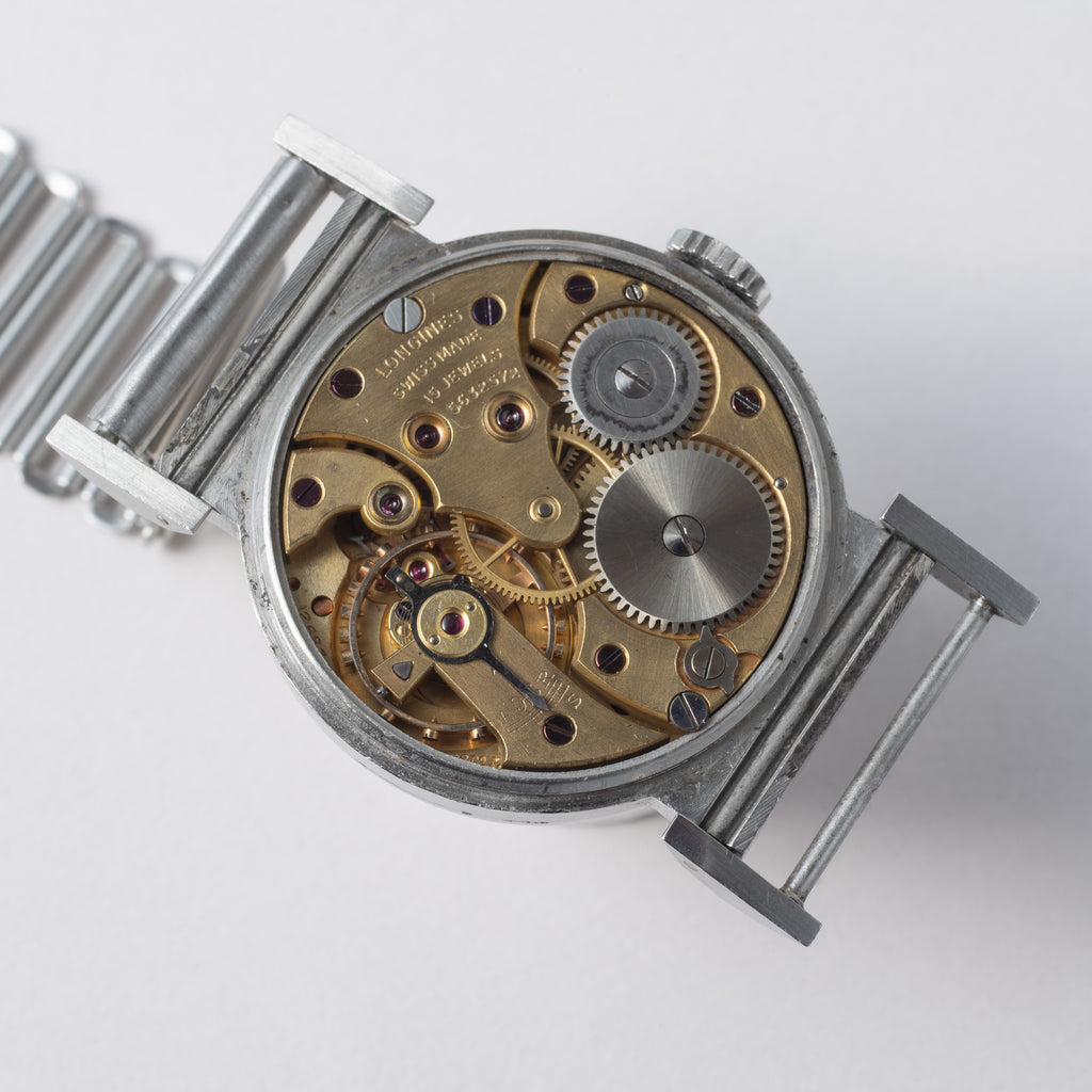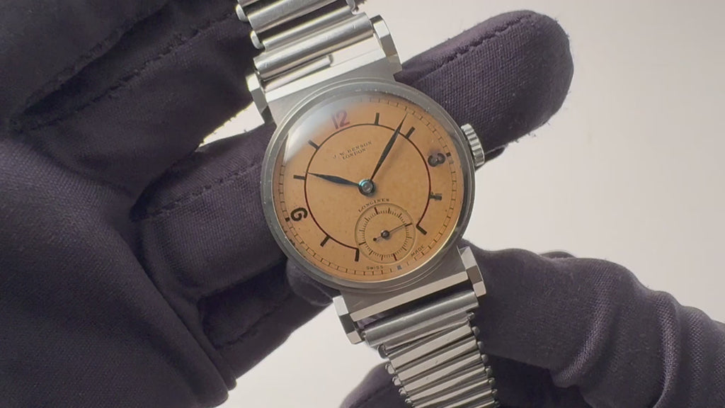 J.W.BENSONとLONGINESのWネーム セクターダイヤル 1938年製 フレキシブルラグ BONKLIPバンブーブレス付きです。イギリスの時計メーカーのベンソンの表記ですが、ロンジンの製造でフレキシブルラグのステイブライトケースにセクターダイヤルにブルースチール針が魅力的な1本です。30㎜(リューズ別)サイズでフィット感が良い30年代らしいモデルです。小傷はありますが、ステップベゼルのステイブライトケースはオリジナルのシェイプが残る良い状態です。ムーブメントはオールドロンジンを代表する12.68Zを搭載しています。ブレスはイギリス軍でも採用したBONKLIPのバンブーブレスを取り付けしています。