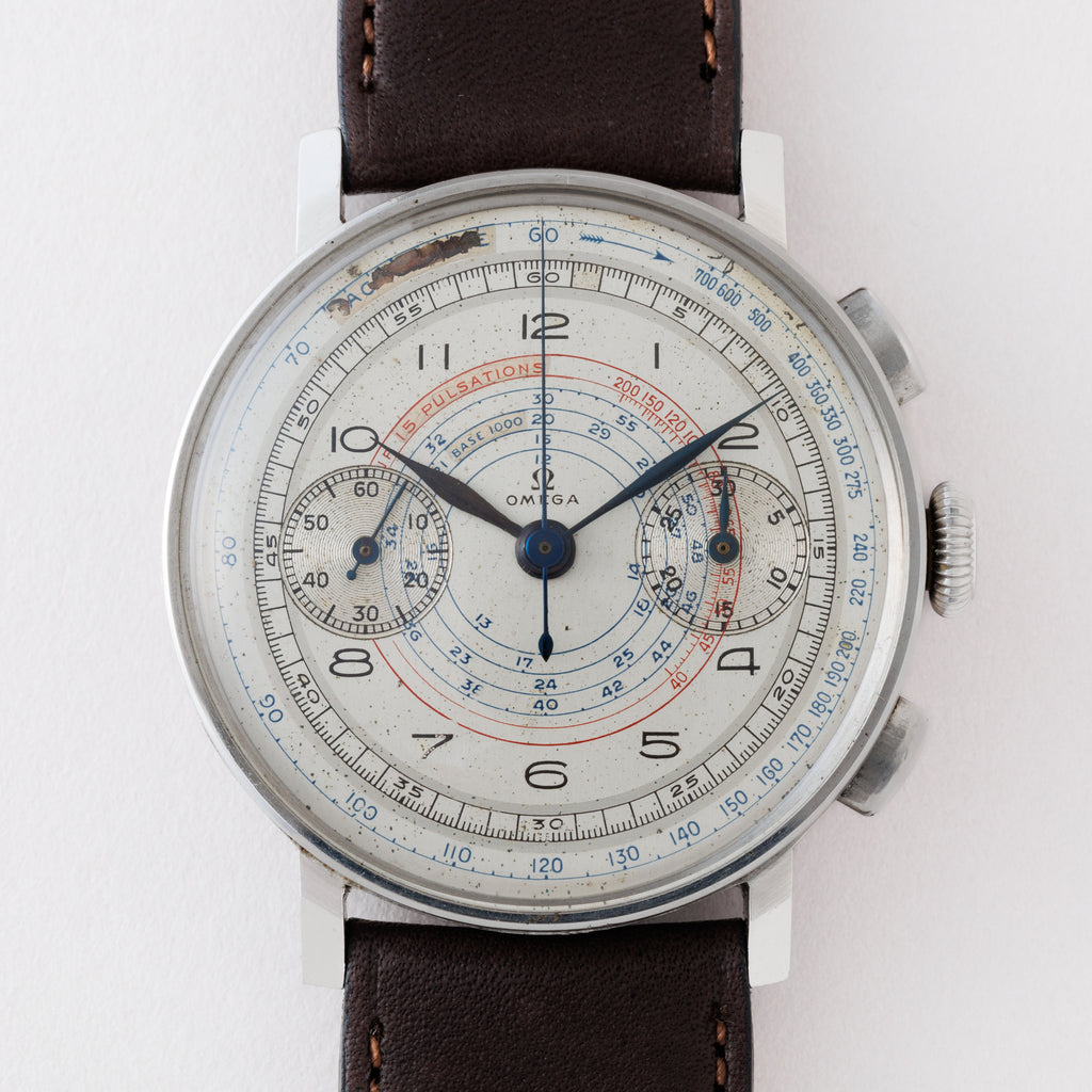 1940年代製のオメガ クロノグラフ Cal.33.3CHROが入荷しました。ヴィンテージオメガを代表するCal.33.3CHROを搭載したこちらは、大型の機械だけありダイヤル側からもインダイヤルの離れ具合によってそれと分かる魅力的な一本です。ダイヤルはシルバーで、メーター類を赤と青で二色使い分けた秀逸なデザインです。ダイヤルの外周11時~12時位置に剥がれがあります。ケースは小傷はあるもののポリッシュ感の少ない個体です。手巻きや針回し、クロノグラフの操作はスムーズです。ベルトはアキュレイトフォルムの革ベルトを合わせています。