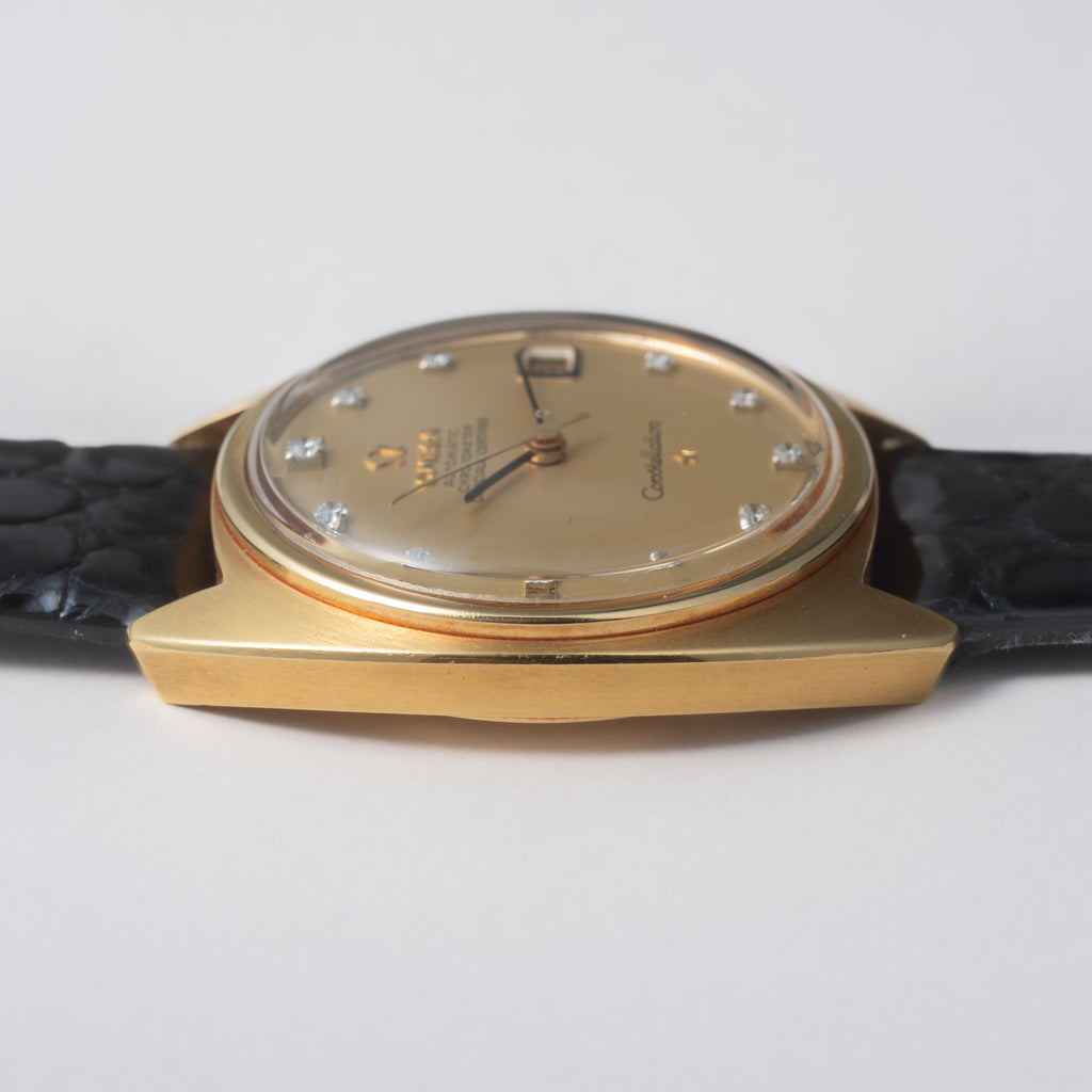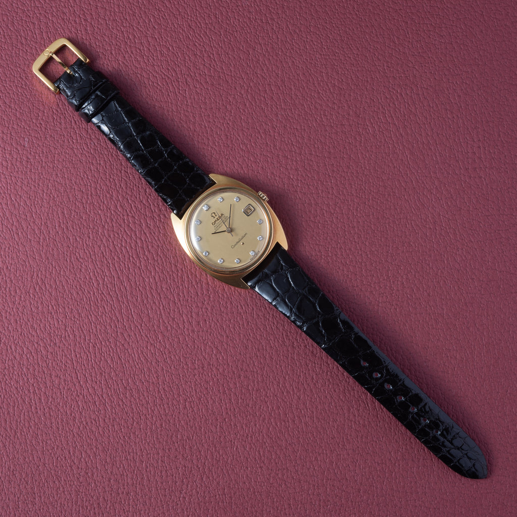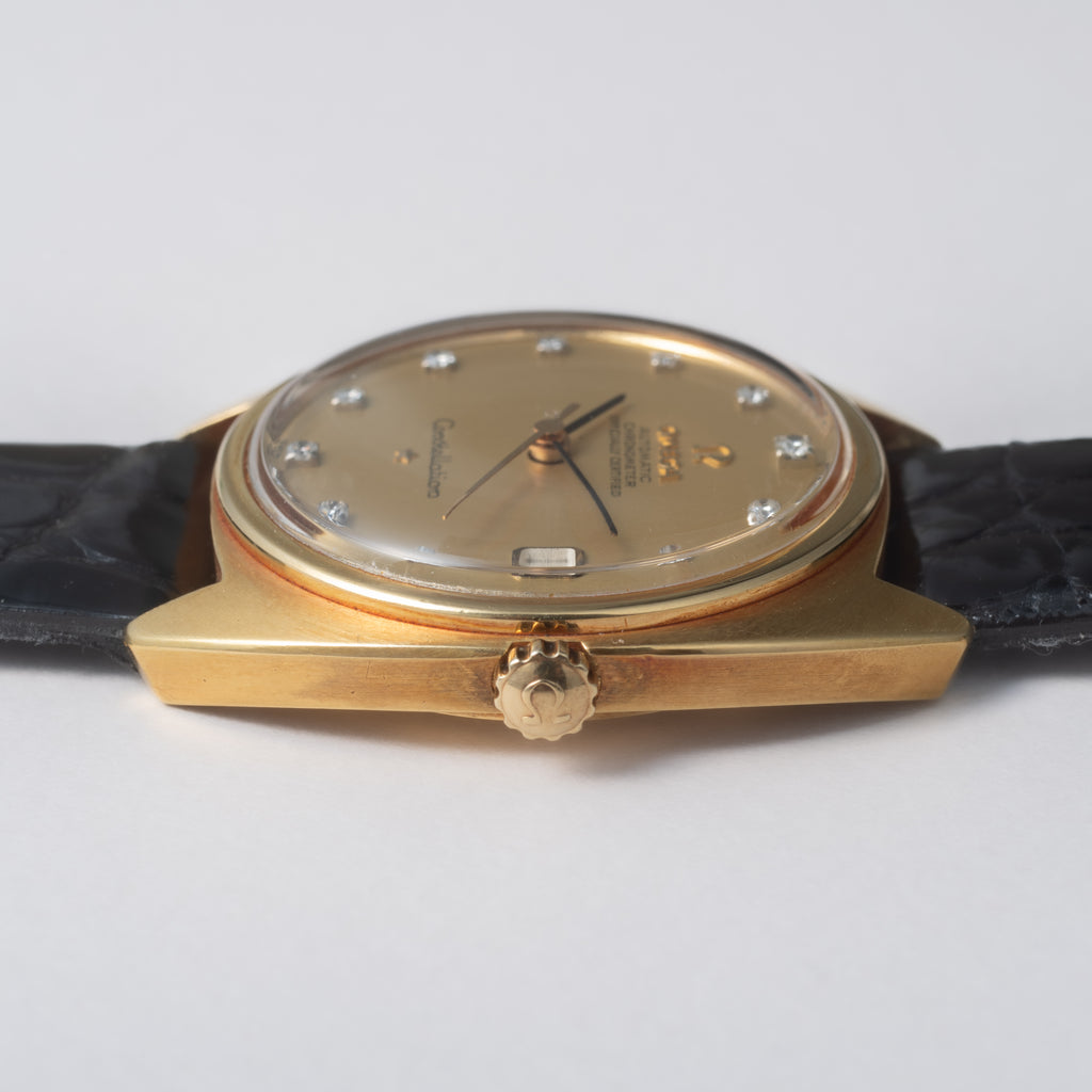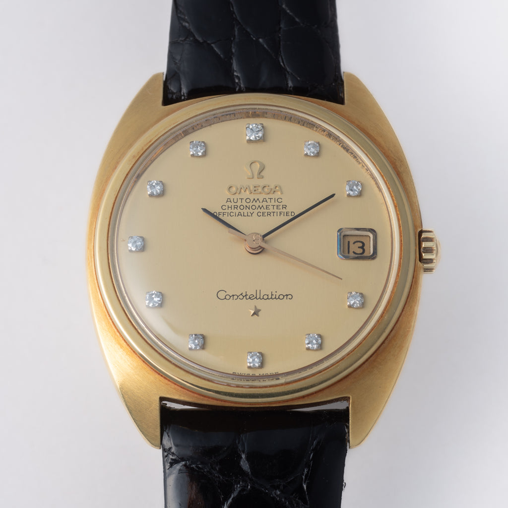 オメガ 18金無垢コンステレーション11Pダイヤ ジェンタデザイン初期型 1966年製  Cal. 561 自動巻き 尾錠付きの入荷になります。非常に珍しい11ポイントダイヤ文字盤で18金無垢イエローゴールド仕様のコンステレーションです。ジェンタデザインのコンステレーションの最初期型でCal. 561を搭載しています。文字盤はシミ等無く綺麗です。ケースは小傷が見られますが大きなダメージはありません。手巻きや針回しの操作はスムースです。ベルトは社外のクロコダイルに金張りの純正尾錠が取り付けられています。