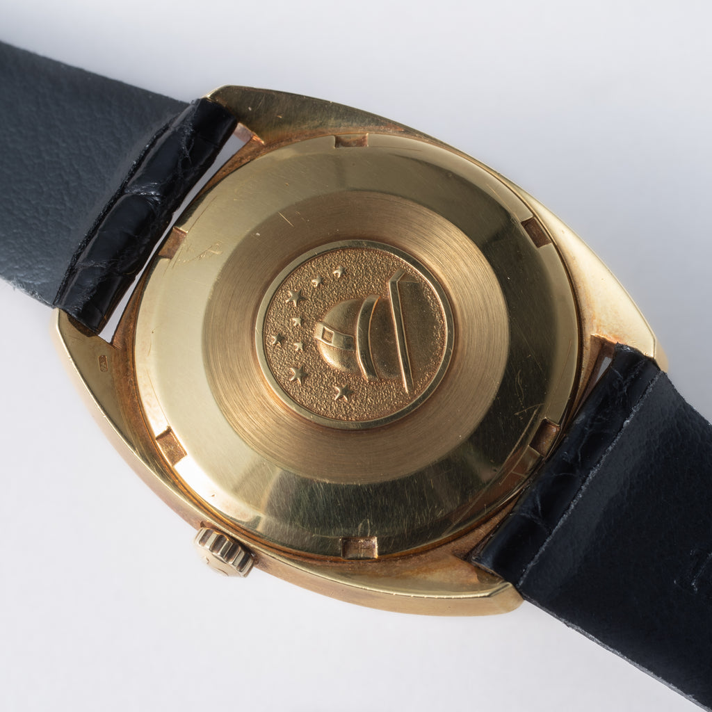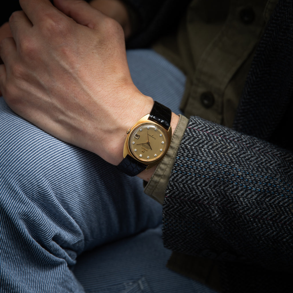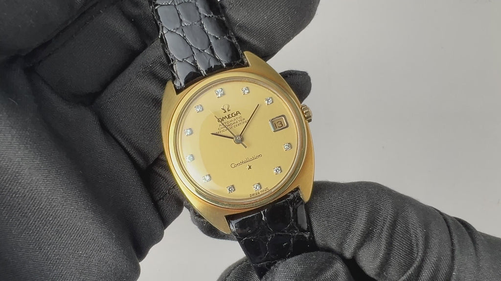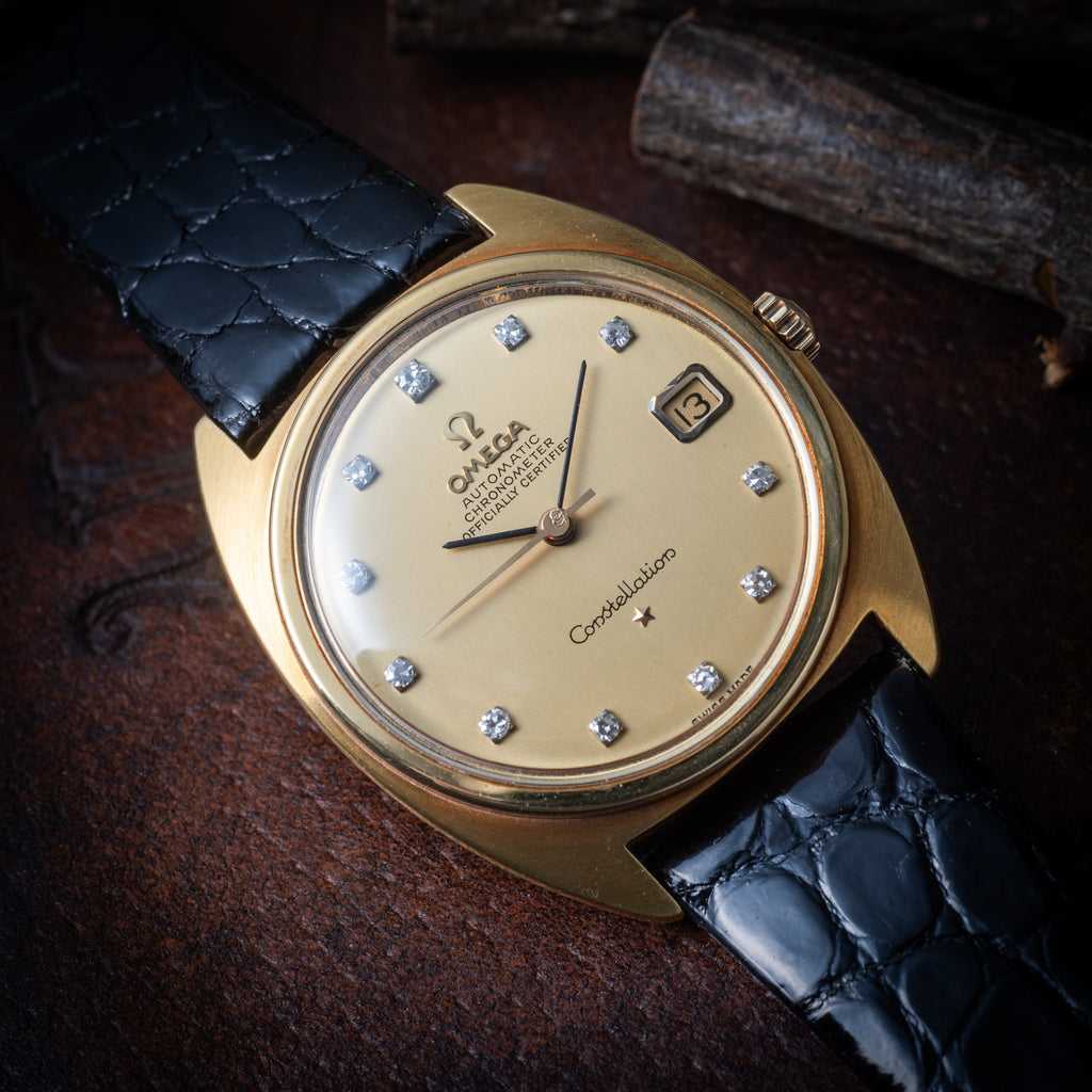 オメガ 18金無垢コンステレーション11Pダイヤ ジェンタデザイン初期型 1966年製  Cal. 561 自動巻き 尾錠付きの入荷になります。非常に珍しい11ポイントダイヤ文字盤で18金無垢イエローゴールド仕様のコンステレーションです。ジェンタデザインのコンステレーションの最初期型でCal. 561を搭載しています。文字盤はシミ等無く綺麗です。ケースは小傷が見られますが大きなダメージはありません。手巻きや針回しの操作はスムースです。ベルトは社外のクロコダイルに金張りの純正尾錠が取り付けられています。