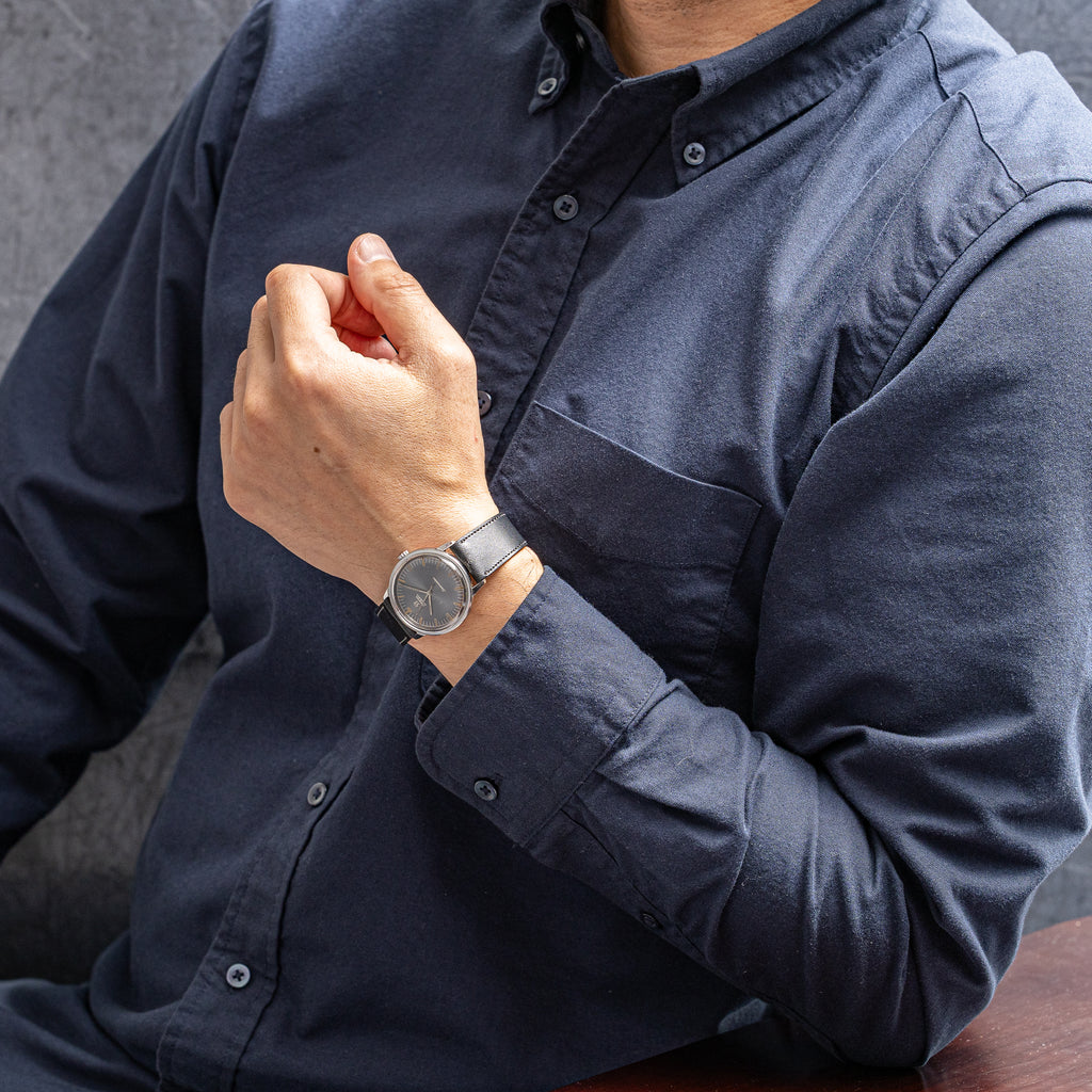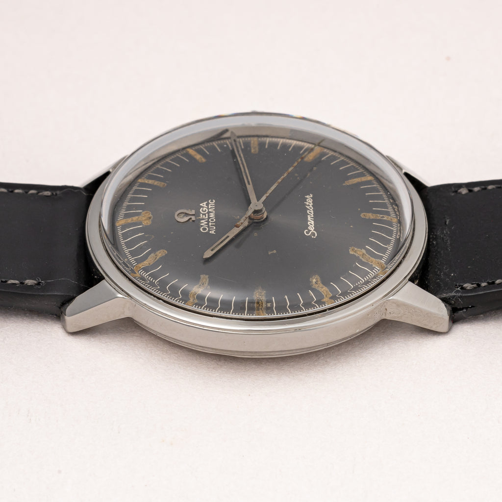 1963年製のオメガシーマスターオートマチック ノンデイトです。シンプルなものからレイルマスター、シーマスター顔など様々なデザインの文字盤が入るRef.165.002ですが、こちらはスピードマスターのような夜光塗料のインデックスが目を引く一本です。グレーの文字盤は若干のダメージはありますが、レターが全て抜き字になった凝った造りです。シンプルなラウンドのケースは、裏蓋に若干の磨きとキズはありますが、概ね良好な状態です。ムーブメントはシーマスター300にも使われているCal.552を搭載、手巻きや針回しの操作はスムースです。ベルトはファイアーキッズオリジナルの革ベルトを装着しています。