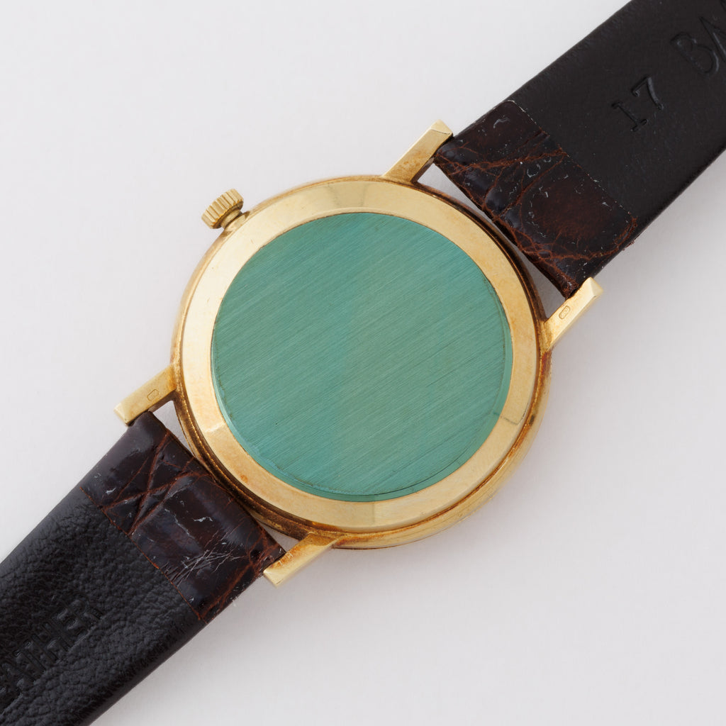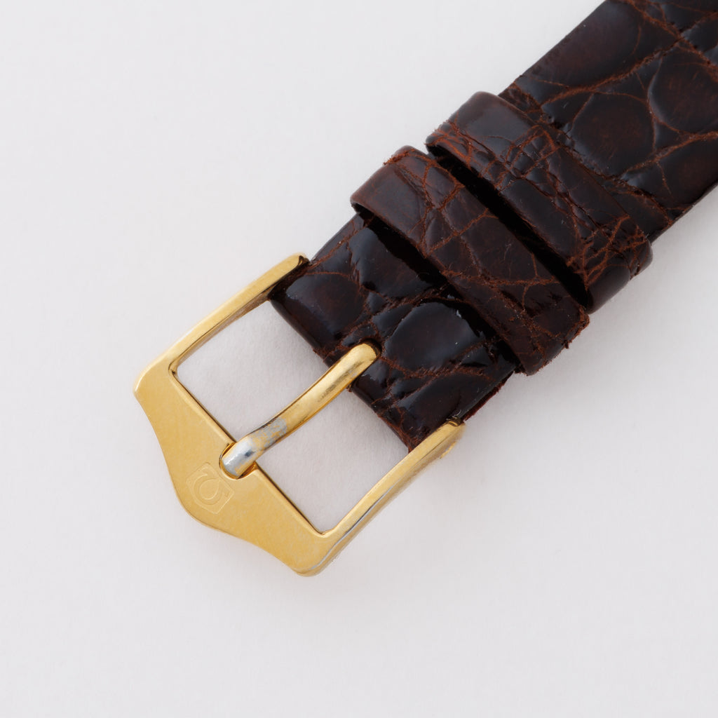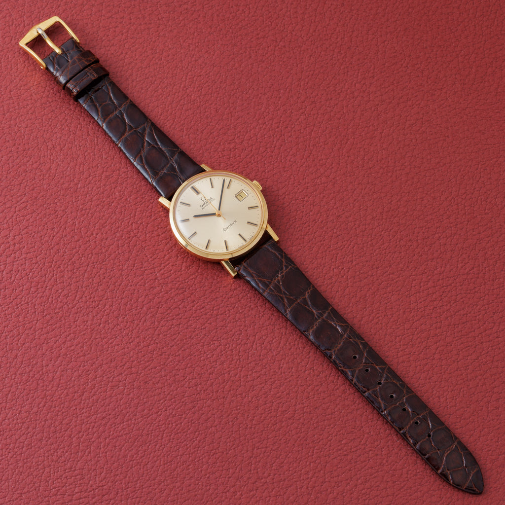 1973年製のオメガジュネーブ Ref.162.021 18金無垢 自動巻き 純正尾錠付きです。ジュネーブモデルにしては珍しい18金のイエローゴールドです。シンプルなデザインにイエローゴールドのゴージャス感を持つ、調和の取れたデザインです。ムーブメントはハイビート自動巻きのCal.1012を搭載。手巻きや針回しの操作はスムースです。ベルトは社外のクロコダイル革ベルトに純正の尾錠が付いています。