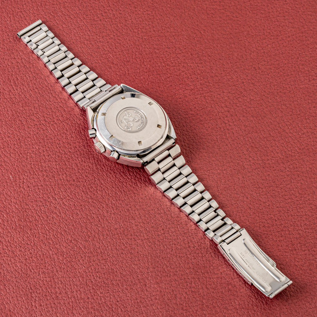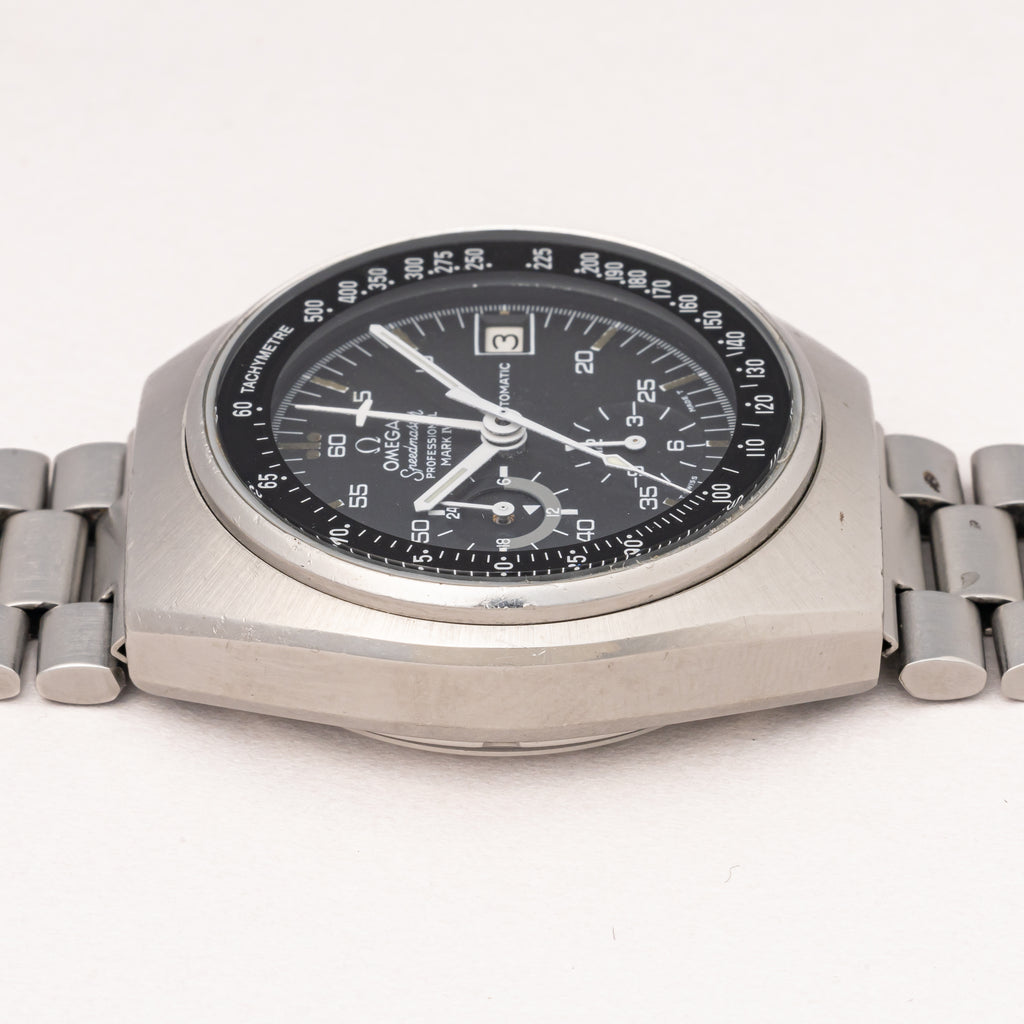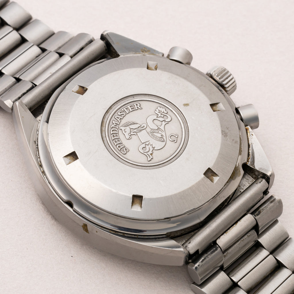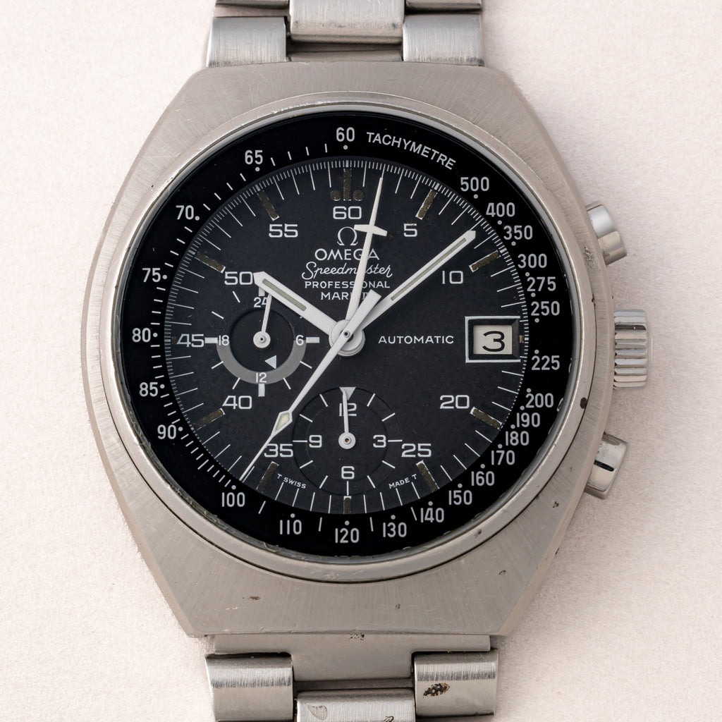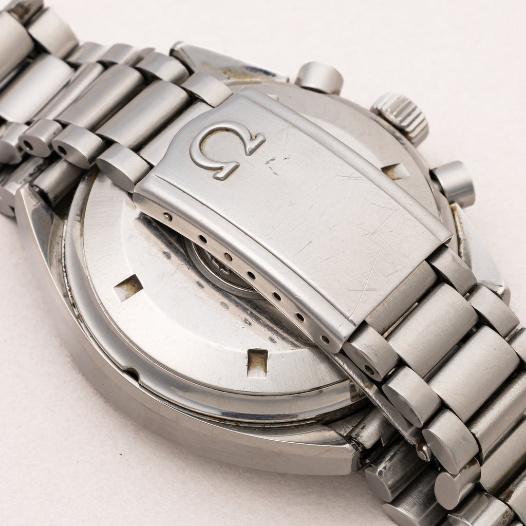 オメガの1973年製スピードマスター マークIV 176.009です。オメガ初の自動巻きクロノグラフCal.1040を搭載したスペシャルモデルで製造期間が短く希少モデルです。プロフェッショナルに使用されたCal.861をベースに自動巻にしたムーブメントでレマニア1340(ブレゲのアエロナバルに使用)のベースになります。しっかりとした存在感のあるトノーケースに純正ブレス付きのデザインはジェンタを思わせる雰囲気です。小傷が見られますがオリジナルの放射線状のヘアラインが残るケースは魅力的です。手巻きや針回しの操作はスムースです。ブレスは純正の1171が取り付けられています。後年のオメガの純正BOXが付属します。