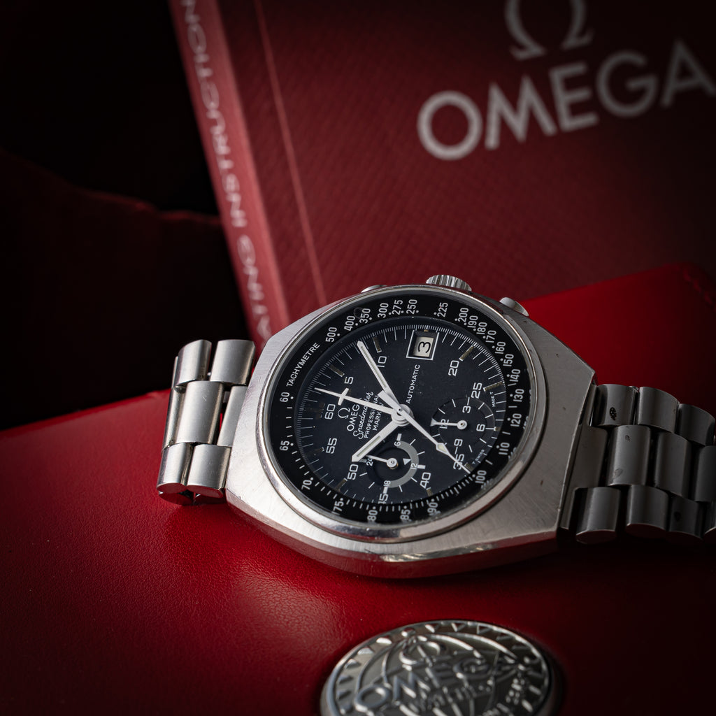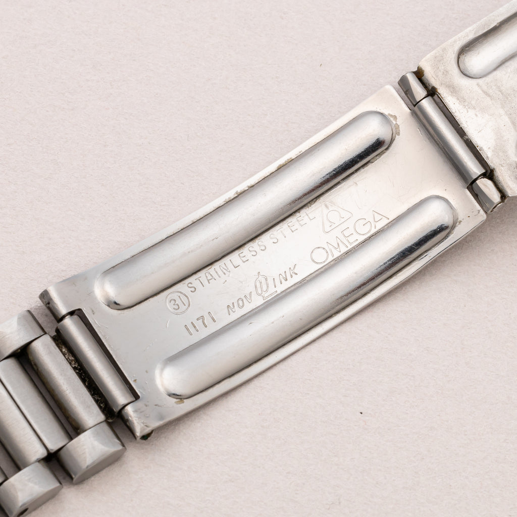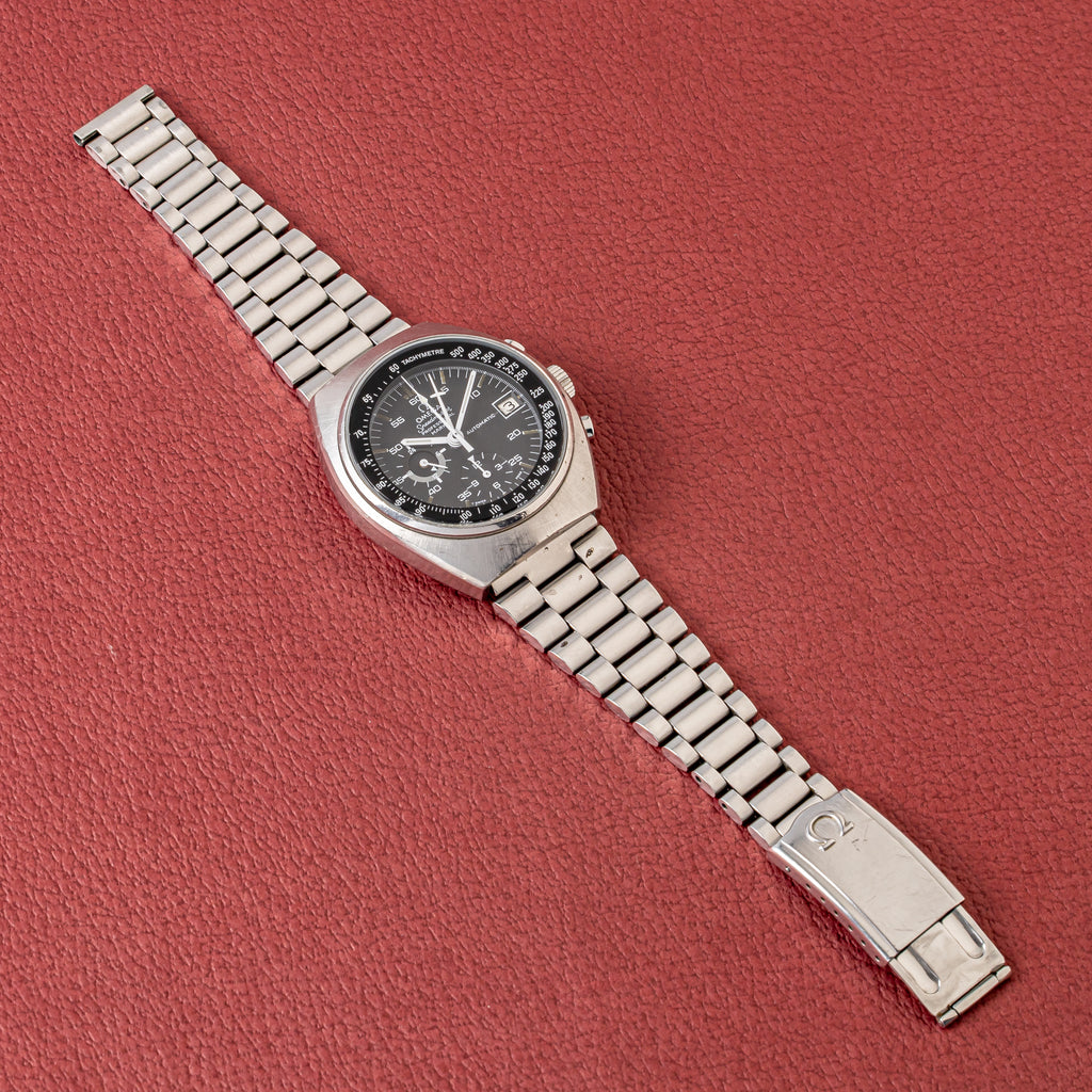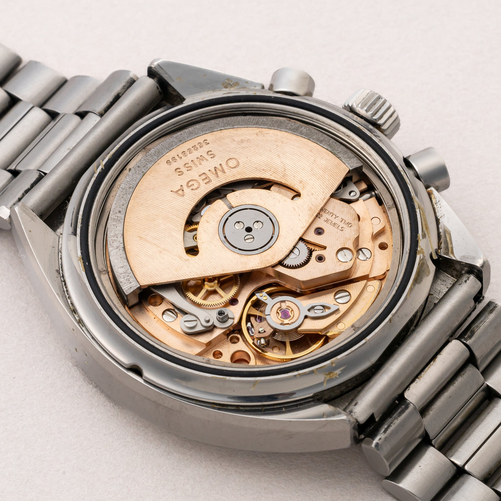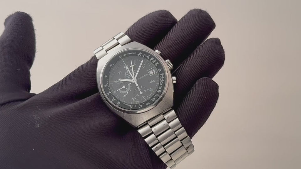 オメガの1973年製スピードマスター マークIV 176.009です。オメガ初の自動巻きクロノグラフCal.1040を搭載したスペシャルモデルで製造期間が短く希少モデルです。プロフェッショナルに使用されたCal.861をベースに自動巻にしたムーブメントでレマニア1340(ブレゲのアエロナバルに使用)のベースになります。しっかりとした存在感のあるトノーケースに純正ブレス付きのデザインはジェンタを思わせる雰囲気です。小傷が見られますがオリジナルの放射線状のヘアラインが残るケースは魅力的です。手巻きや針回しの操作はスムースです。ブレスは純正の1171が取り付けられています。後年のオメガの純正BOXが付属します。