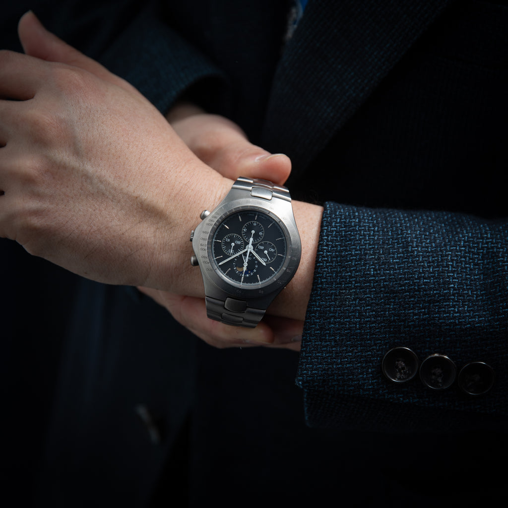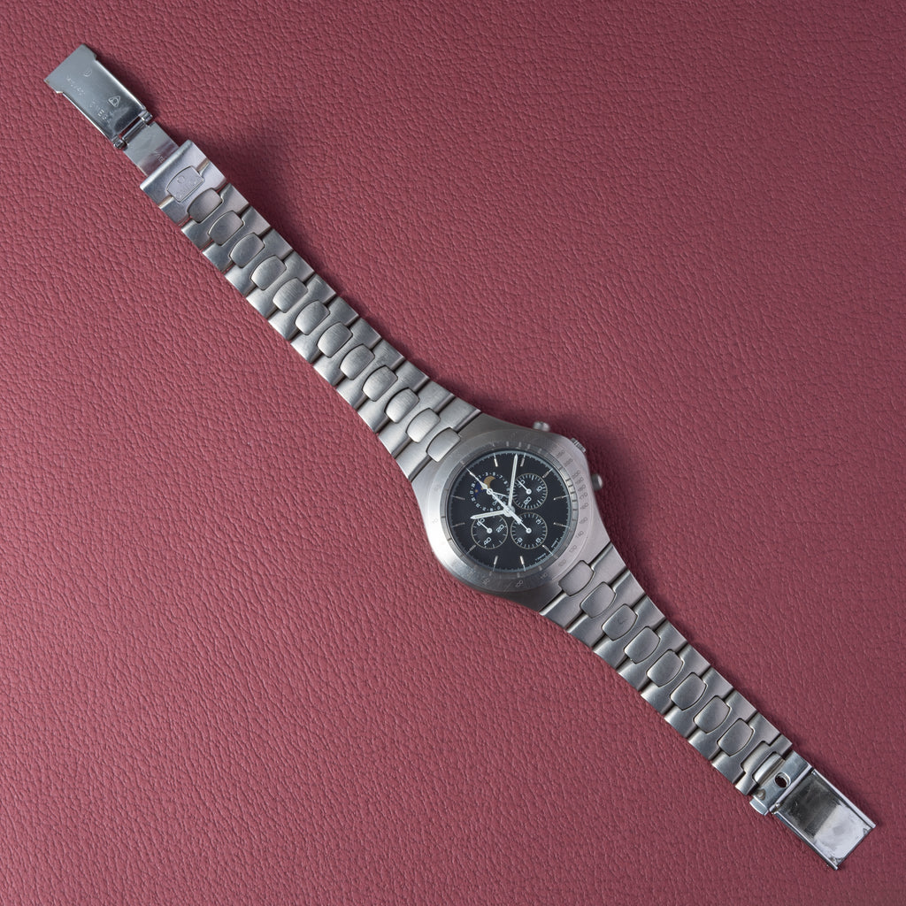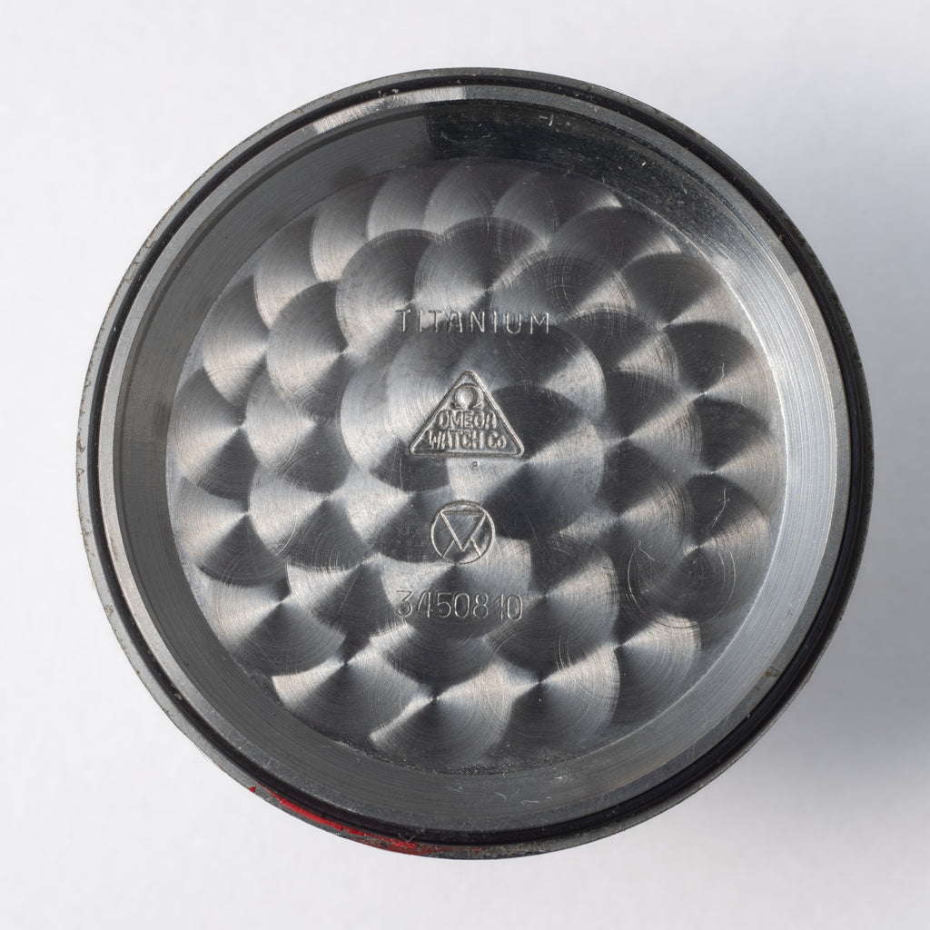 オメガ 1988年製 スピードマスター ムーンフェイズ 400本限定 チタンケース Cal.866 手巻きです。スピーディームーンのドイツ市場に僅か400本で製造されたモデルになります。ベルトのデザインからジェラルド・ジェンタデザインと思われます。ケース、ブレス(バックルはステンレス)にチタンを採用した特殊モデルで軽量かつ強靭な造りがドイツ向けらしい時計です。文字盤はインデックスに劣化が見られますがシミ等無く綺麗です。ケース、ブレスに小傷が見られますが大きなダメージはありません。手巻きや針回し、クロノグラフの操作はスムースです。裏蓋に出荷時の赤い塗料が残った状態です。