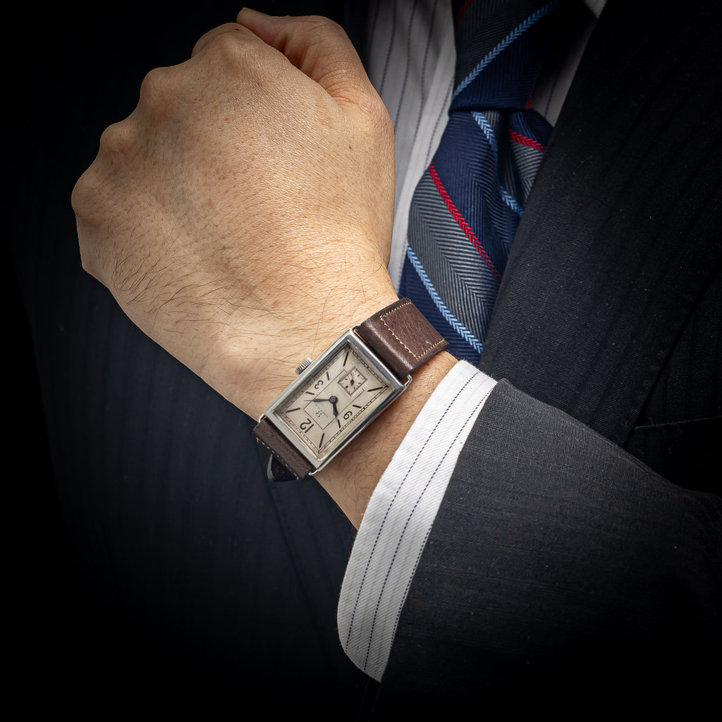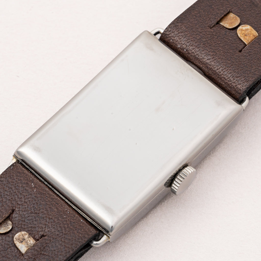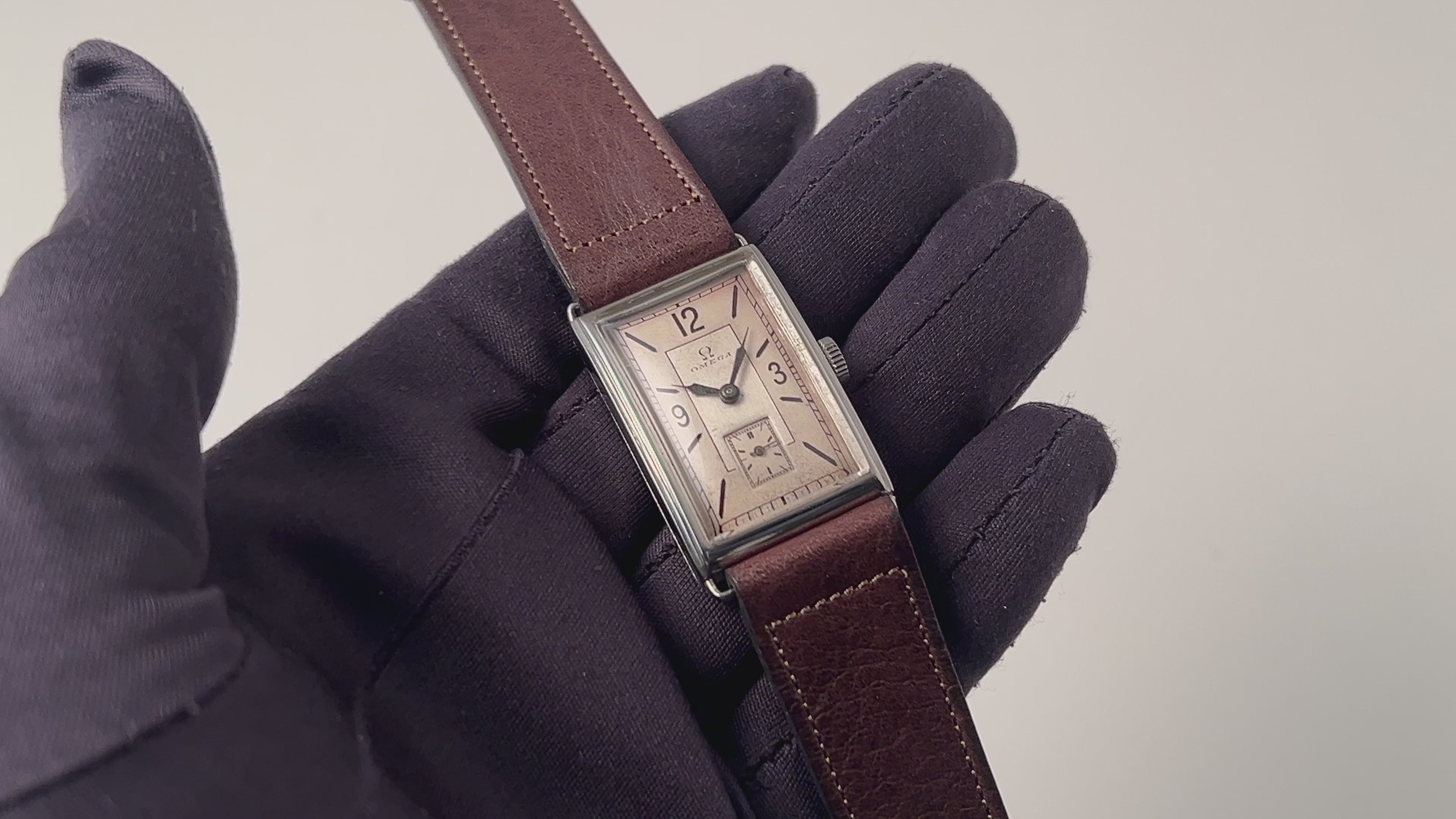 オメガ レクタンギュラー 手巻きモデルです。パテックやIWCなどの角型ムーブメントと同構造で、評価の高いCal.20Fを搭載。文字盤は全体的に変色はありますが、デザイン性に富むアラビアとバーインデックスは品高く、ブルースチール針もマニア好みで人気が高いです。ケースはステンレスではなくACIER STAYBRITEが採用されており、時代の変遷を感じられます。コキズはあるものの、大きなダメージはなく、90年以上経とうとする個体としては上々の状態で、ムーブメントも綺麗です。ベルトはヴィンテージと相性の良いアキュレイトフォルムが取り付けられています。こちらは分解掃除済みです。