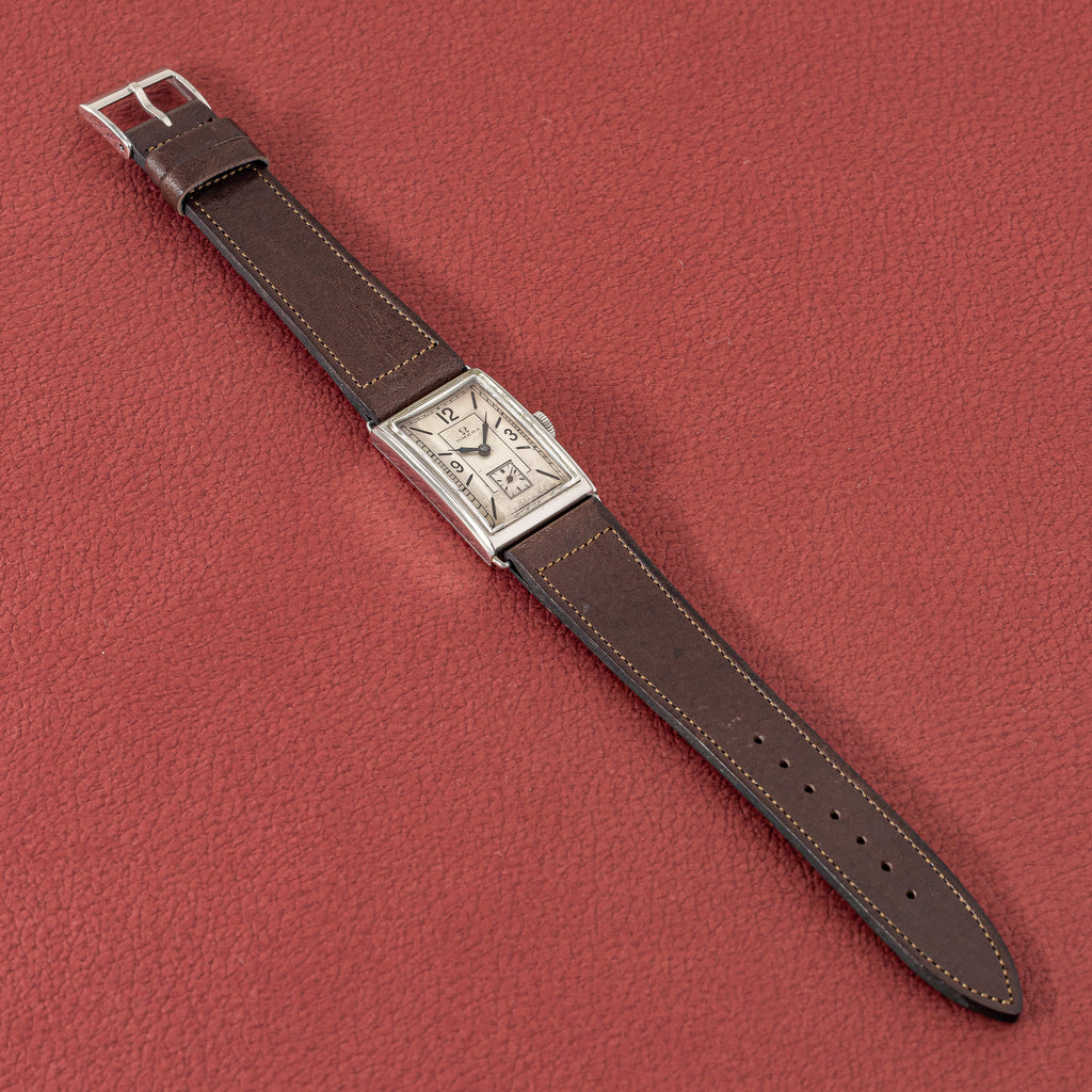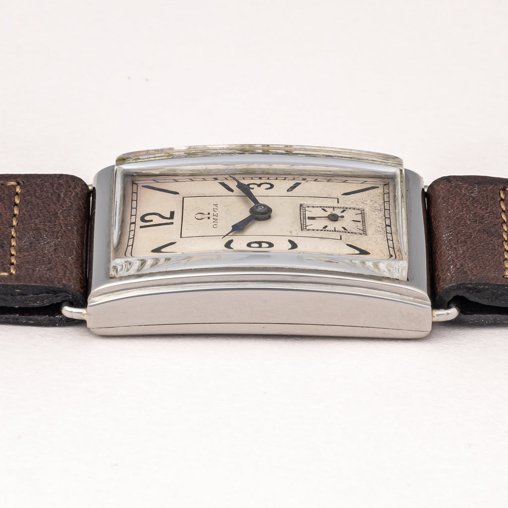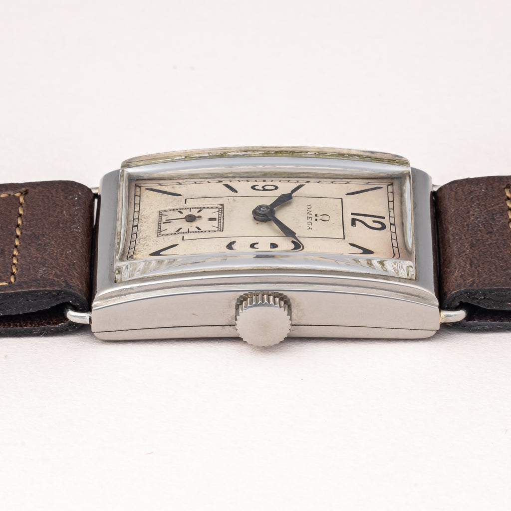 オメガ レクタンギュラー 手巻きモデルです。パテックやIWCなどの角型ムーブメントと同構造で、評価の高いCal.20Fを搭載。文字盤は全体的に変色はありますが、デザイン性に富むアラビアとバーインデックスは品高く、ブルースチール針もマニア好みで人気が高いです。ケースはステンレスではなくACIER STAYBRITEが採用されており、時代の変遷を感じられます。コキズはあるものの、大きなダメージはなく、90年以上経とうとする個体としては上々の状態で、ムーブメントも綺麗です。ベルトはヴィンテージと相性の良いアキュレイトフォルムが取り付けられています。こちらは分解掃除済みです。