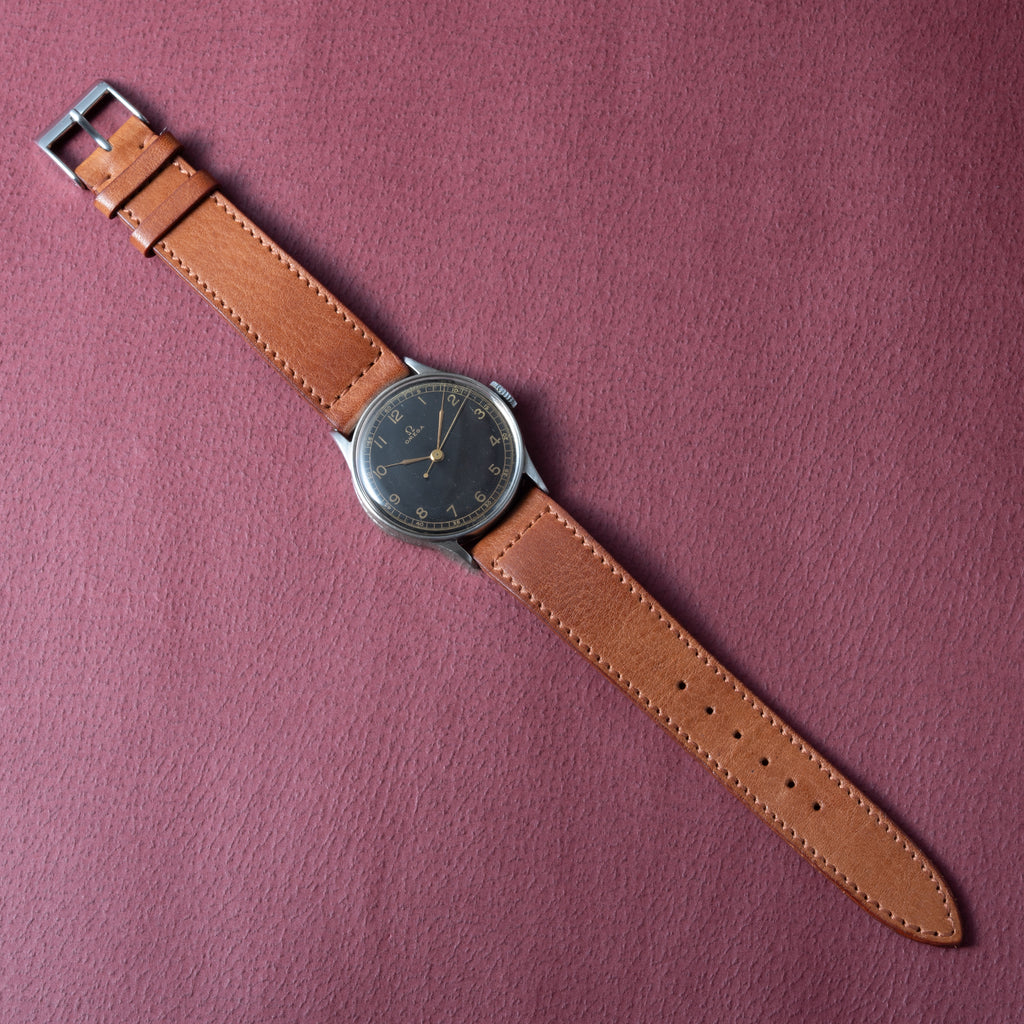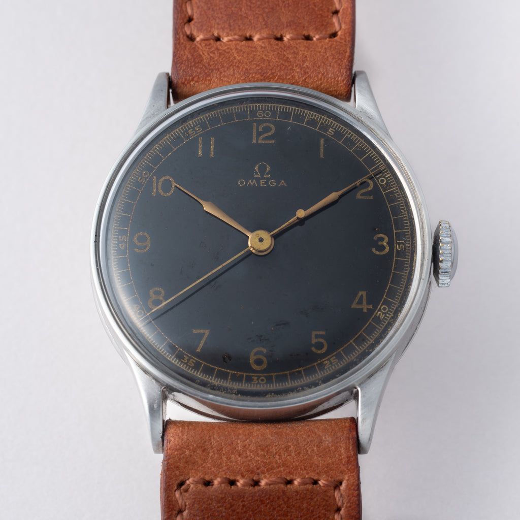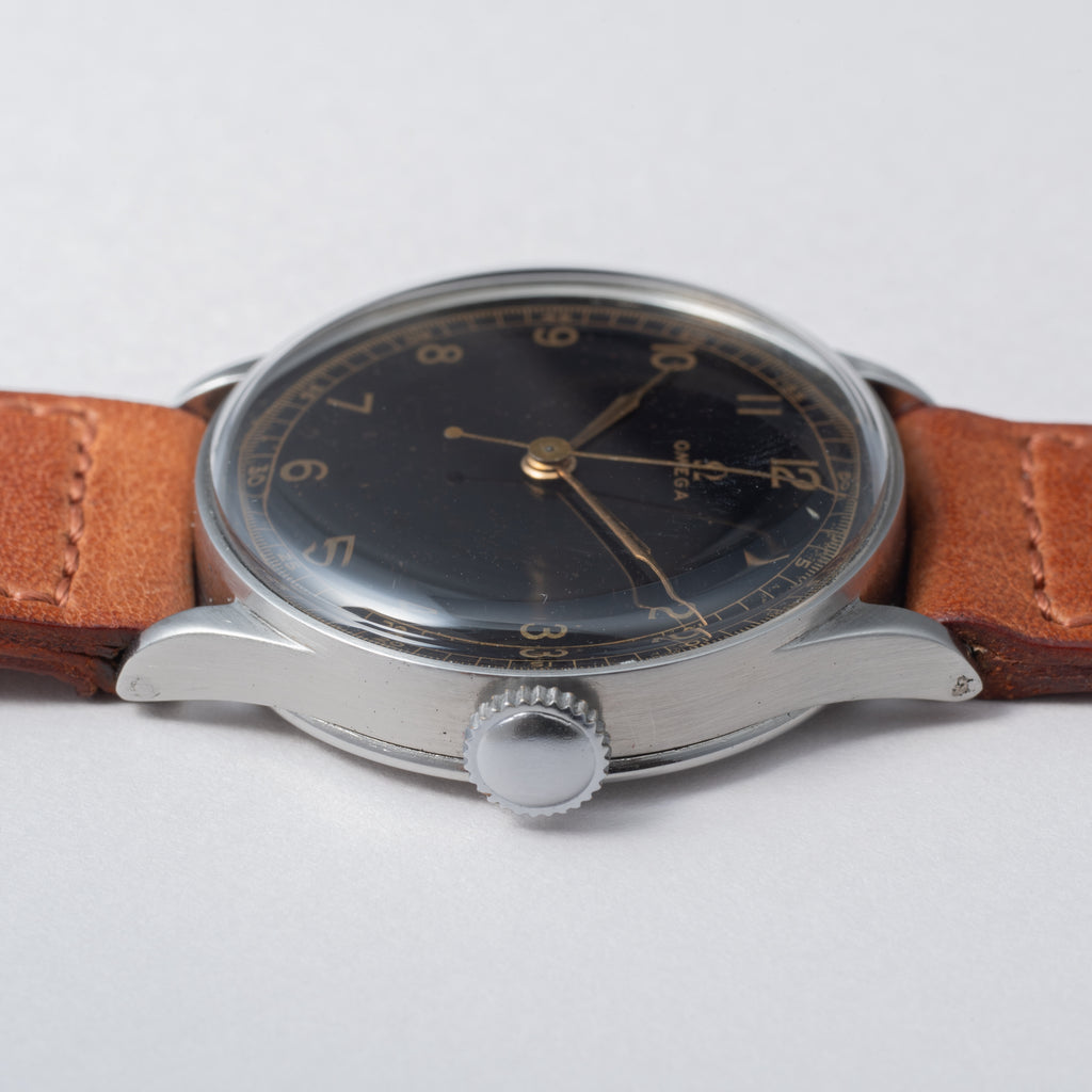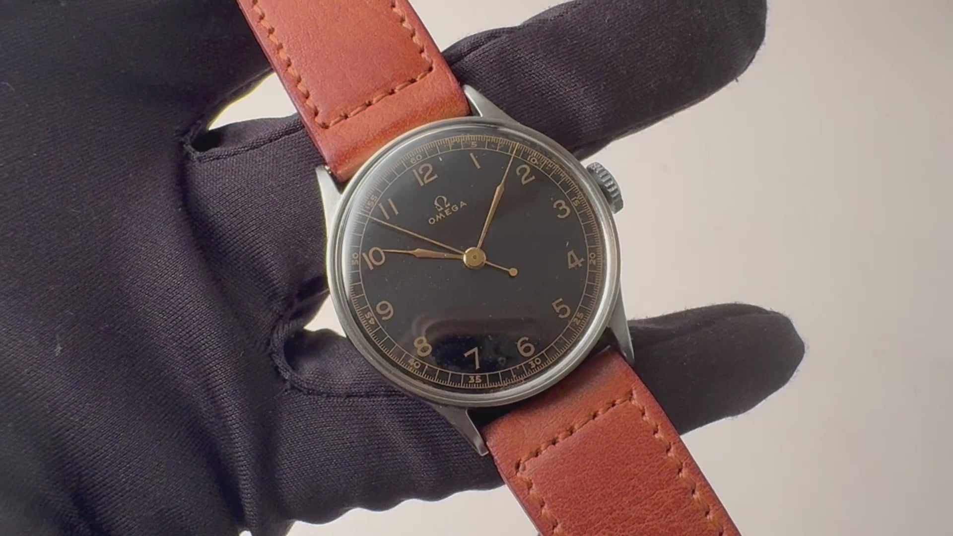 1930年代製のオメガラウンドケースセンターセコンド ブラックミラーダイヤルです。 当時はスモールセコンドが主流であり、センターセコンドは最先端の仕様でした。しっかりとした厚みのあるスナップバックケースと大きな文字盤が魅力的です。ブラックミラーの文字盤も多少経年の劣化はございますがしっかりと艶の残る状態です。ムーブメントは手巻きのCal.23.4SCを搭載、手巻き針回しの操作はスムーズです。ベルトは社外の革ベルトが取り付けてあります。こちらはオーバーホール済みです。