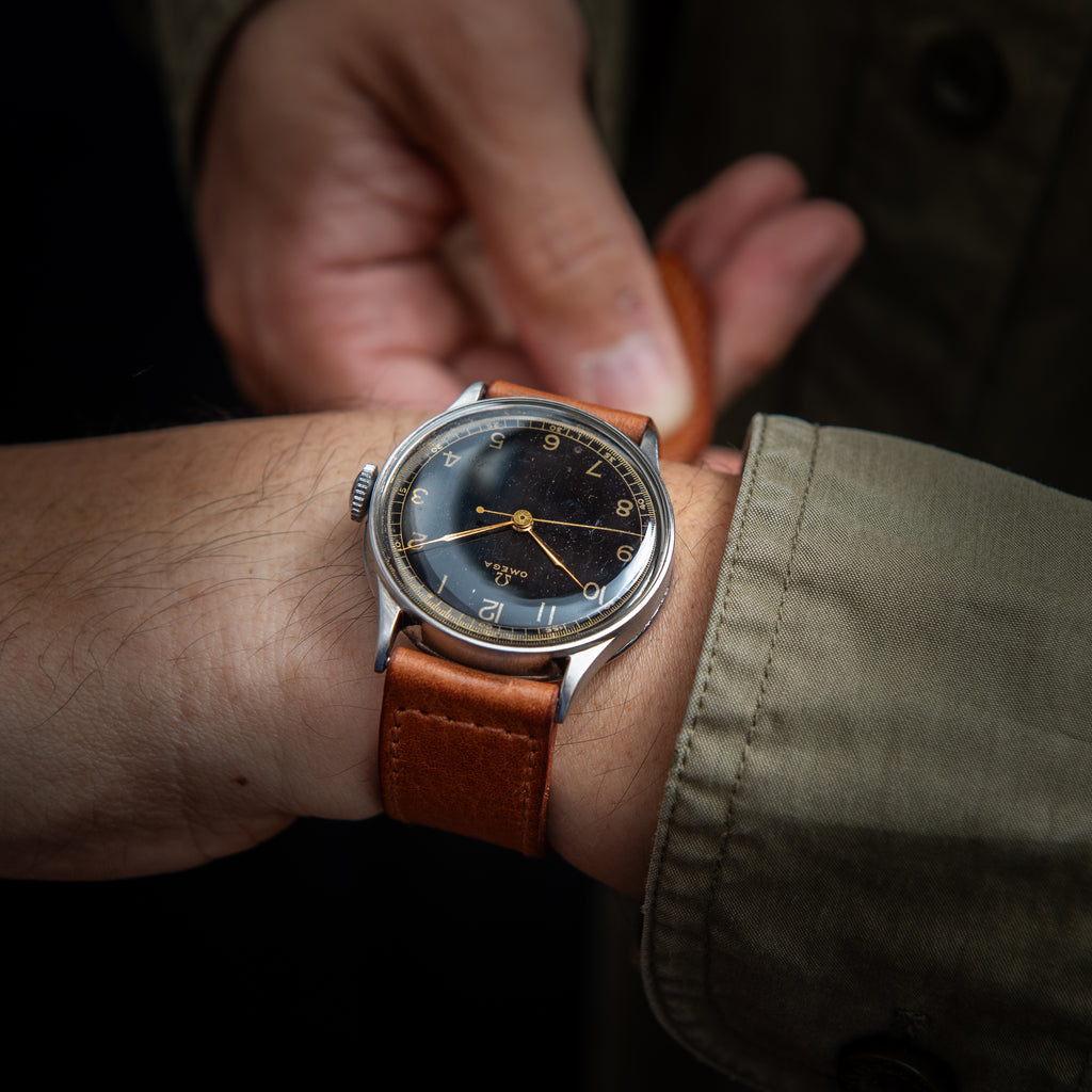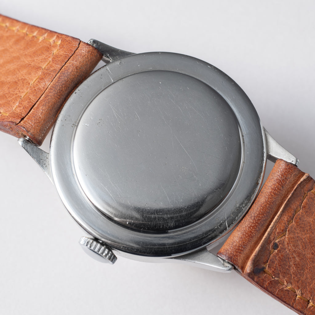 • ヴィンテージ時計の特性上、風防・パッキン・リューズ・バネ棒などの消耗部品は後年メンテナンス過程で交換されている場合がございます。オリジナル性を重視しておりますが、必要に応じて適切な部品にて調整されていますので、よりコレクション性重視のお求めのお客様は事前にご確認ください。