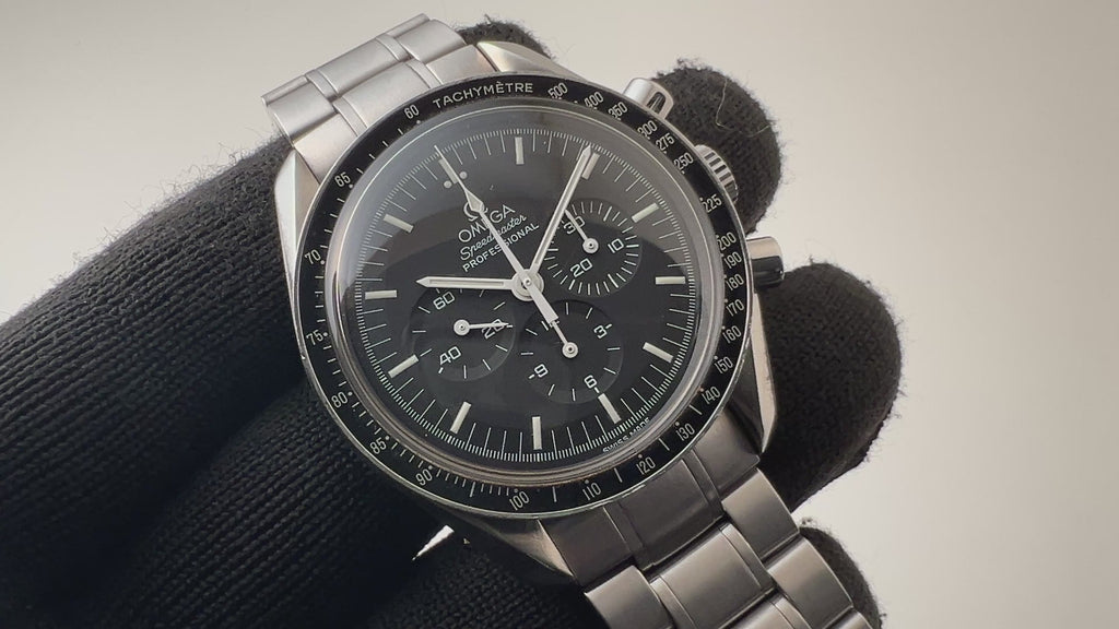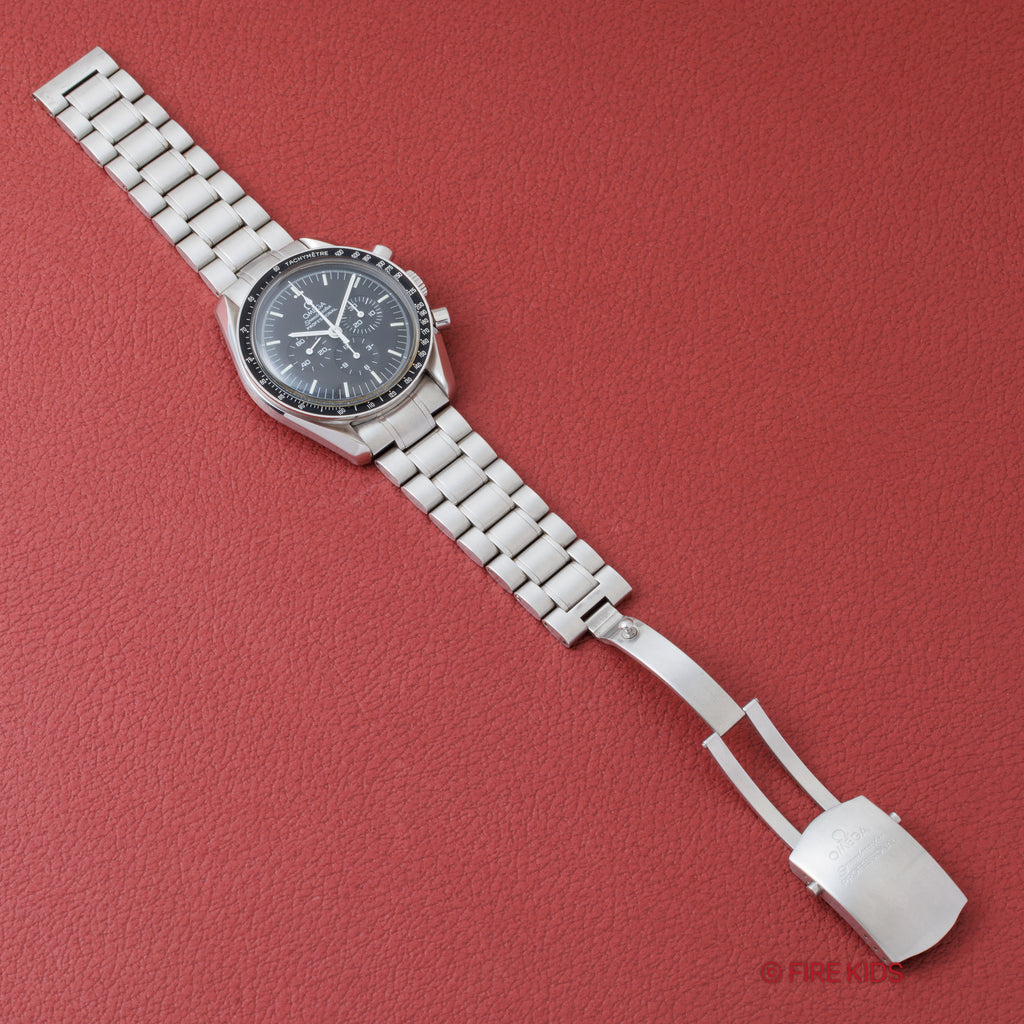 2000年製オメガのスピードマスタープロフェッショナルRef.145/345 0808です。NASAに採用されたスピードマスタープロフェッショナルは現在も細かなマイナーチェンジをしながら作られているロングセラーモデルです。ベゼル、文字盤の状態も大きなダメージはありません。ムーブメントはCal.861をブラッシュアップしたCal.1863を搭載。ブレスは純正ステンレスブレスが取り付けられています。ケースやブレスは小キズが見られますが大きなダメージはありません。手巻きや針回し、クロノグラフの操作はスムースです。