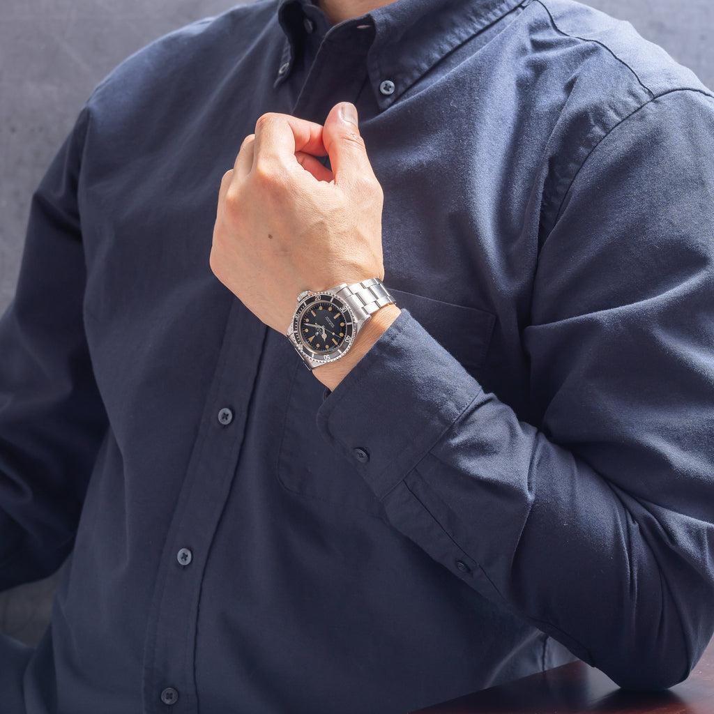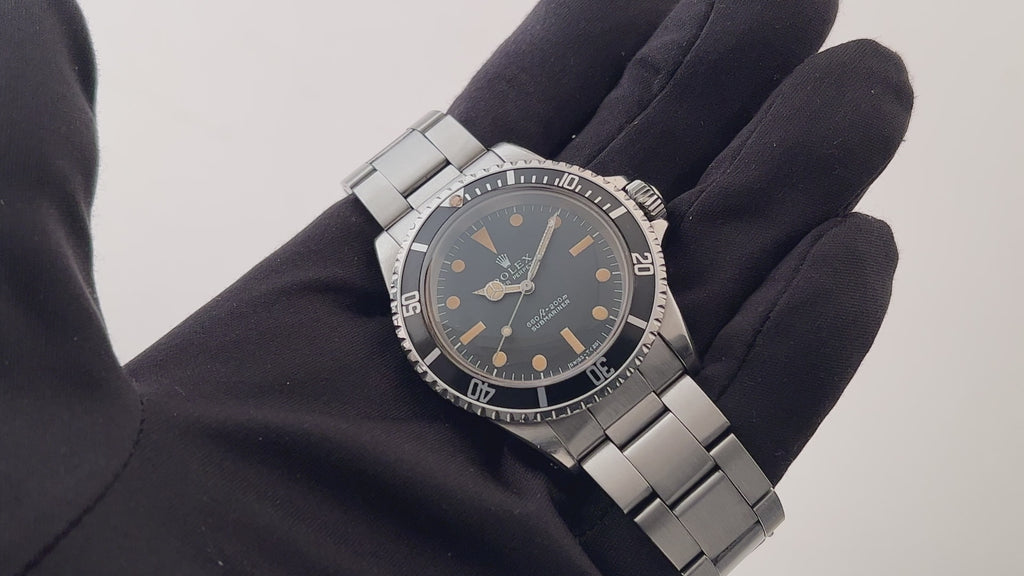 ロレックスのサブマリーナーRef.5513の1968年製になります。ダイヤルは下サブ表記のマークⅠダイヤルでSINGER社製になります。ダイヤルはブラックが若干グレーに経年変化し、トリチウム夜光にはやや強めの焼けが入っており、経年変化した針とのバランスは非常に良い雰囲気です。ケースは過去に仕上げられており小傷と打痕もございますが、その分がっしりとしたラインを残しております。リューズも当時のオリジナルが付いております。ブレスレットは純正の巻きブレス(9315/FF280)が付いております。