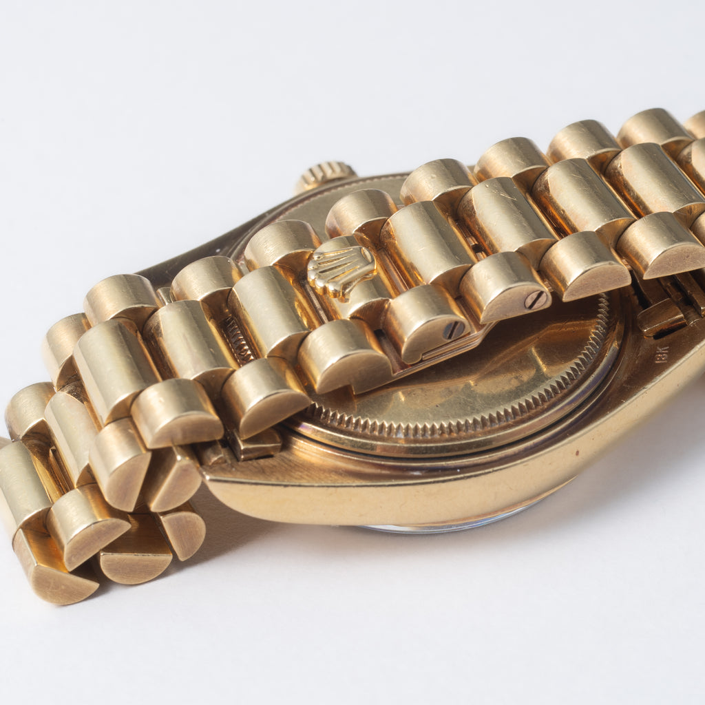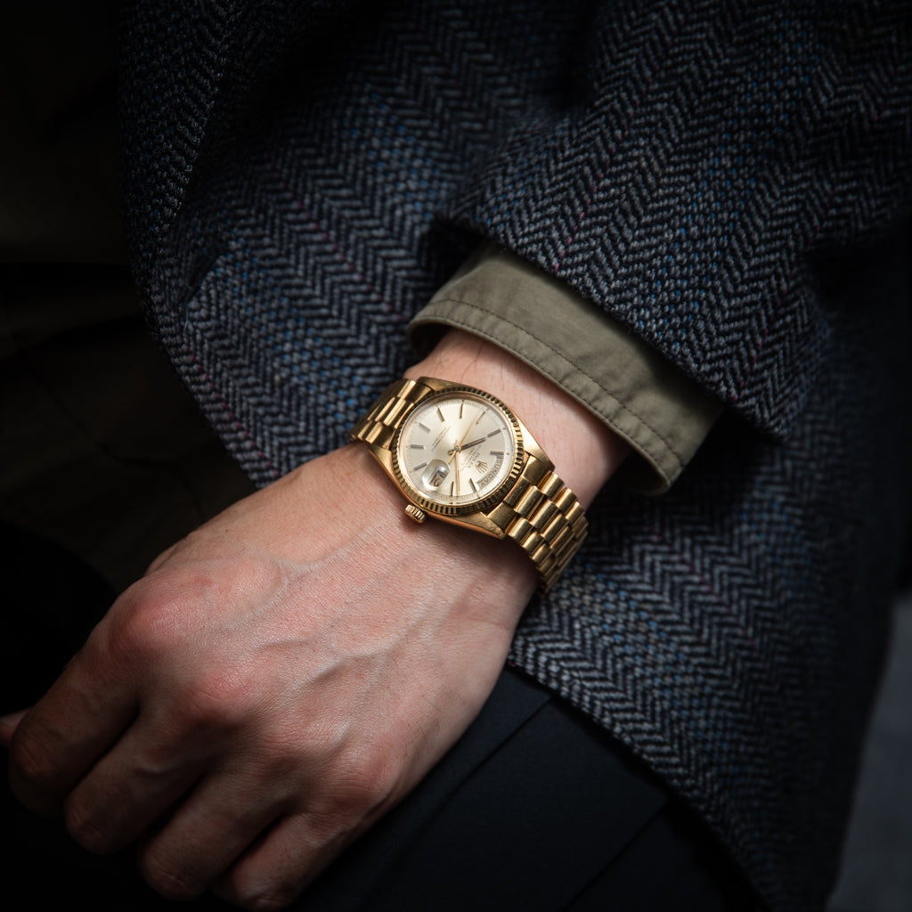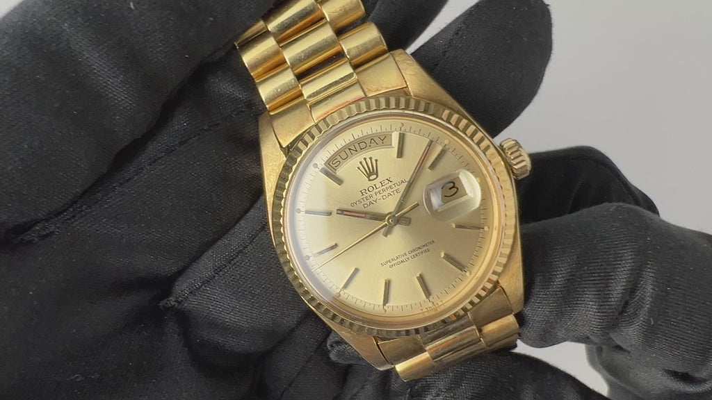 1972年製のロレックスデイデイトのRef.1803 18KYG 純正18KYGブレス付きになります。ロレックスの最上位モデルで、フルスペルの曜日表示は存在感があります。ダイヤルは夜光の欠落もなく良好なコンディションで、ケースも小傷こそありますが過度な痩せ感はありません。伸びの出やすい、バックルタイプのブレスレットは多少の伸びはございますが年代を考慮すれば良いコンディションを保っております。手巻きや針回しもスムーズです。