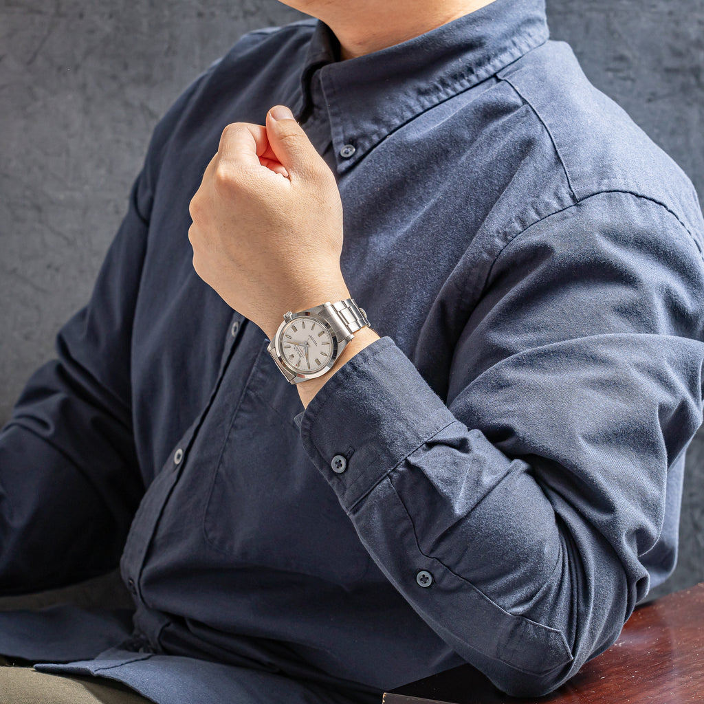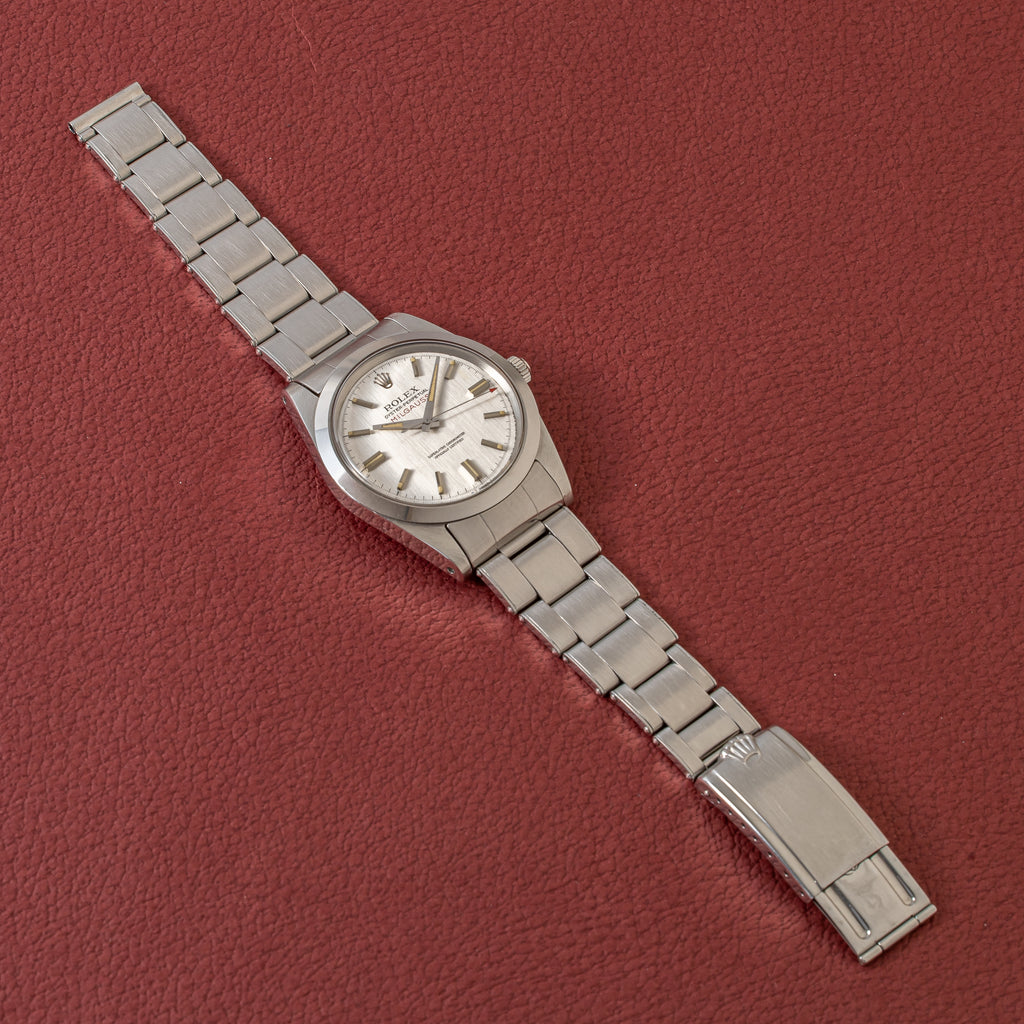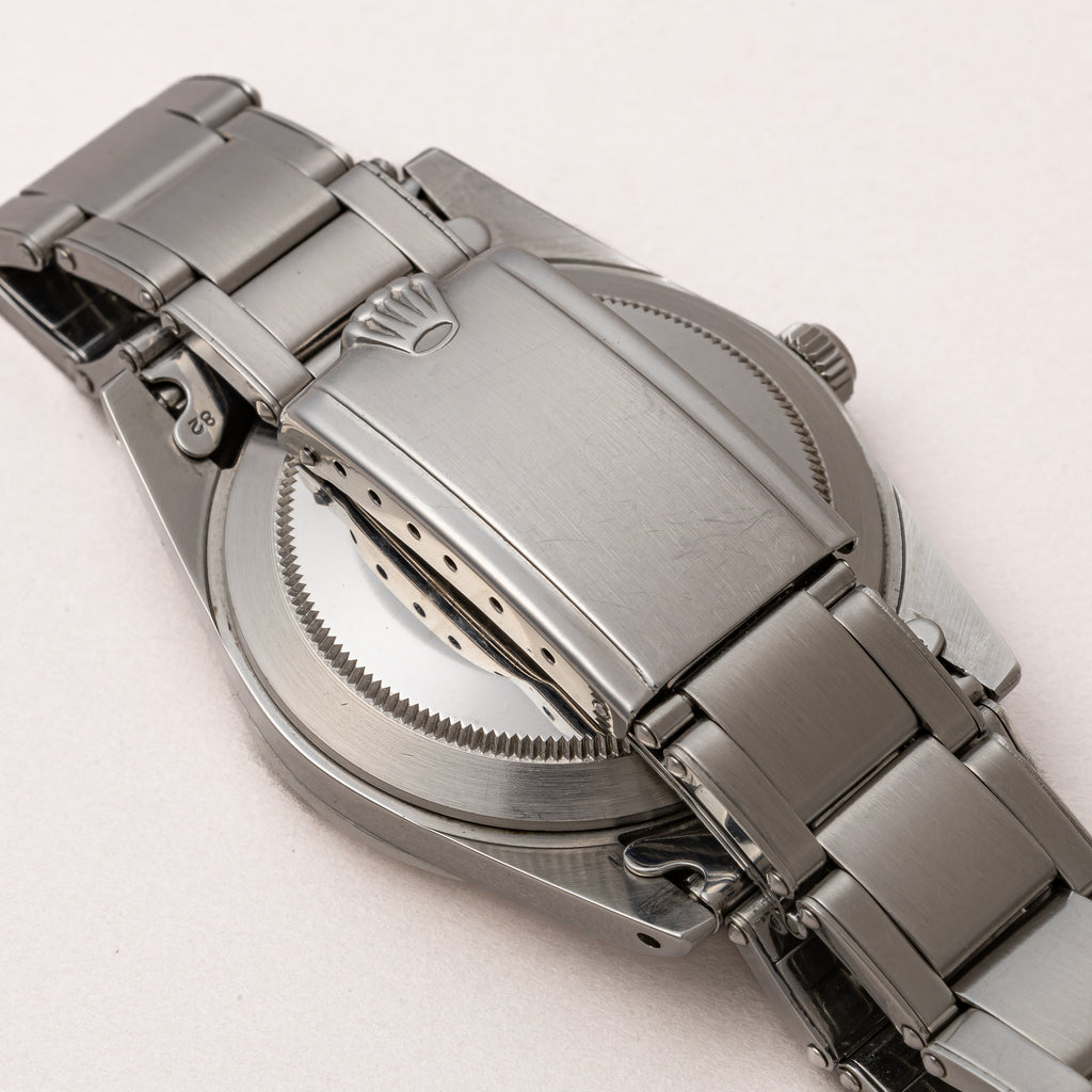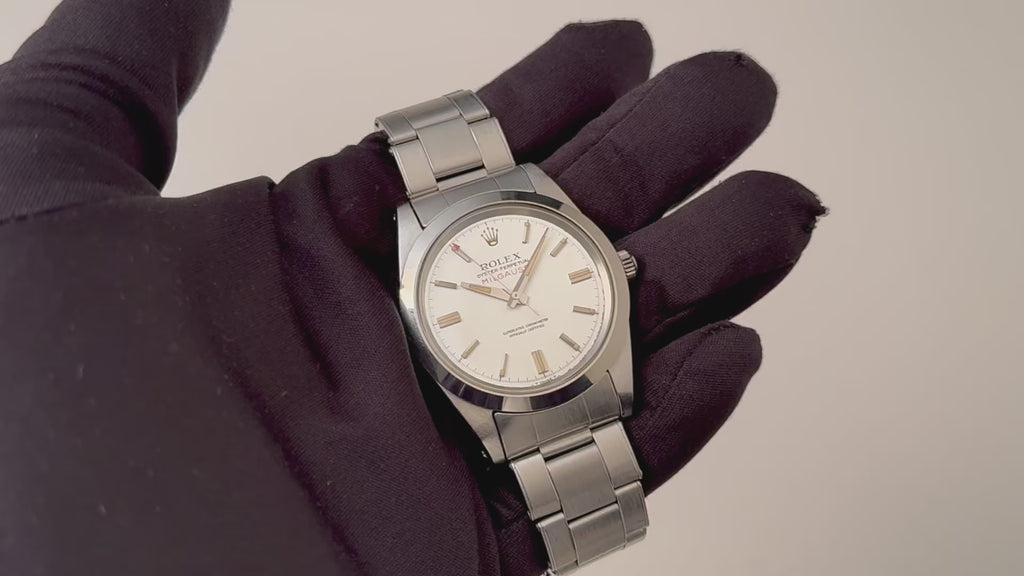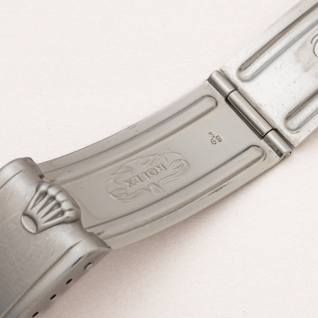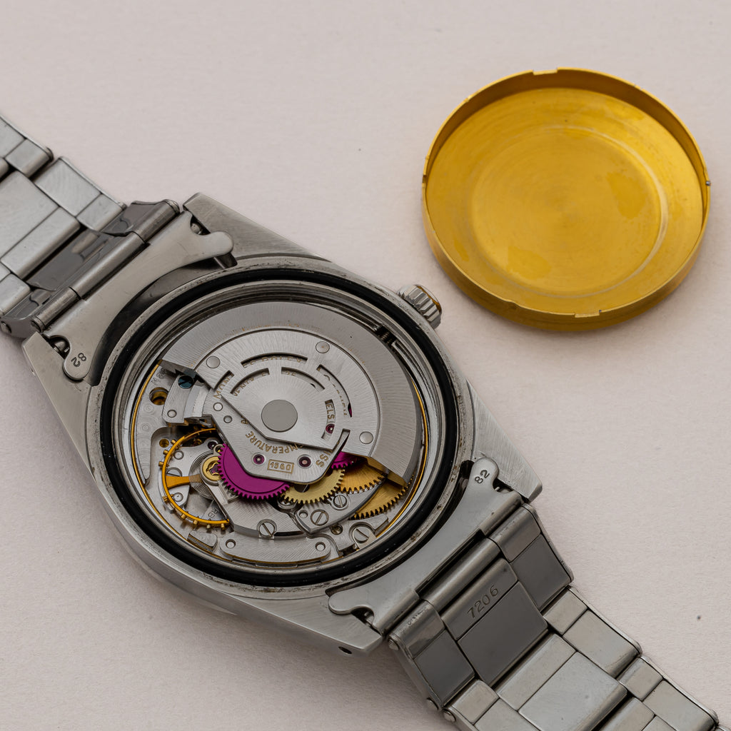 1970年製の希少耐磁モデル「ミルガウス」Ref.1019です。シルバーダイアルは前期型の特徴である0.2秒ピッチの細かい刻みに縦のヘアラインが入る仕様です。コンディションも抜群で文字盤と針共にオリジナルの夜光塗料が欠落する事なく残っています。帯磁時計らしい重厚なオイスターケースは、シャープな状態のベゼルにダメージの少ないミドルケースと良好な状態です。裏蓋を開けると十字の板バネが付いており、帯磁のインナーケースがムーブメントを覆っています。ムーブメントは5.5振動のミルガウス専用キャリバー1580を搭載、Mで始まるムーブメントシリアルが刻印され、キズやサビもない綺麗な状態です。ミルガウスやサブなどロレックスの中でも特に重厚なオイスターケース用の貴重な69年製のリベットブレス7206/FF82が装着されています。
