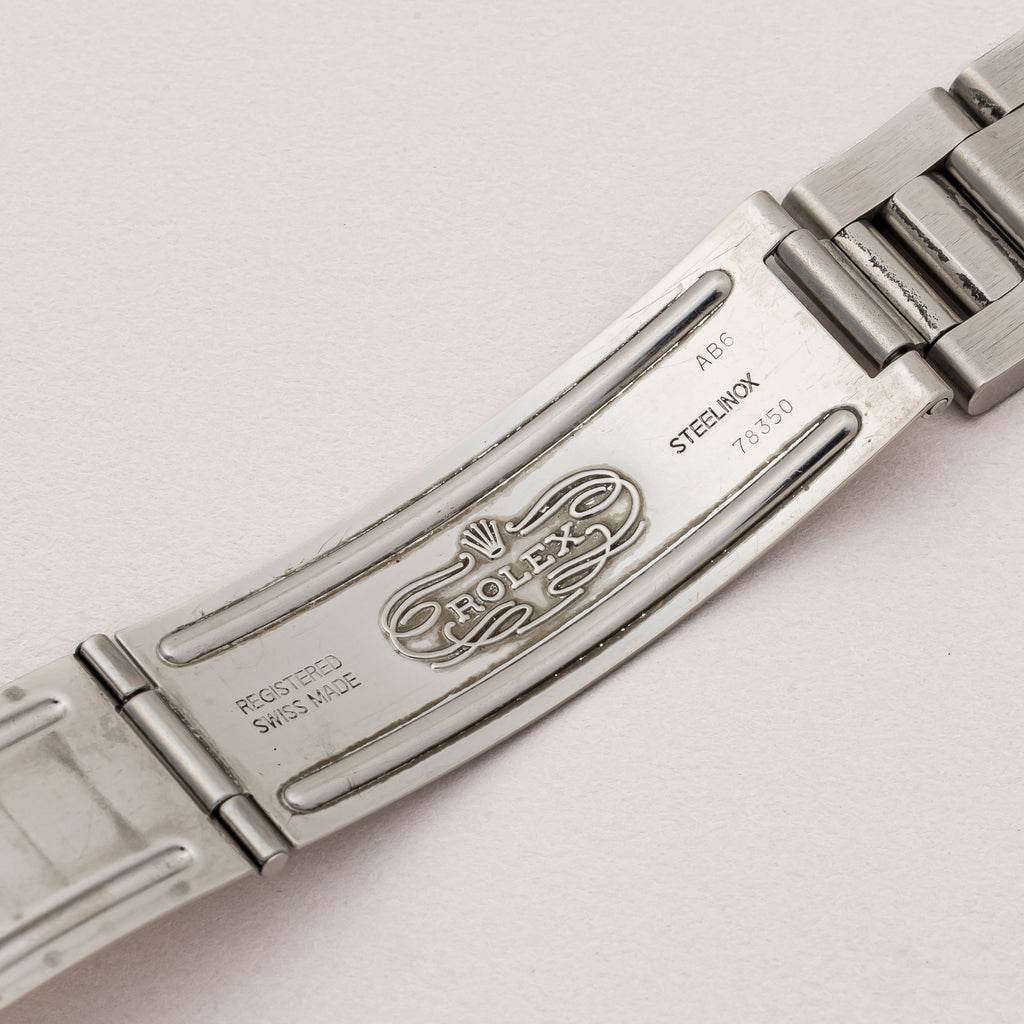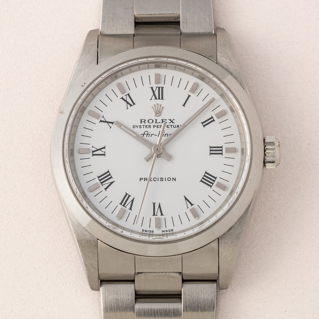 ロレックス 2000年製 エアキング Ref.14000 ホワイトローマンダイヤルです。ノンデイトで使いやすく人気のホワイトローマンダイヤルが上品な印象です。ムーブメントはRef.14270(エクスプローラーⅠ)にも搭載されているCal.3000を搭載しています。ケースは小傷程度で大きなダメージはございません。ベルトは純正ステンレスブレス78350 / FF557Bが取り付けてあります。手巻きや針回し、ねじ込みリューズの操作はスムースです。こちらは分解掃除済みです。