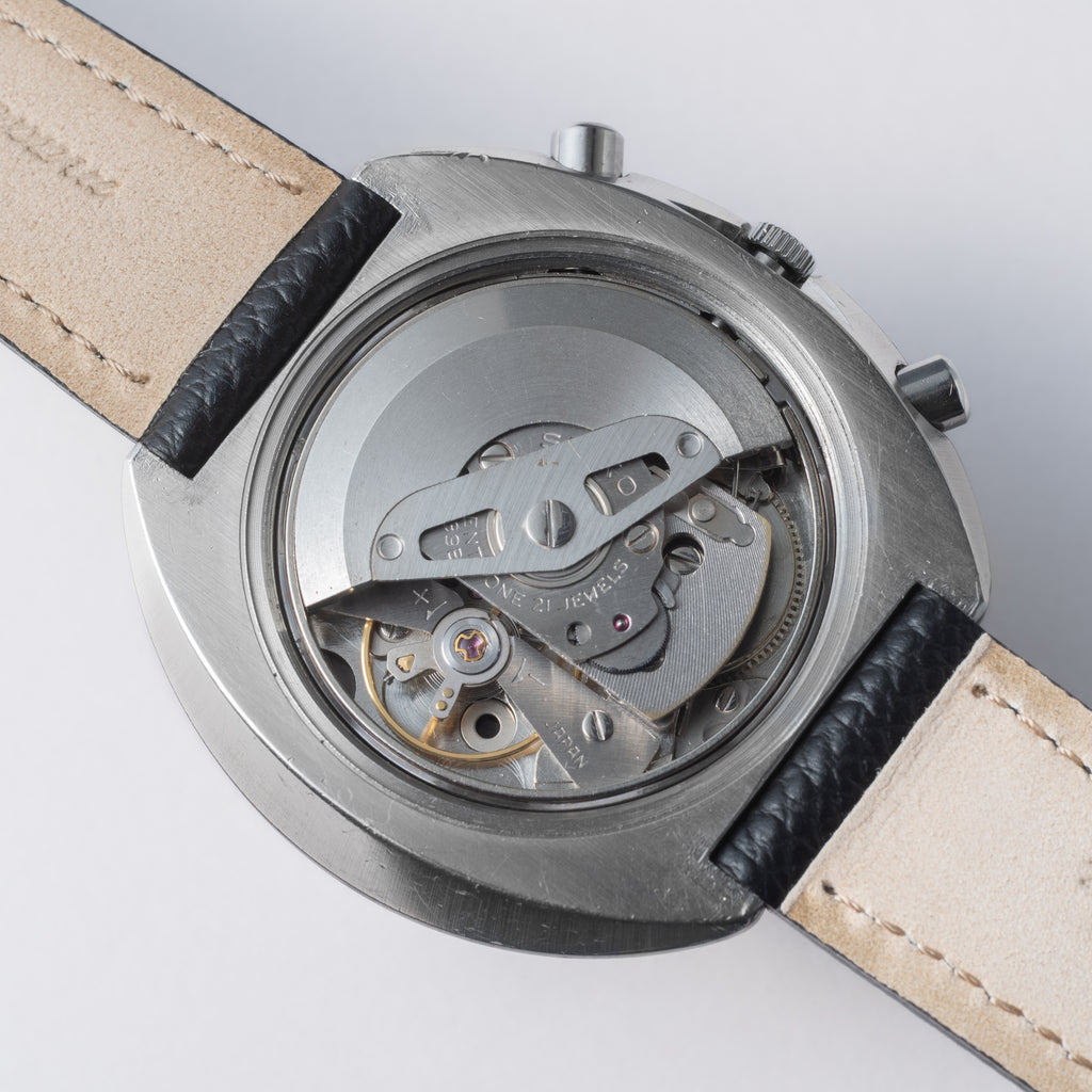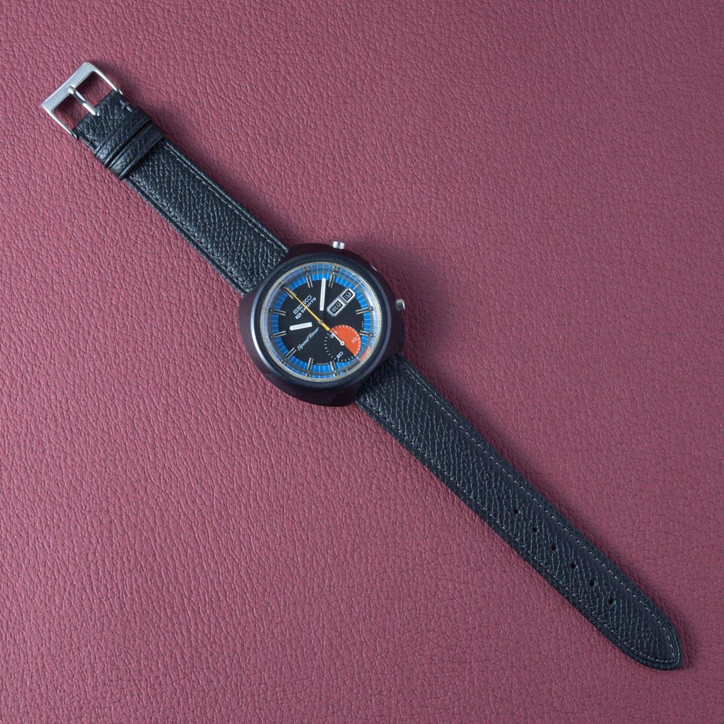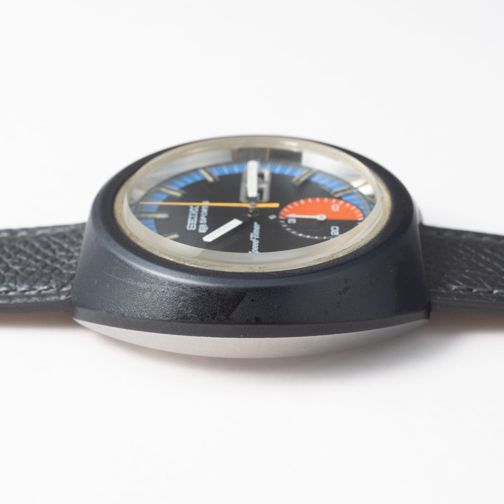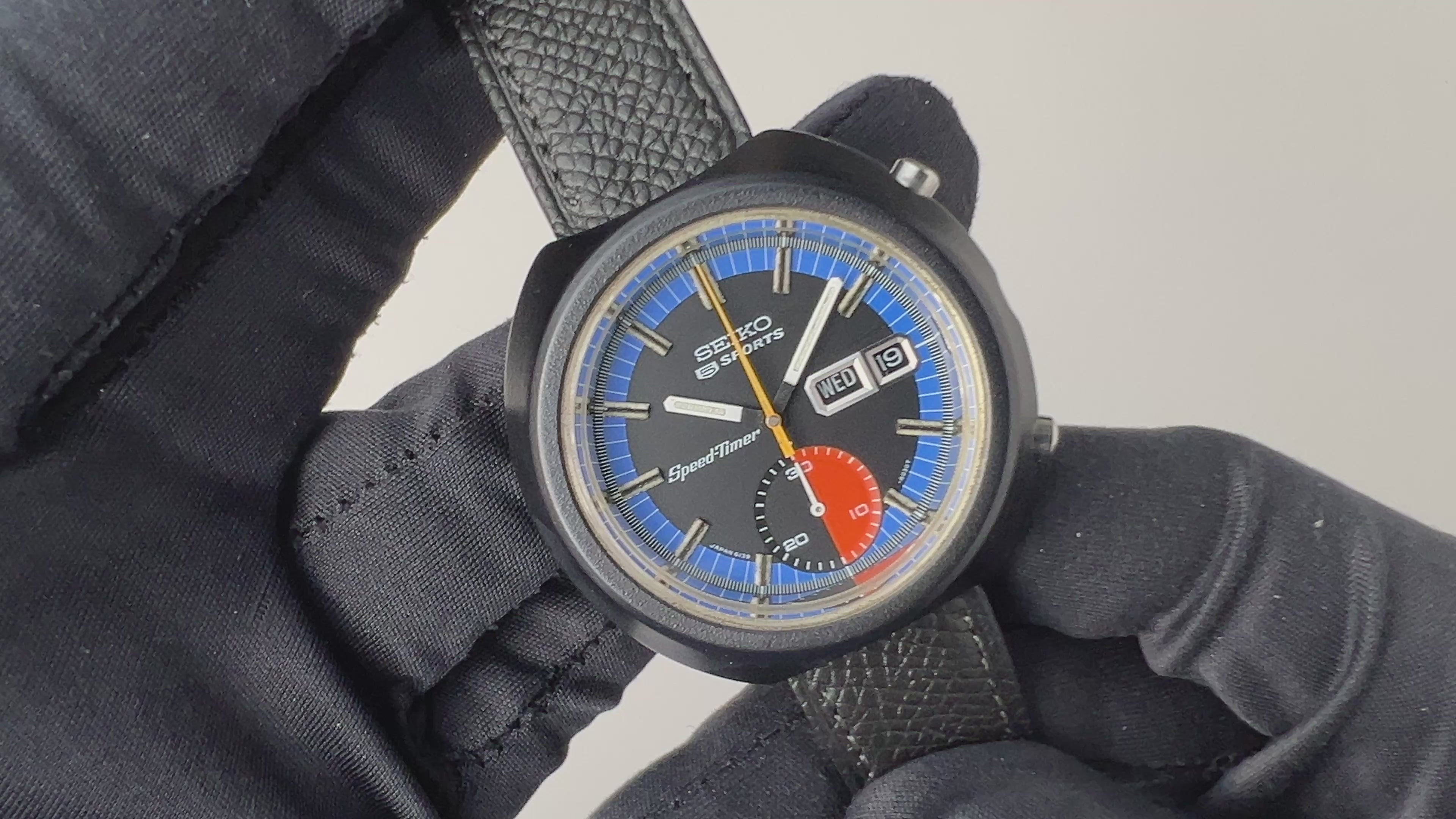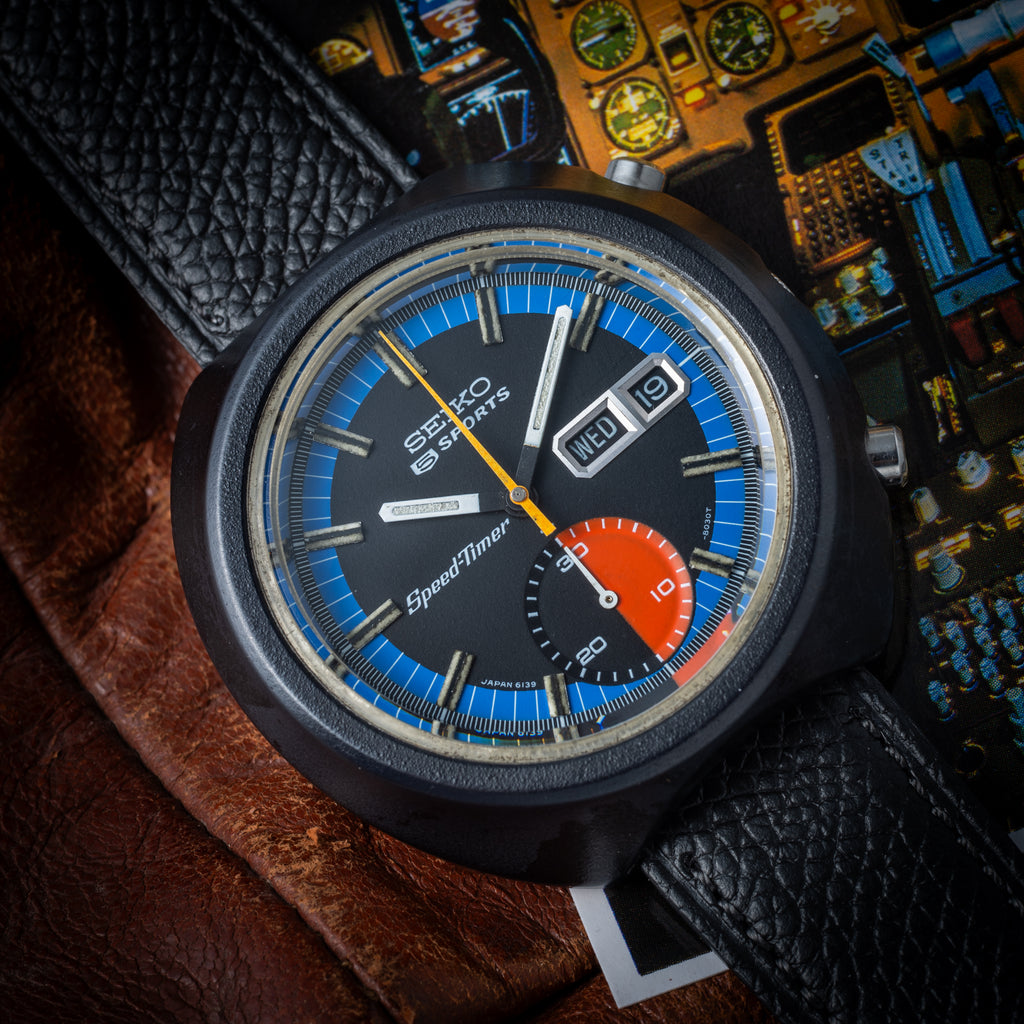 セイコー 5スポーツ スピードタイマー 1972年製 NSBケース 自動巻クロノグラフ Ref.6139-8010です。ブラックコーティングされたケースにブルーとブラックのツートンダイヤル、30分計はオレンジとブラックに色分けされた70年代らしいデザインになっています。世界初の自動巻きクロノグラフの一つとされるCal.6139を搭載しています。文字盤はシミ等無く綺麗です。ケースのコーティングも剝がれが無く綺麗な状態です。ベルトは社外のカーフが取り付けられています。こちらの時計は分解掃除済みです。