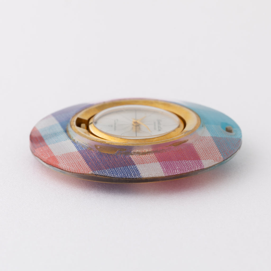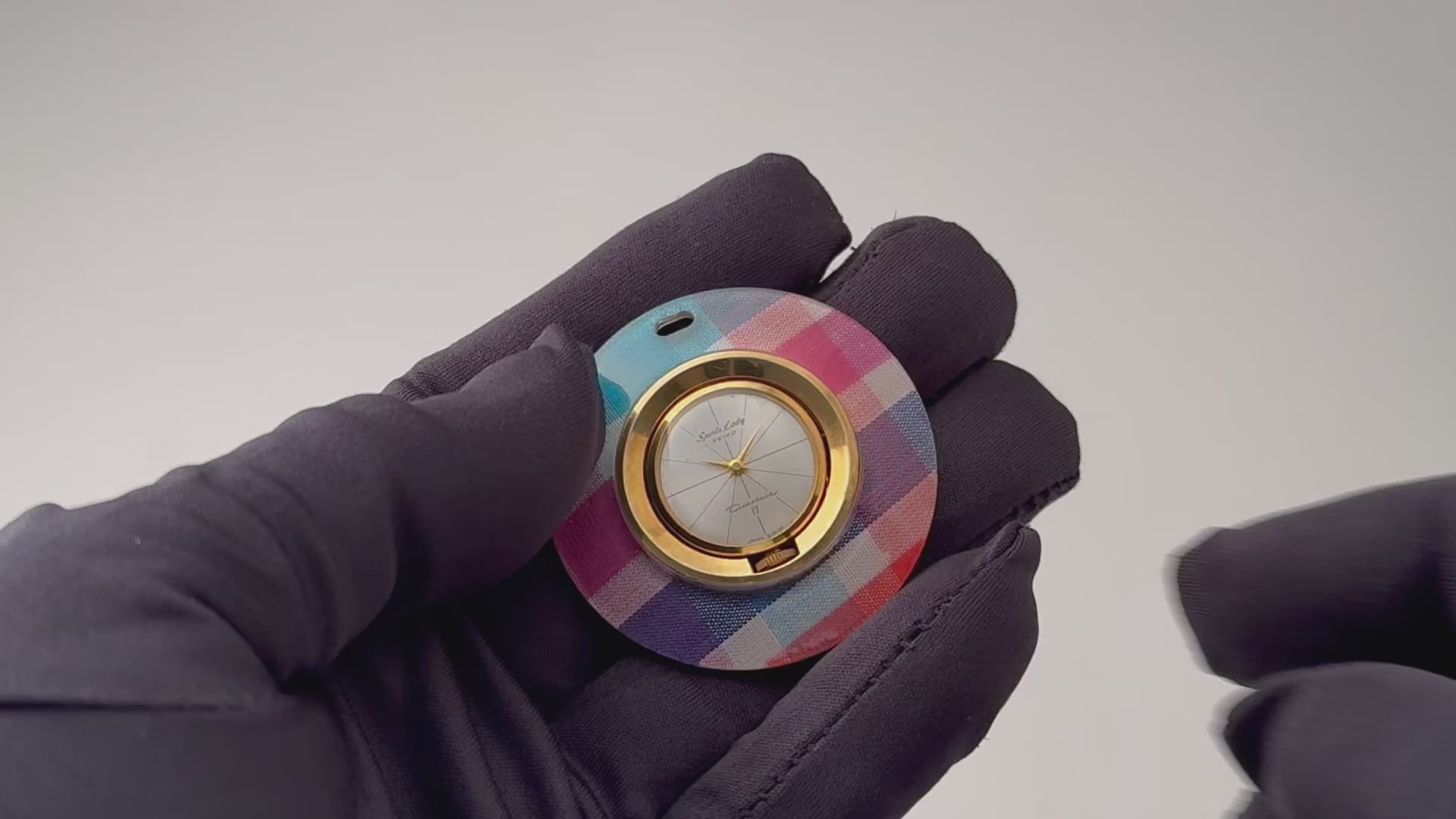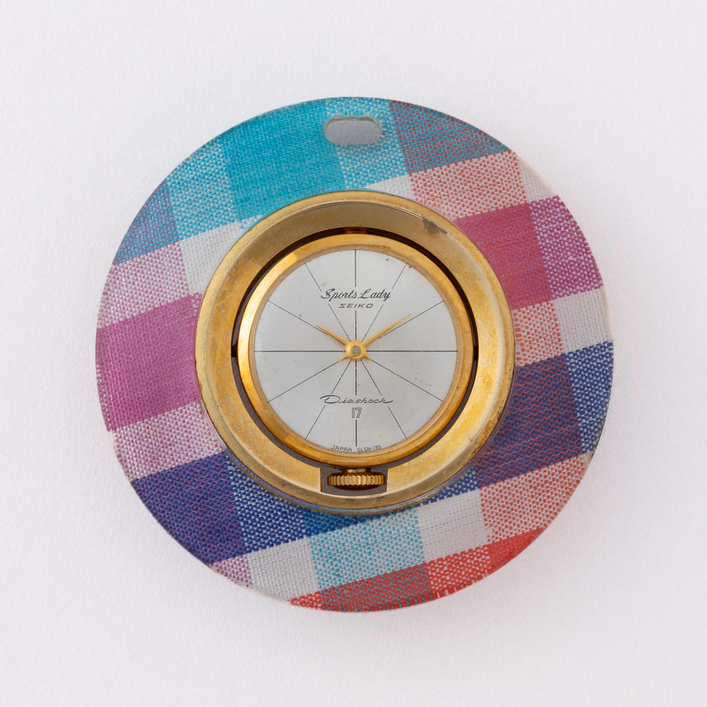 セイコー スポーツレディ ペンダントウォッチ 1960年代製です。カラフルなチェック柄の外周がユニークなペンダントウォッチです。1960年代らしい手巻きモデルで12分割された文字盤もお洒落です。文字盤は表面の劣化が見られます。ケースは小傷が見られますが大きなダメージはありません。手巻きや針回しの操作はスムースです。