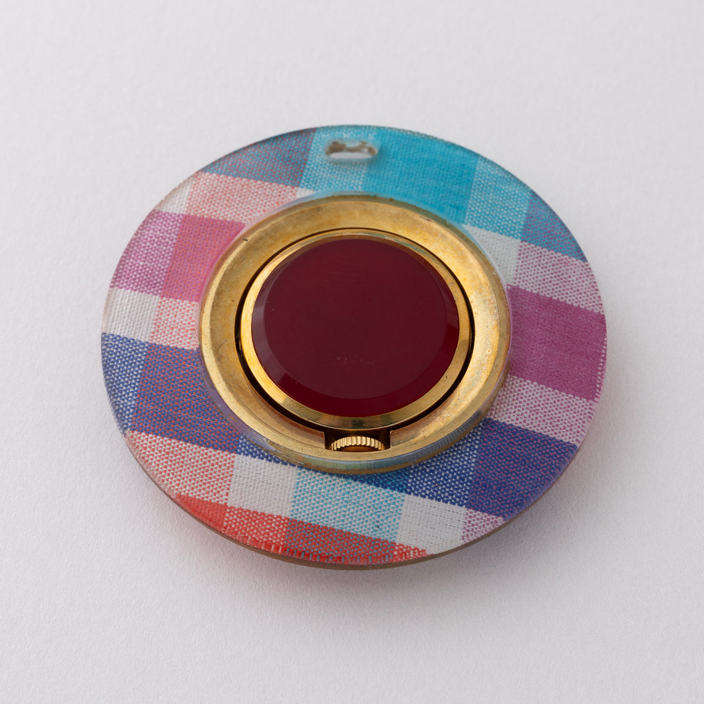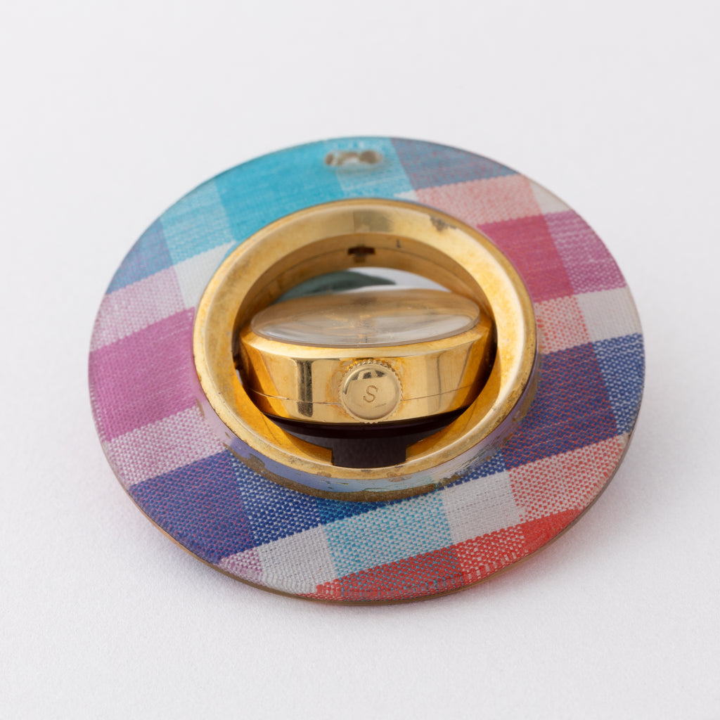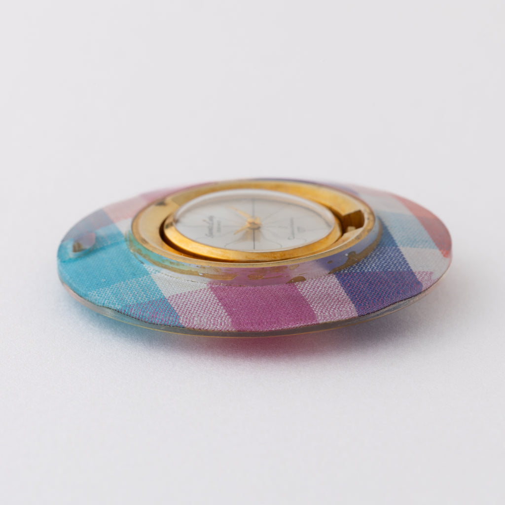 セイコー スポーツレディ ペンダントウォッチ 1960年代製です。カラフルなチェック柄の外周がユニークなペンダントウォッチです。1960年代らしい手巻きモデルで12分割された文字盤もお洒落です。文字盤は表面の劣化が見られます。ケースは小傷が見られますが大きなダメージはありません。手巻きや針回しの操作はスムースです。