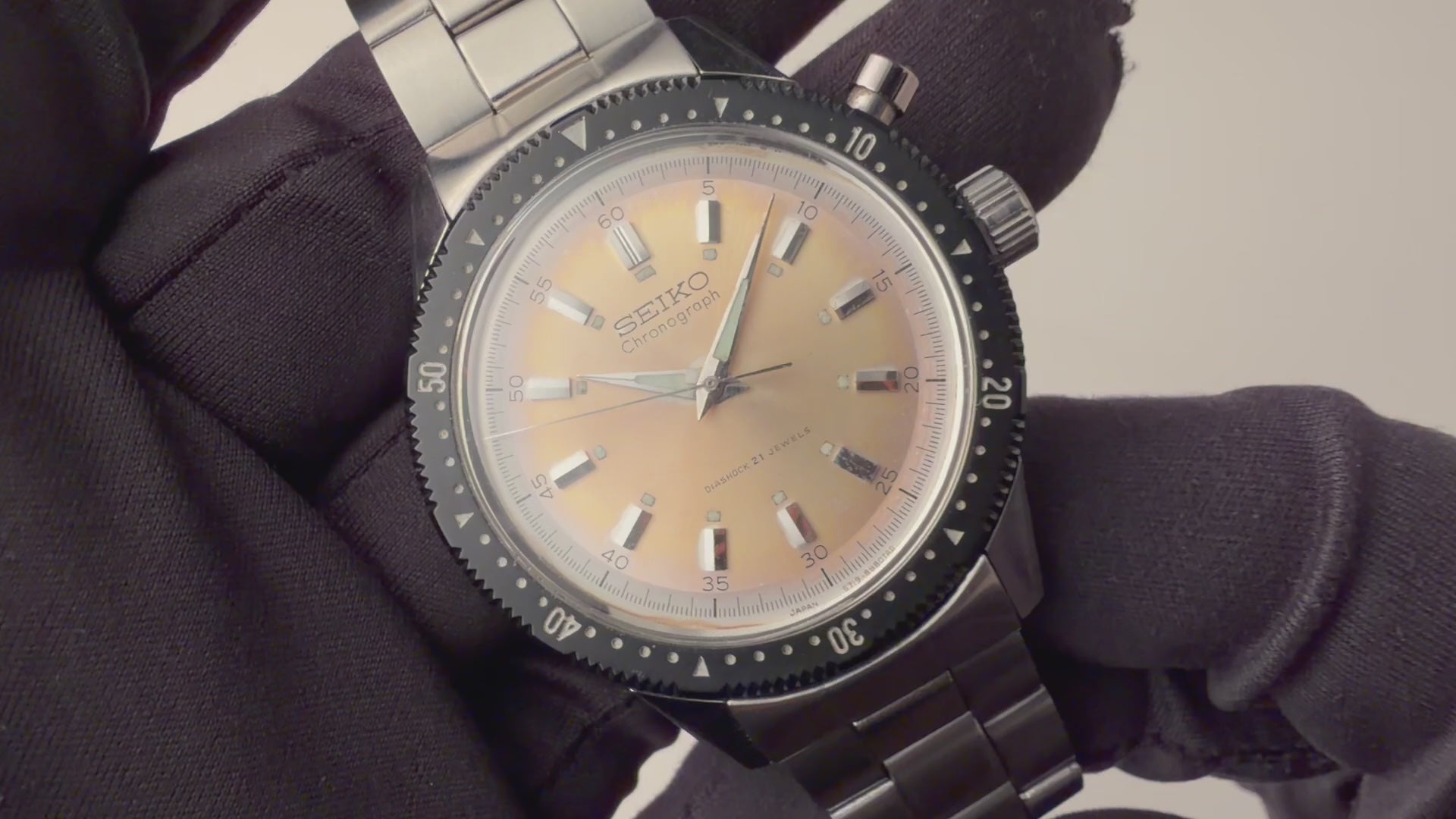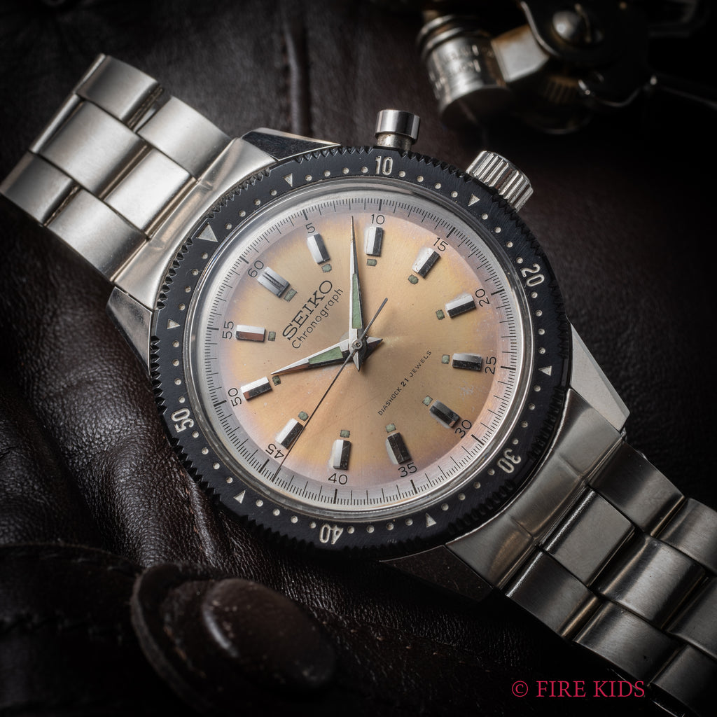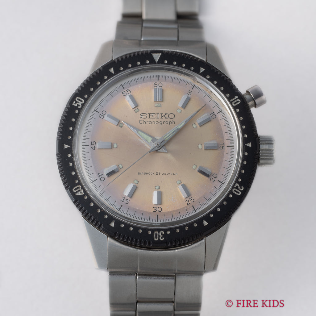 1968年製のセイコーワンプッシュクロノグラフ最後期型 手巻きモデル ニアミントコンディションです。回転ベゼルがついたワンプッシュクロノグラフで、2時位置のプッシュボタンでクロノグラフを操作します。文字盤はパティーナダイアル。ケースは小傷がありますがラグの面取りがしっかりと残っています。ムーブメントは手巻きのCal.5719Aを搭載、手巻きや針回し、クロノグラフやベゼルの操作はスムースです。ベルトは純正のステンレスブレスが装着されています。