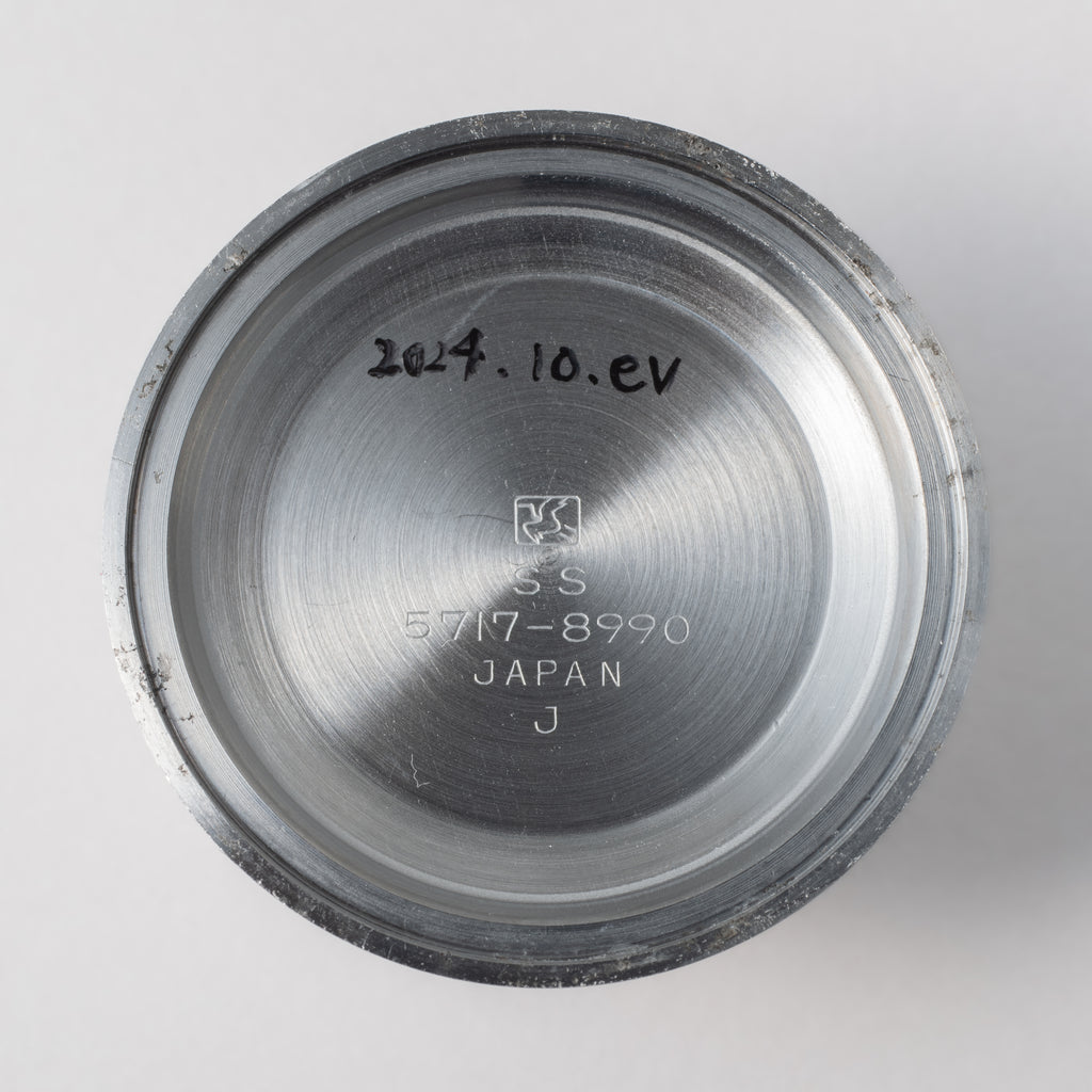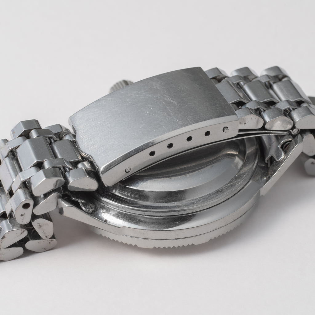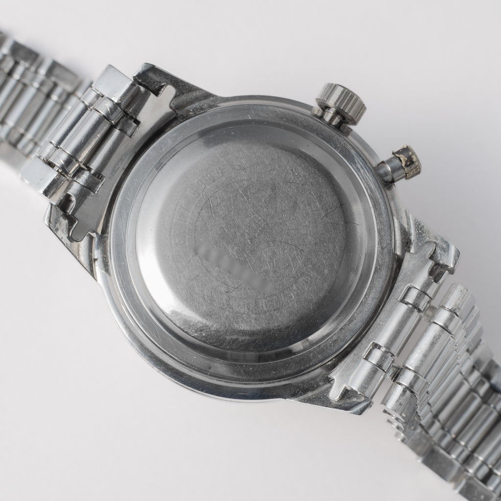 1964年製のセイコーワンプッシュクロノグラフ 後期 ステンレスベゼル手巻きモデルです。回転ベゼルがついたワンプッシュクロノグラフで、国産初のクロノグラフとしても知られ2時位置のプッシュボタンでクロノグラフを操作します。ムーブメントは手巻きのCal.5717Aを搭載、カレンダーのクイックチェンジ機能付きです。文字盤は肉眼で綺麗なコンディションを維持しています。ケースは年代なりの小傷はありますが大きなダメージはありません。裏蓋の元々薄いタツノオトシゴ刻印も視認できます。ベルトは純正ブレスが付いています。こちらは分解掃除済みです。