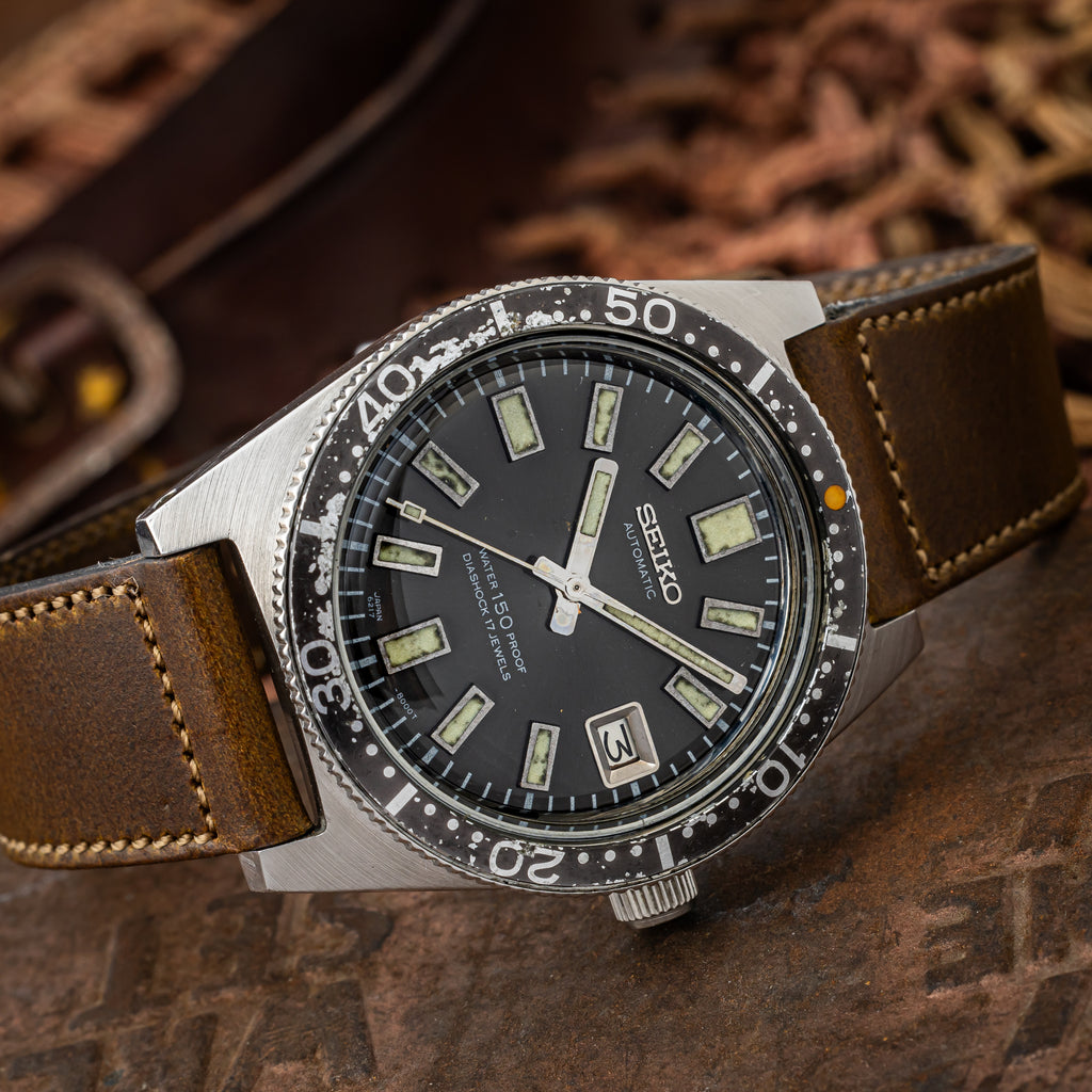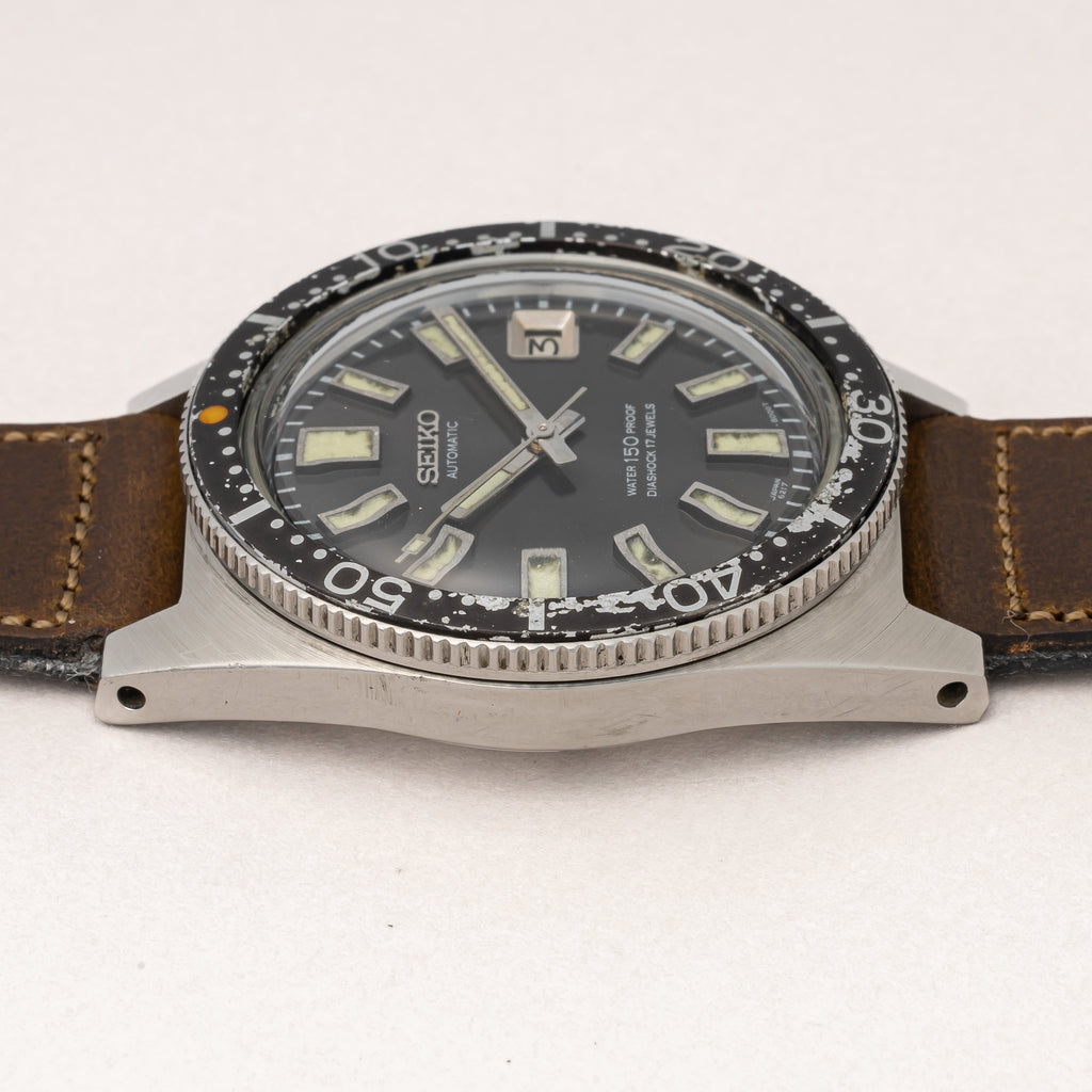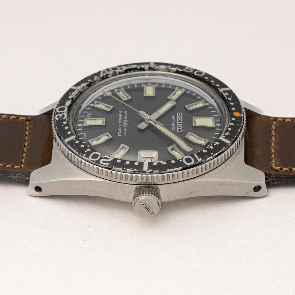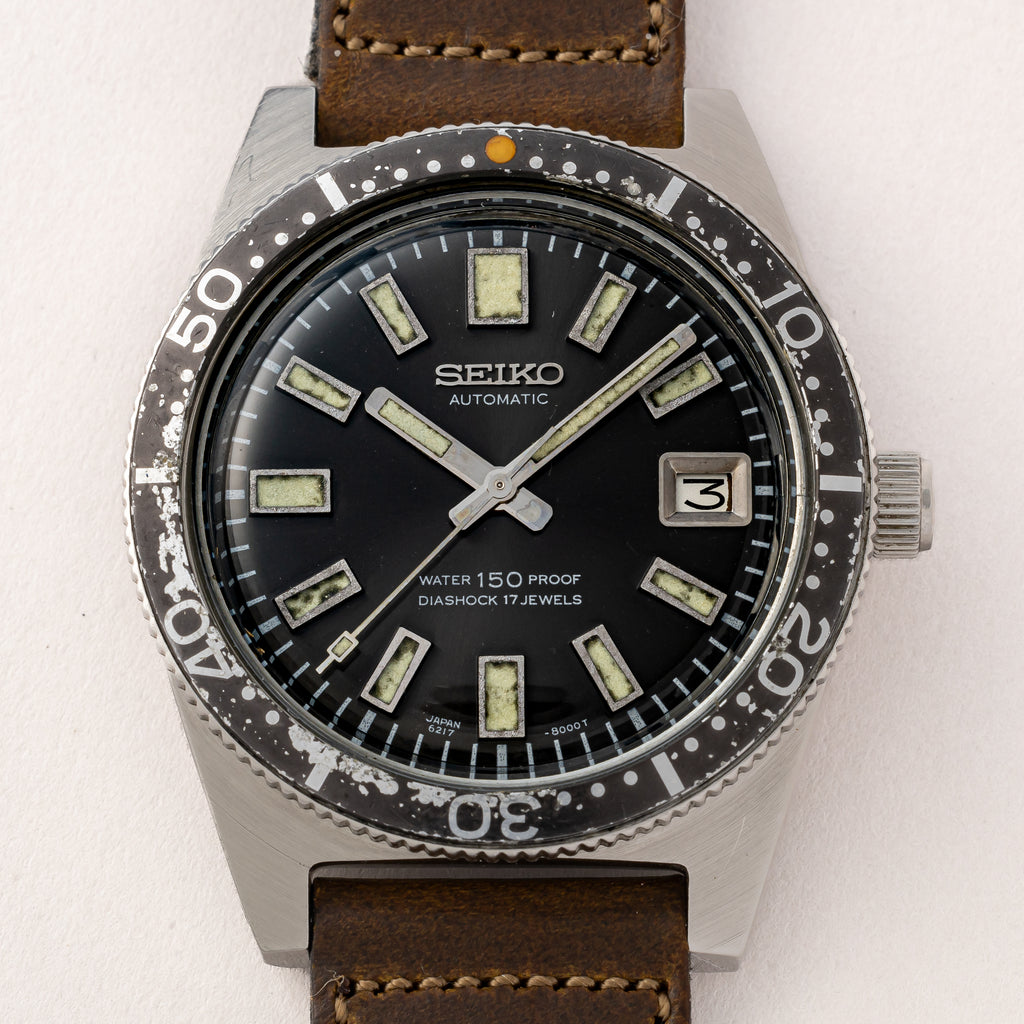 1965年製のセイコー1stダイバーです。国産初のダイバーズウオッチ150mダイバーファーストモデルの6217-8000です。1965年4月から製造されてるファーストダイバーですがこちらは初期型でわずか数か月しか製造していない希少モデルです。違いとしては後期型と比べてリューズの大きさに違いがございます。ムーブメントは自動巻きのCal.6217Aを搭載。文字盤はキレイな状態です。ケースやベゼルは小傷はございますが大きなダメージはございません。ベルトはヴィンテージモデルに相性抜群な「Accurate Form(アキュレイトフォルム)」のレザーベルトを装着しています。こちらはオーバーホール済みです。