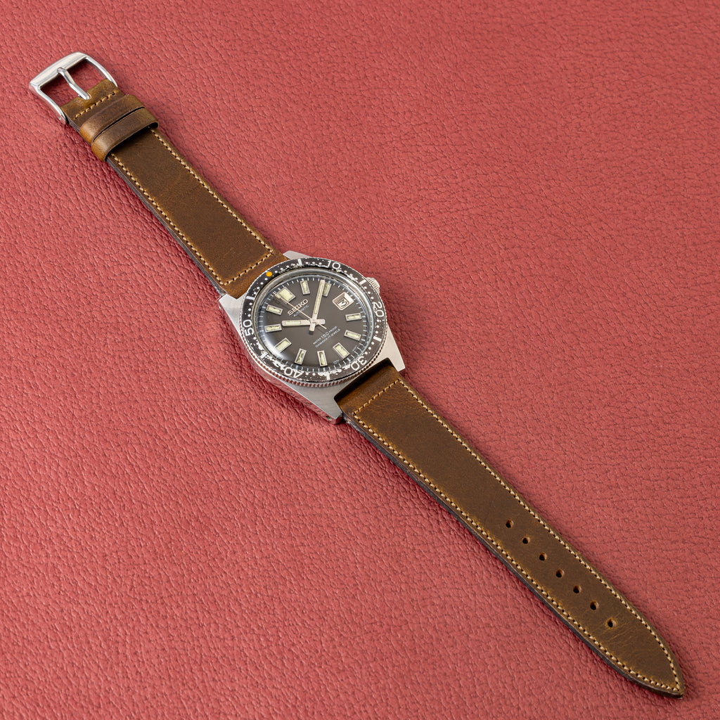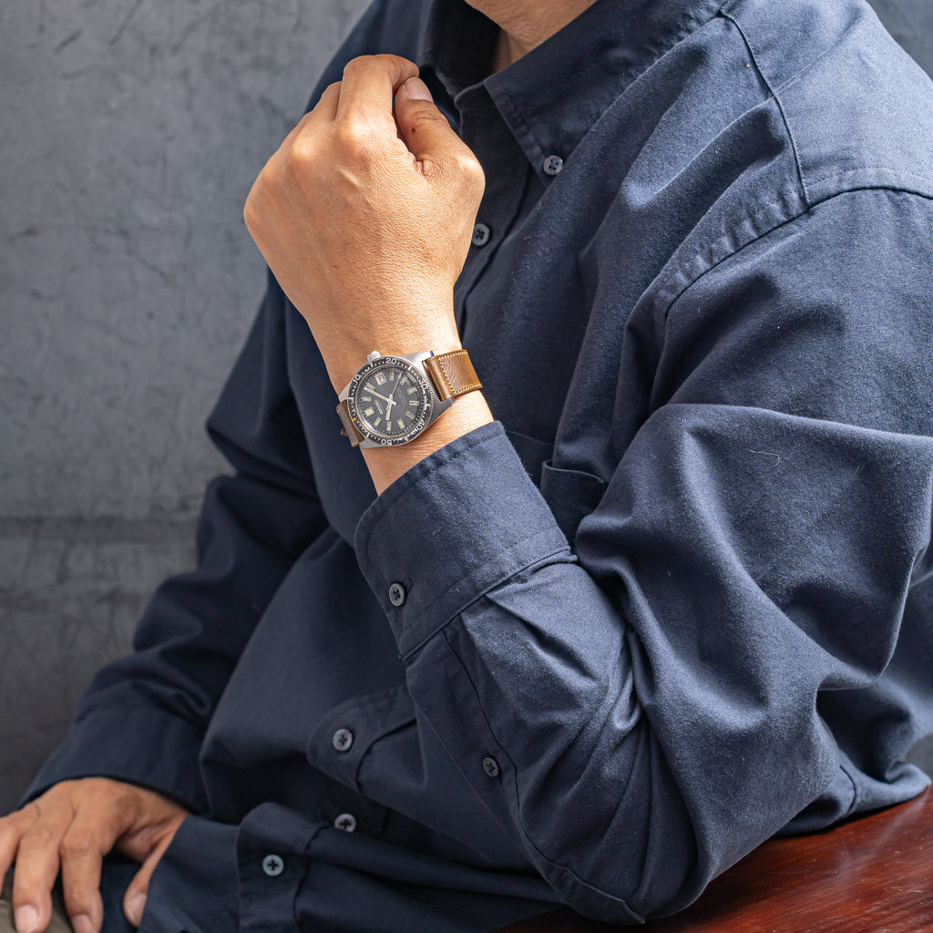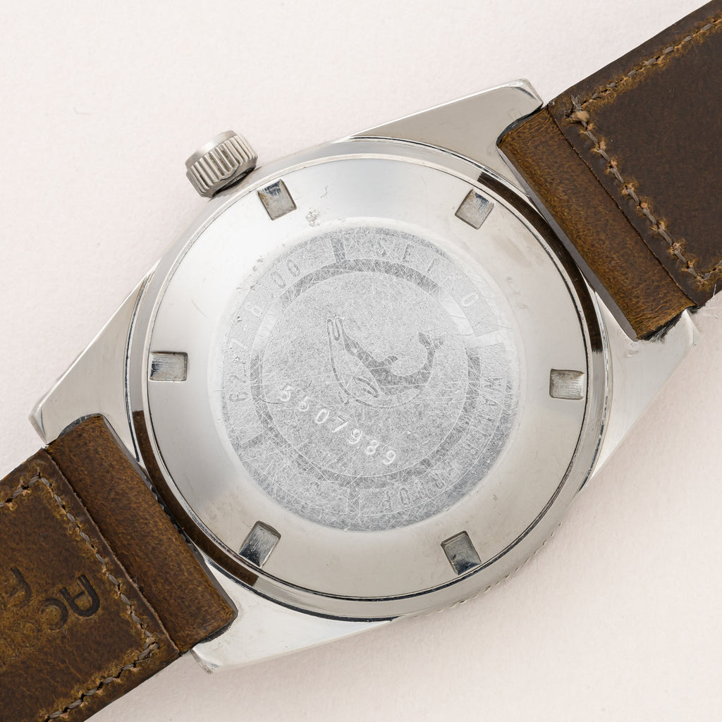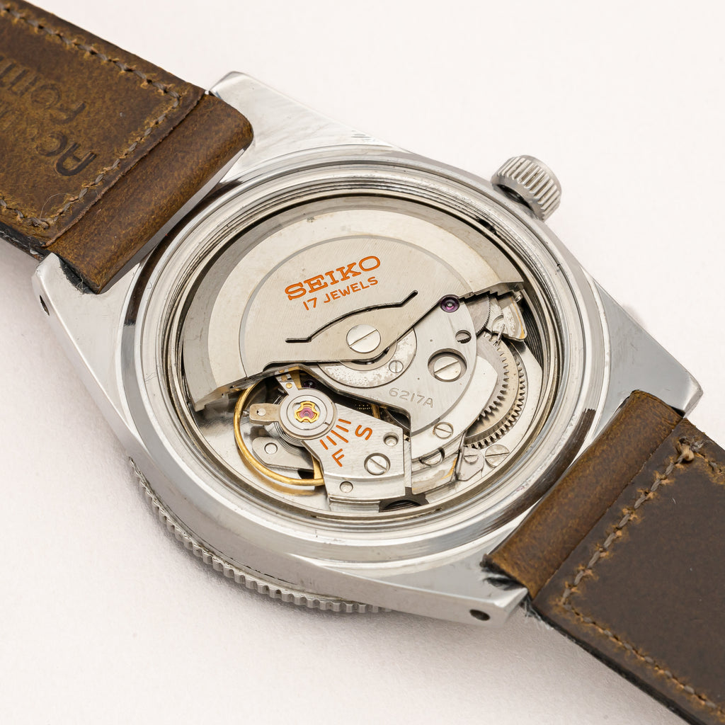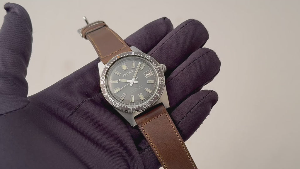 1965年製のセイコー1stダイバーです。国産初のダイバーズウオッチ150mダイバーファーストモデルの6217-8000です。1965年4月から製造されてるファーストダイバーですがこちらは初期型でわずか数か月しか製造していない希少モデルです。違いとしては後期型と比べてリューズの大きさに違いがございます。ムーブメントは自動巻きのCal.6217Aを搭載。文字盤はキレイな状態です。ケースやベゼルは小傷はございますが大きなダメージはございません。ベルトはヴィンテージモデルに相性抜群な「Accurate Form(アキュレイトフォルム)」のレザーベルトを装着しています。こちらはオーバーホール済みです。