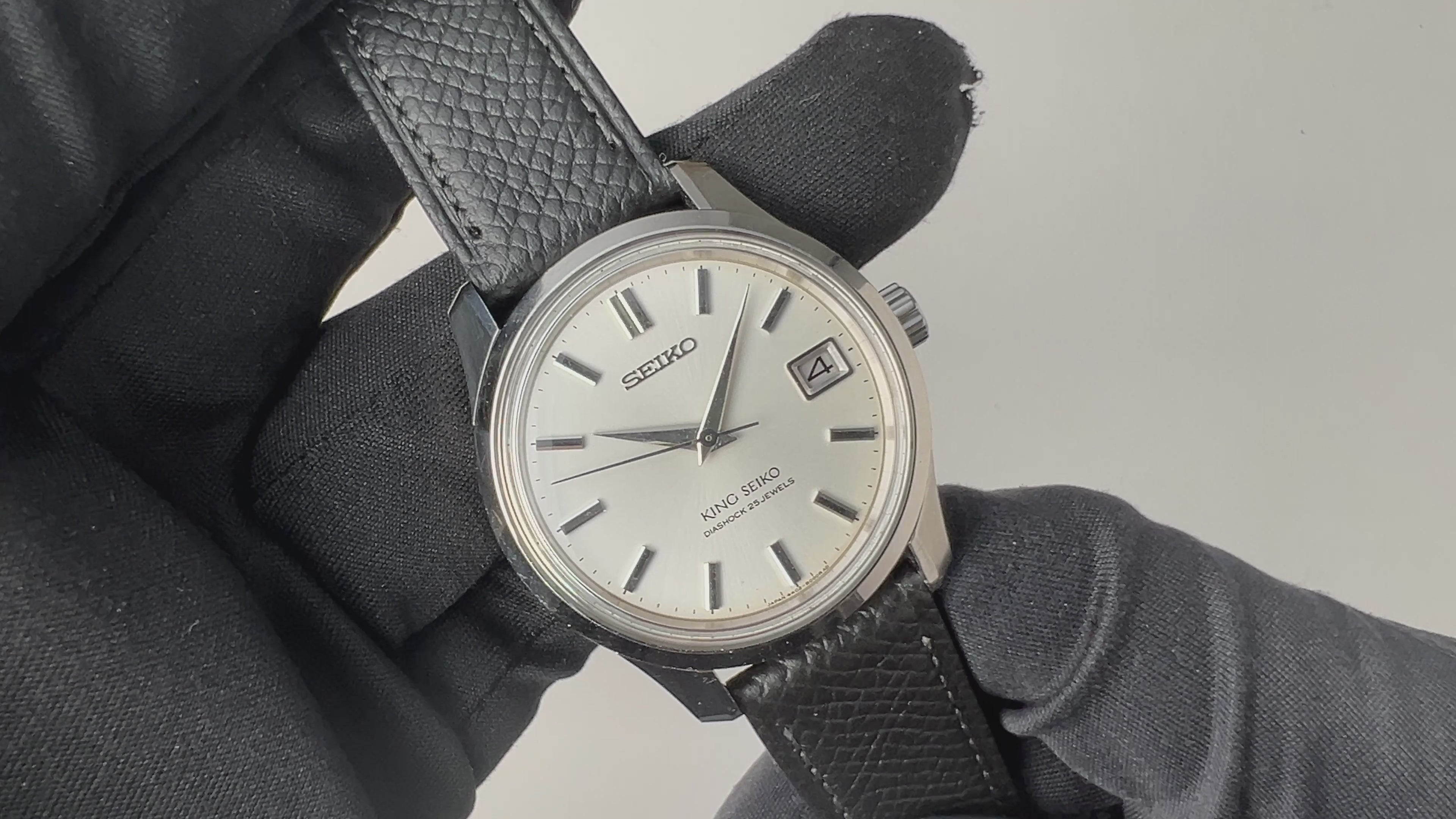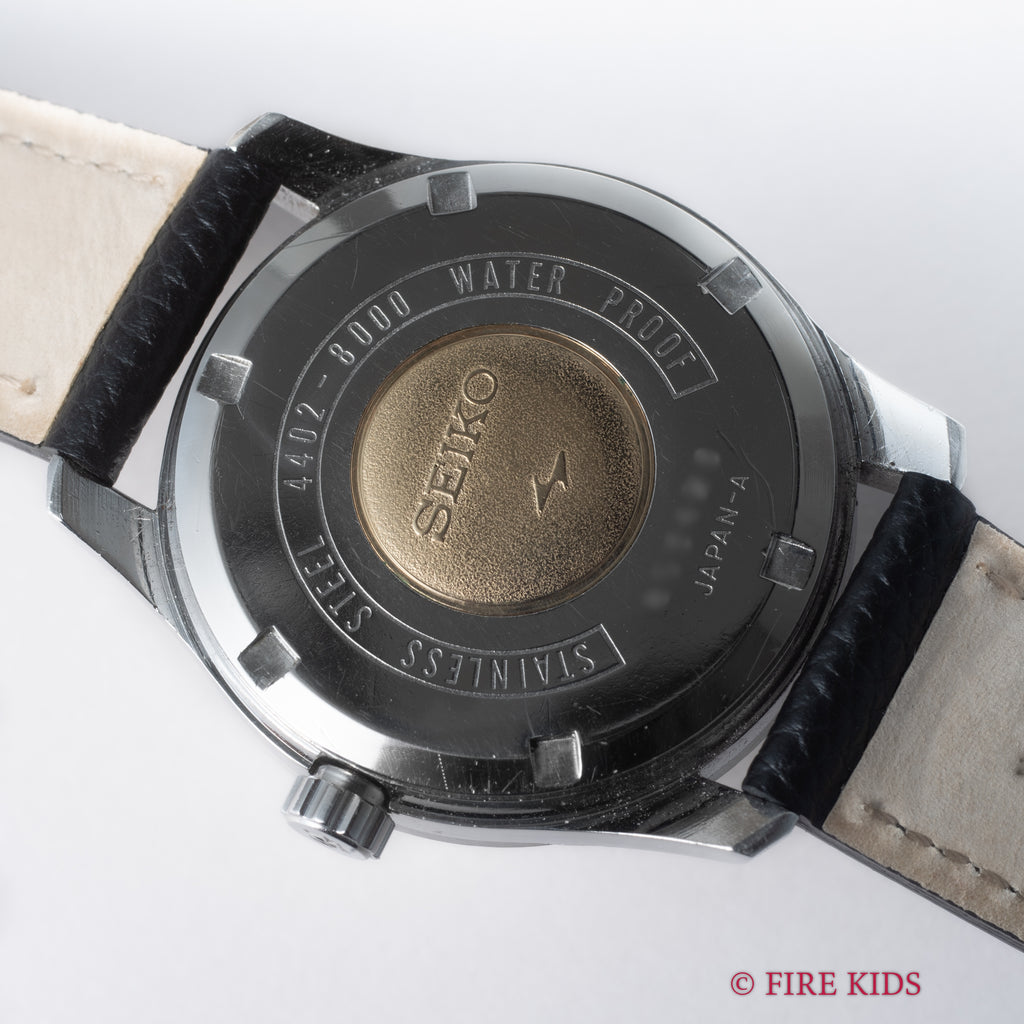キングセイコー 1968年製 Ref.4402-8000 44KSが入荷しました。ファーストモデルから進化して防水スクリューバックになり秒針規制装置を採用しています。シルバーの文字盤にアップライトバーインデックスとセイコーらしい精悍な太いドルフィン針が使われた逸品です。文字盤は肉眼で綺麗な状態を維持しており、ケースは小傷はありますが大きなダメージはなくメダリオンもしっかり残っています。機械は手巻きのハック機能(秒針規制)にカレンダー早送りを備えたCal.4402Aを搭載し、手巻きや針回しのファンクションは問題ありません。裏ブタのセイコーメダリオンは健在です。ベルトは社外の革ベルトを合わせています。