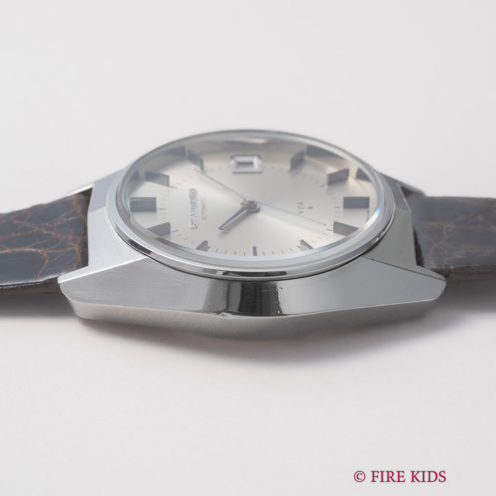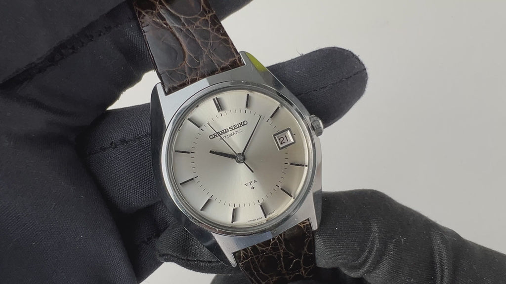 1970年製/昭和45年製のグランドセイコーV.F.Aです。諏訪セイコーから製造された当時月差±1分以内という超高精度の調整が施された特別調整品(Very Fine Adjusted)です。ムーブメントは10振動(36000振動)で自動巻きのCal.6185Aを搭載。ケースは小傷はありますが大きなダメージはありません。文字盤は肉眼で綺麗なコンディションを維持しています。手巻きや針回しの操作はスムースです。ベルトは社外クロコダイル革ベルトが取り付けられています。こちらは分解掃除済みです。