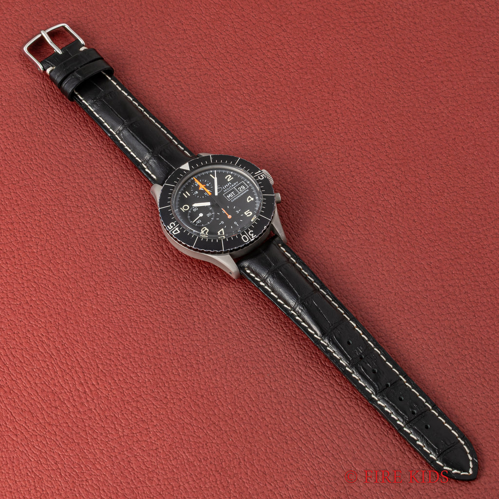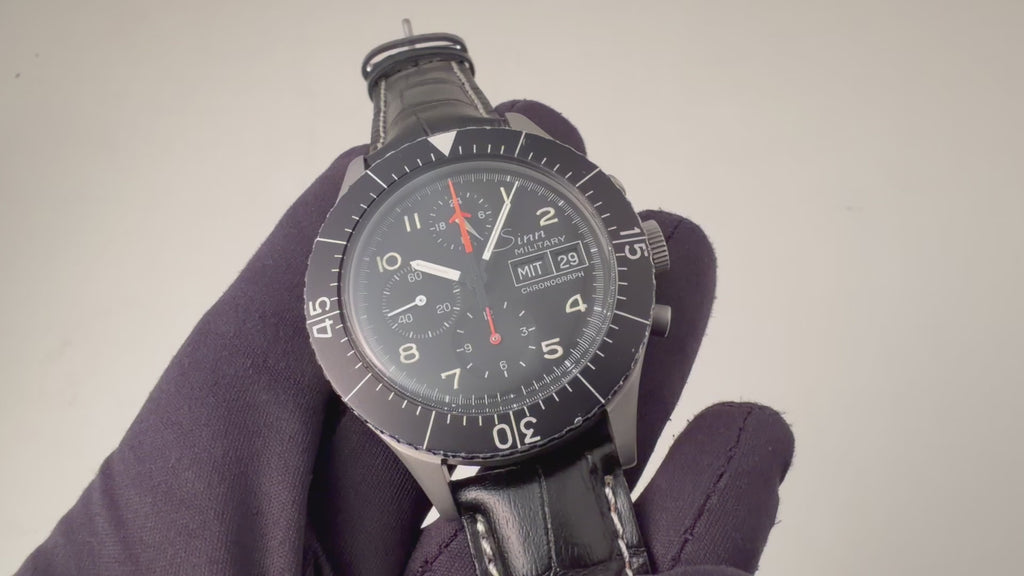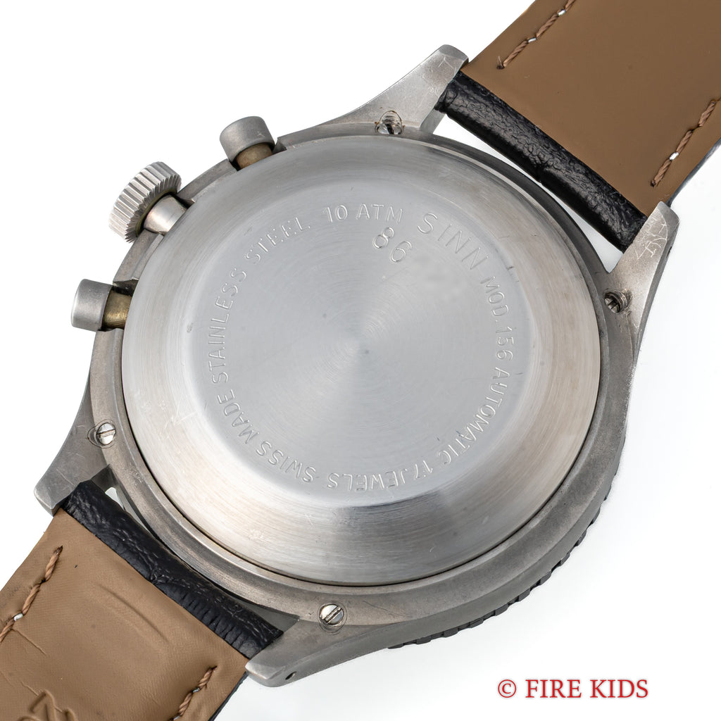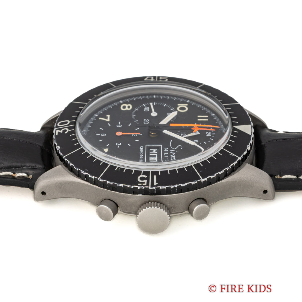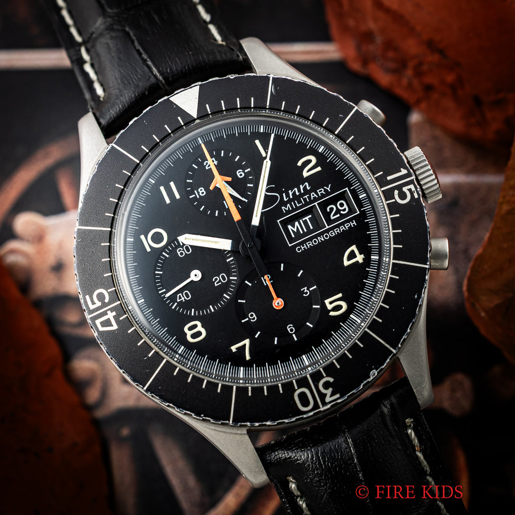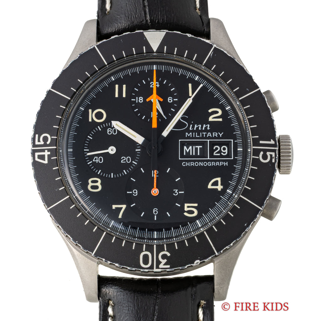 1990年代 Sinnのミリタリークロノグラフです。Sinnはドイツ軍のパイロット、飛行教官であったへルームート・ジンが1961年に設立したブランドで、視認性、機能性を最重要視したパイロットクロノグラフは高い評価を得ています。マットブラックのダイヤルは、オリジナルの夜光塗料が残る良いコンディションです。インダイヤルは12時位置が24時間表示、9時位置が永久秒針、6時位置が12時間積算計、センターにクロノグラフ秒針と60分積算計が配置されております。ケースは、コンディションが良く、ベゼルにも気になるようなダメージはありません。ムーブメントは自動巻きのレマニア5100を搭載、巻き上げクロノグラフ作動もスムーズです。ベルトは社外の革ベルトが取り付けられています。こちらは分解掃除済みです。
