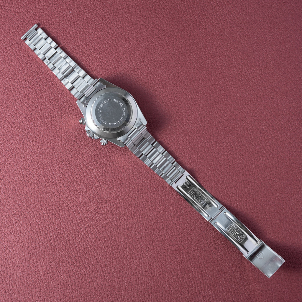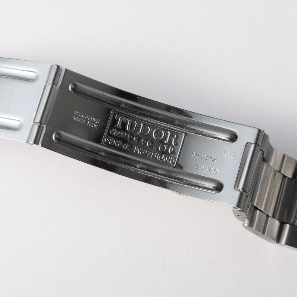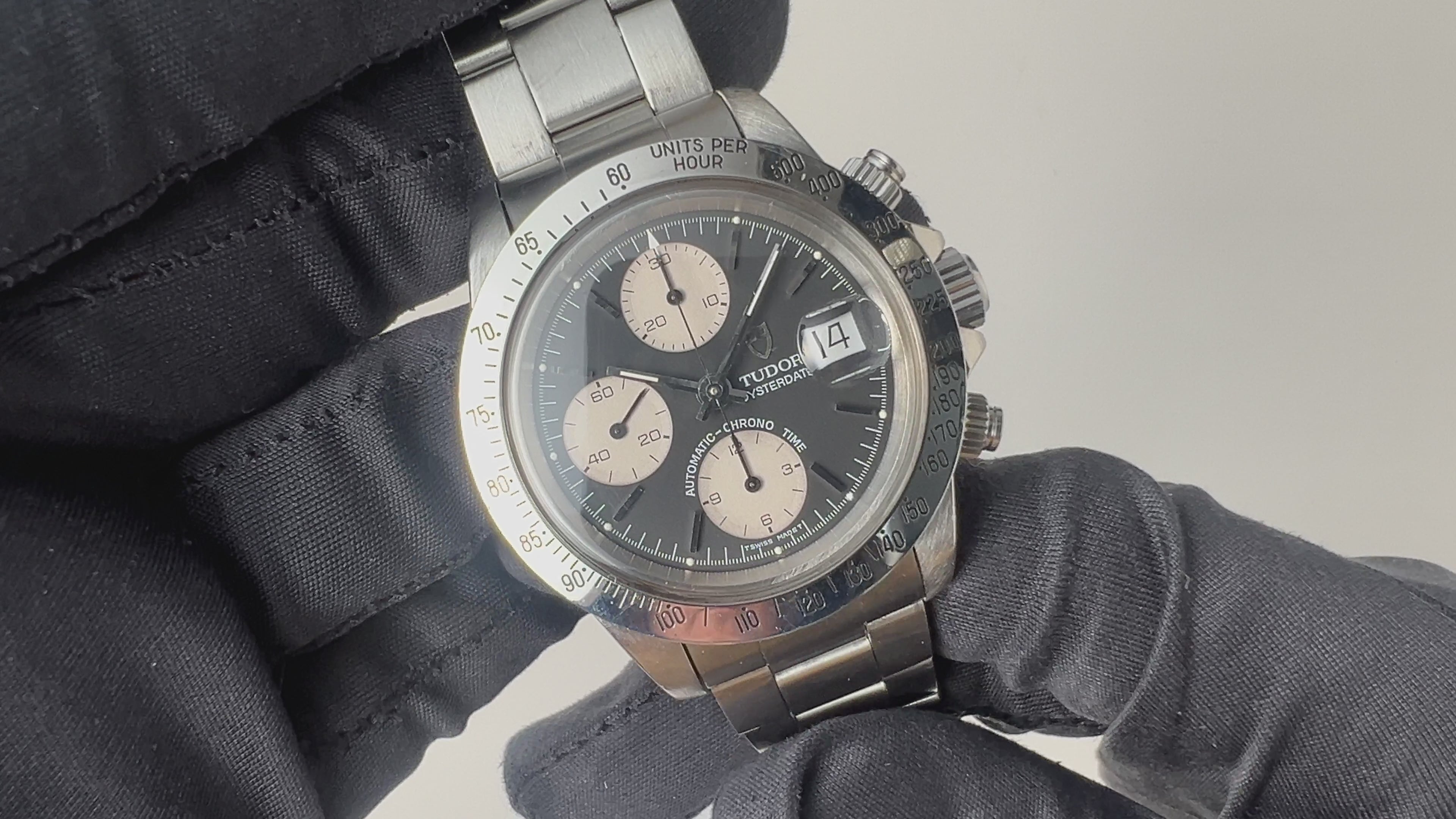 1994年製チューダー クロノタイムRef.79180です。かまぼこケースと呼ばれる分厚いオイスターケースは存在感抜群です。リューズはロレックスの王冠リューズが取り付けられています。文字盤は黒地に白目で人気の逆パンダダイヤルです。ケースは小キズが見られますが大きなダメージはありません。手巻きや針回し、ねじ込みやクロノグラフの操作はスムースです。ブレスは純正の3連78360/FF589が取付られています。こちらは分解掃除済みです。