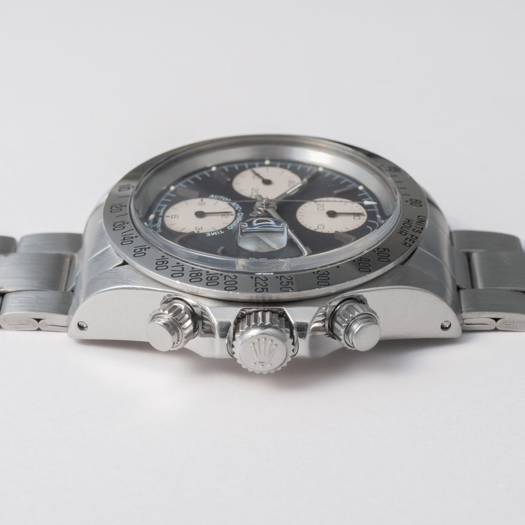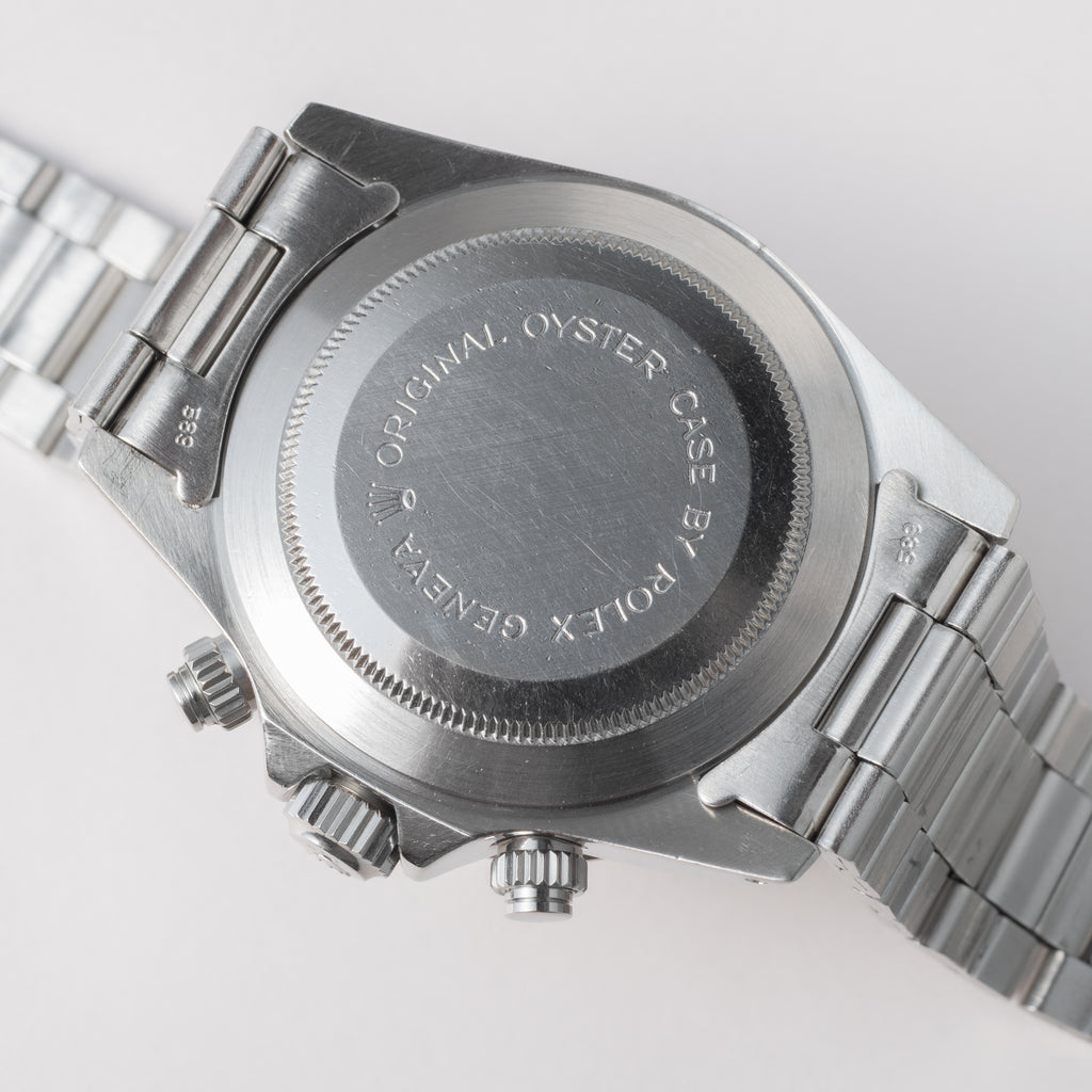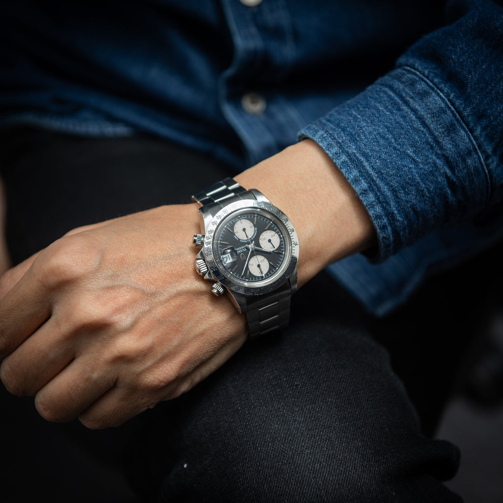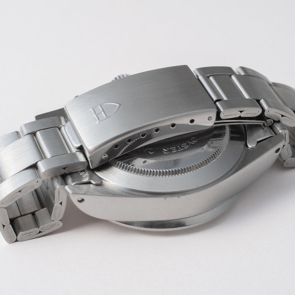 1994年製チューダー クロノタイムRef.79180です。かまぼこケースと呼ばれる分厚いオイスターケースは存在感抜群です。リューズはロレックスの王冠リューズが取り付けられています。文字盤は黒地に白目で人気の逆パンダダイヤルです。ケースは小キズが見られますが大きなダメージはありません。手巻きや針回し、ねじ込みやクロノグラフの操作はスムースです。ブレスは純正の3連78360/FF589が取付られています。こちらは分解掃除済みです。