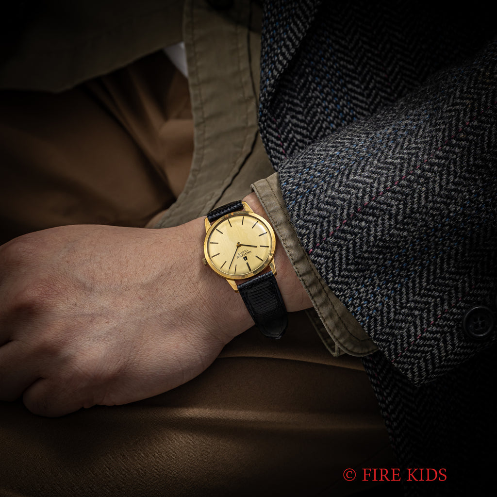 1970年代製のユニバーサルジュネーブ アルテッセ シャンパンダイヤルです。薄型のケースでドレッシーな印象です。ムーブメントは手巻きのCal.1-42を搭載。文字盤はシャンパンダイヤルにバーインデックスの組み合わせです。ケースは小傷程度で良い保存状態を保っています。手巻きや針回しの操作はスムーズです。ベルトは社外の革ベルトに純正尾錠が付いています。こちらの時計は分解掃除済みです。