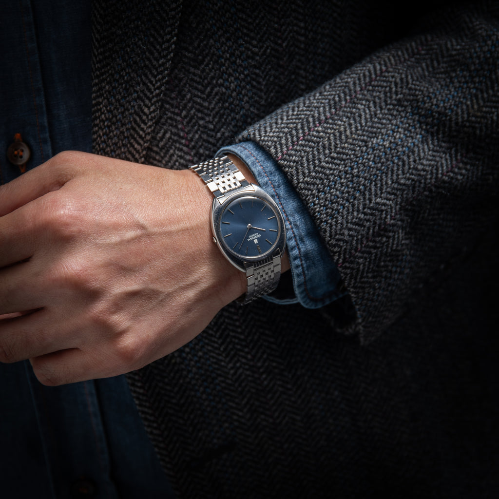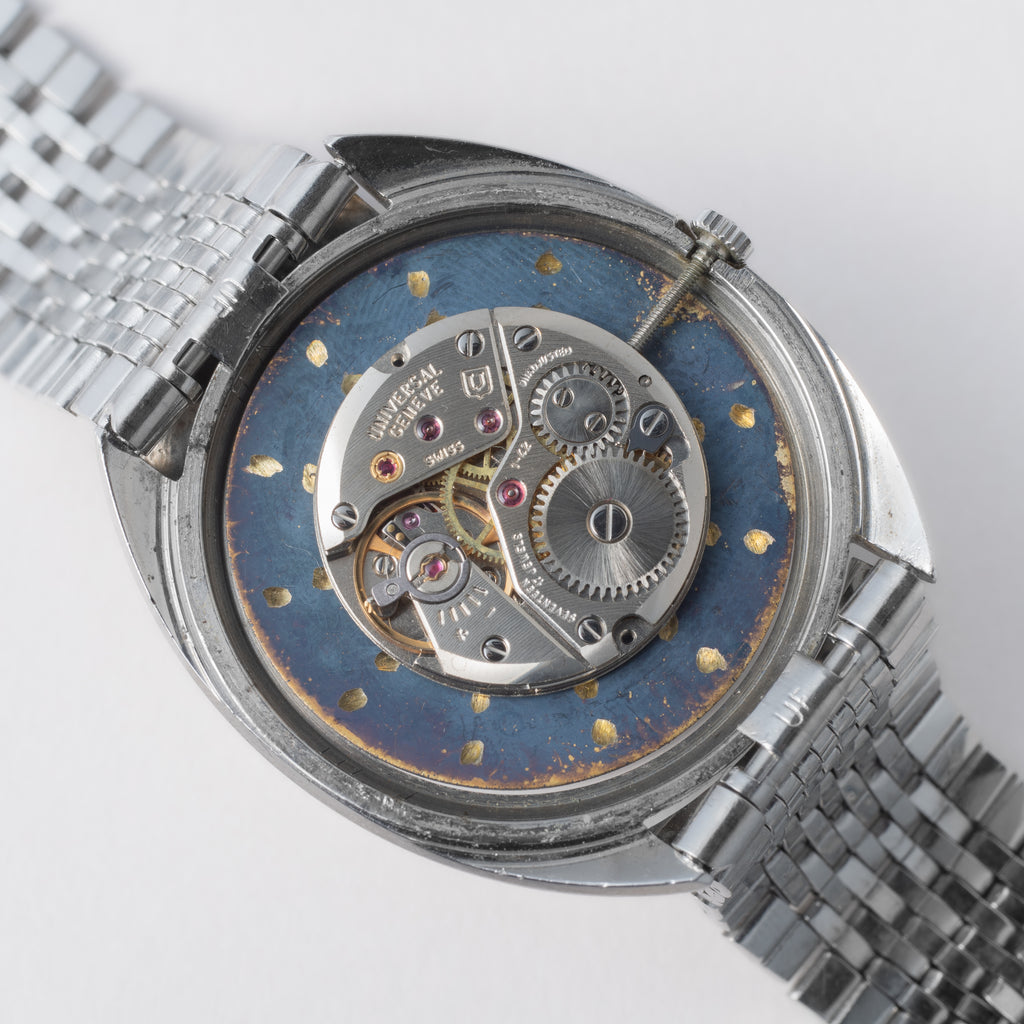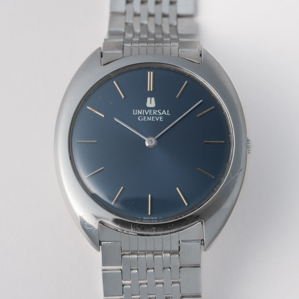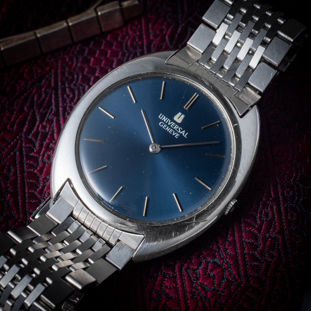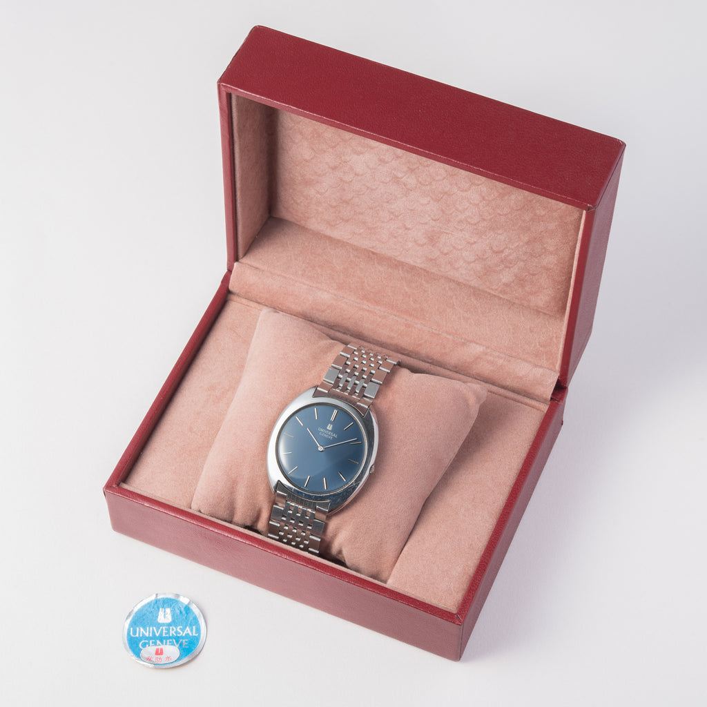ユニバーサルジュネーブ 1970年代製 手巻き トノー型 ブルーダイヤル 純正ゲイフレアーブレス 箱付き