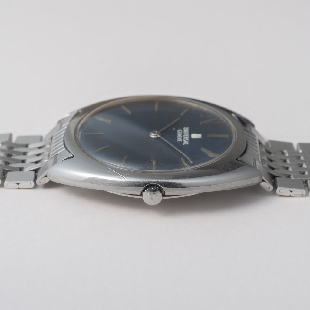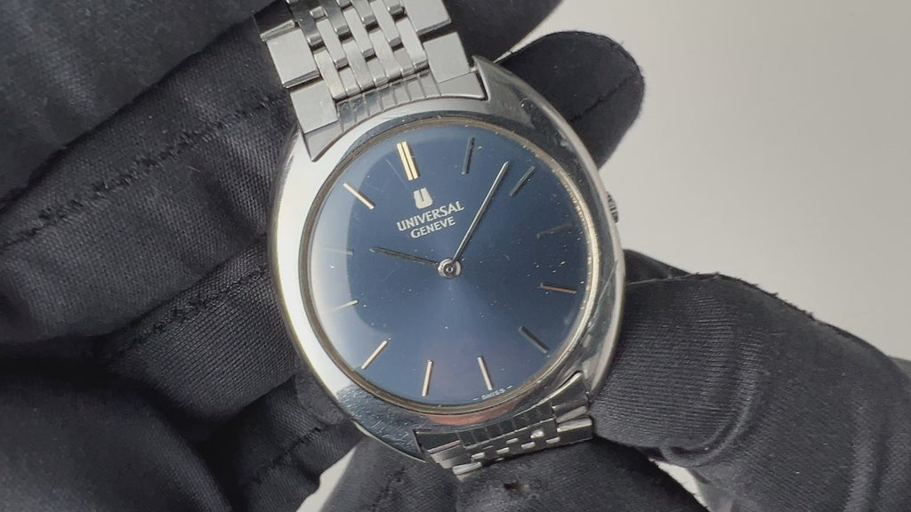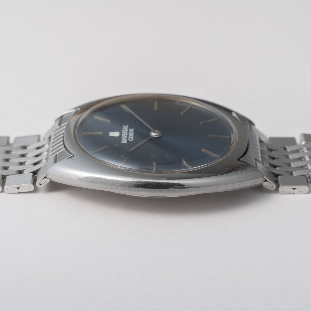 1970年代のユニバーサルジュネーブ 手巻き トノー型 ブルーダイヤル 純正ゲイフレアーブレス 箱付きです。トノー型のケースは厚さ約7㎜の薄型で品のある時計です。鮮やかなブルーのダイヤルは目立つ傷の無い綺麗な状態です。ムーブメントは手巻きのCal.1-42を搭載。ケースは小傷が見られますが大きなダメージはありません。手巻きや針回しの操作はスムースです。ブレスは純正のゲイフレアー社製ステンレスブレスが付いています。付属品として純正の箱が付いています。こちらの時計は分解掃除済みです。