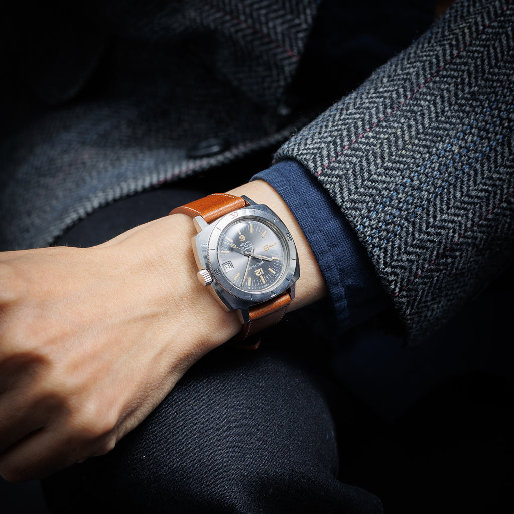 ウォルサム ダイバーズウオッチ クッションケース 1960年代製 自動巻 Cal.ETA2472搭載モデルです。クッションケースに回転ベゼルを装備した1960年代のダイバーズウオッチです。ダイヤルはサンレイ仕上げのグレーダイヤルで、多少経年はありますがダイバーズウォッチとしてはまずまずのコンディションです。ケースも小傷やあたりは若干ありますが自然なフォルムを維持しています。手巻きや針回しはスムーズです。ベルトはファイアーキッズオリジナルのブッテーロカーフレザーを合わせています。こちらは分解掃除済みです。